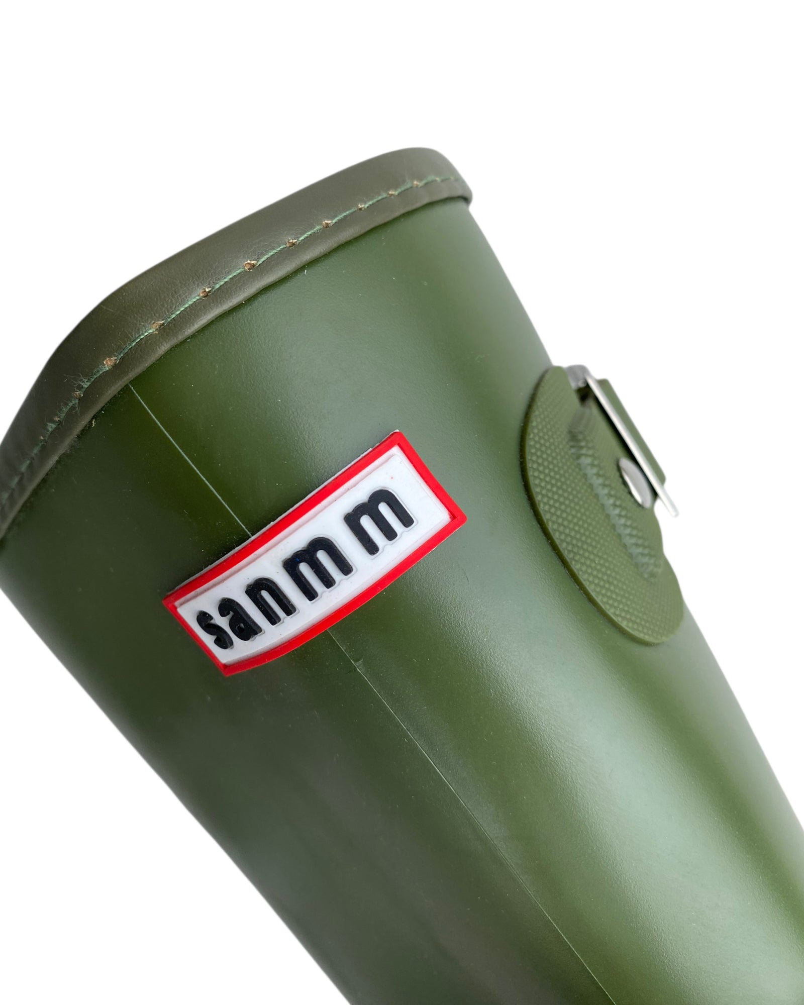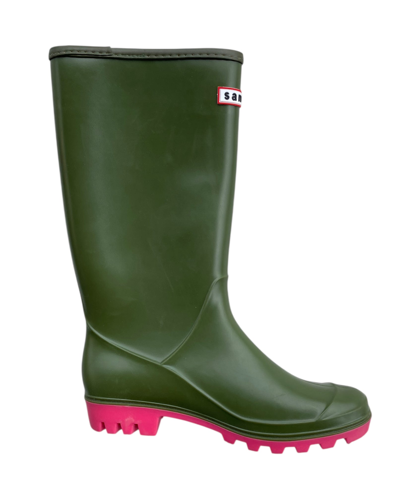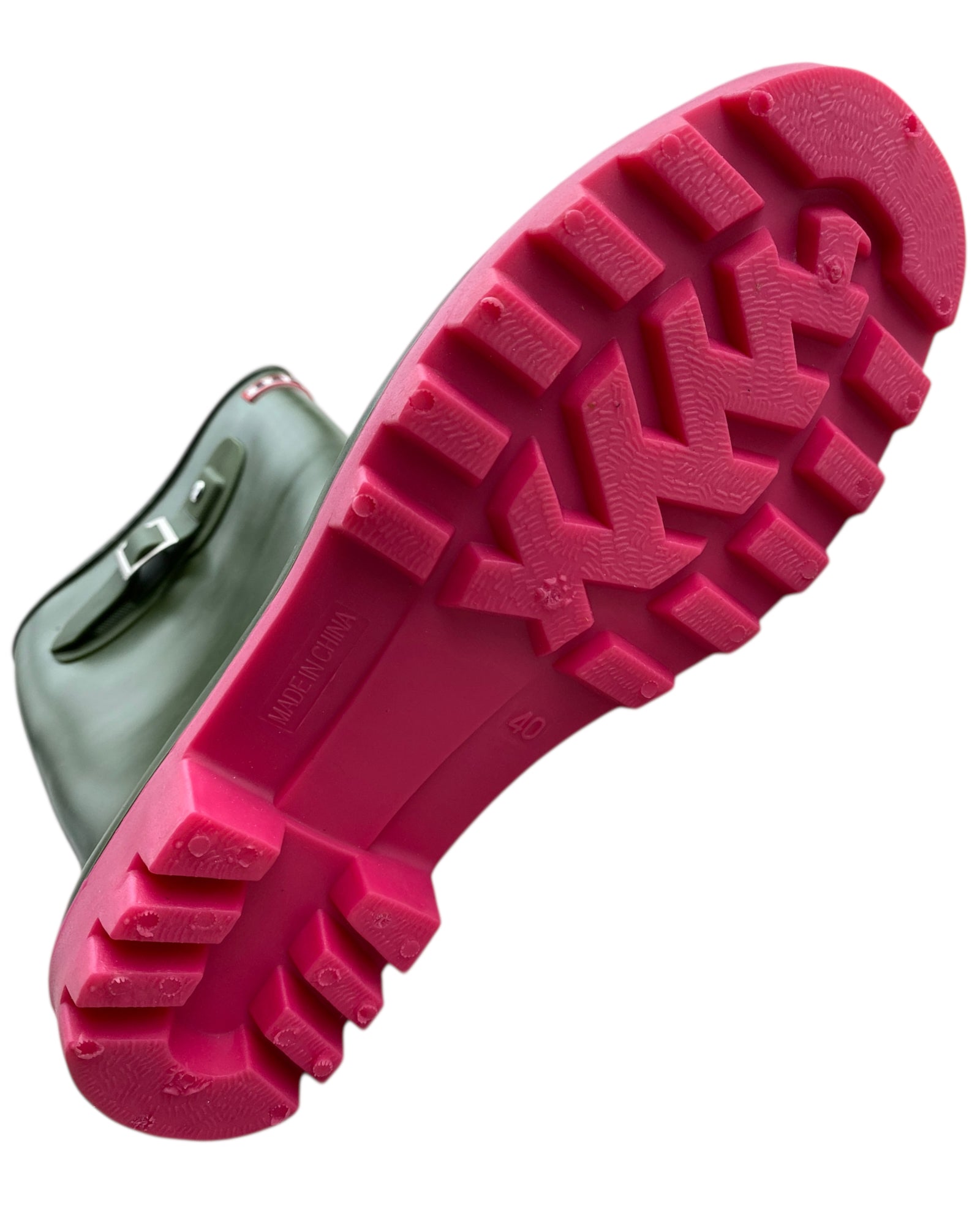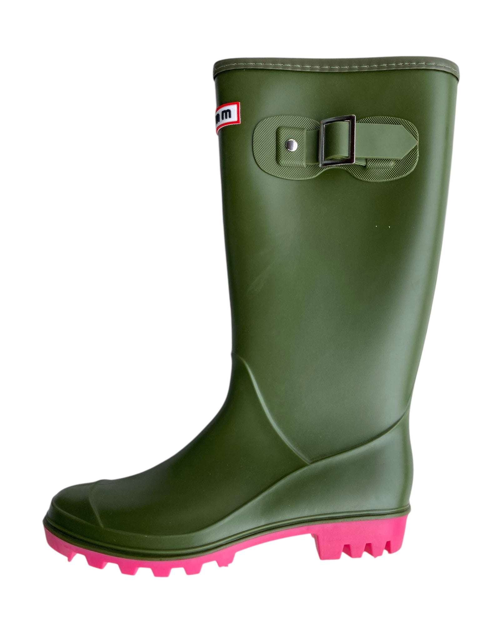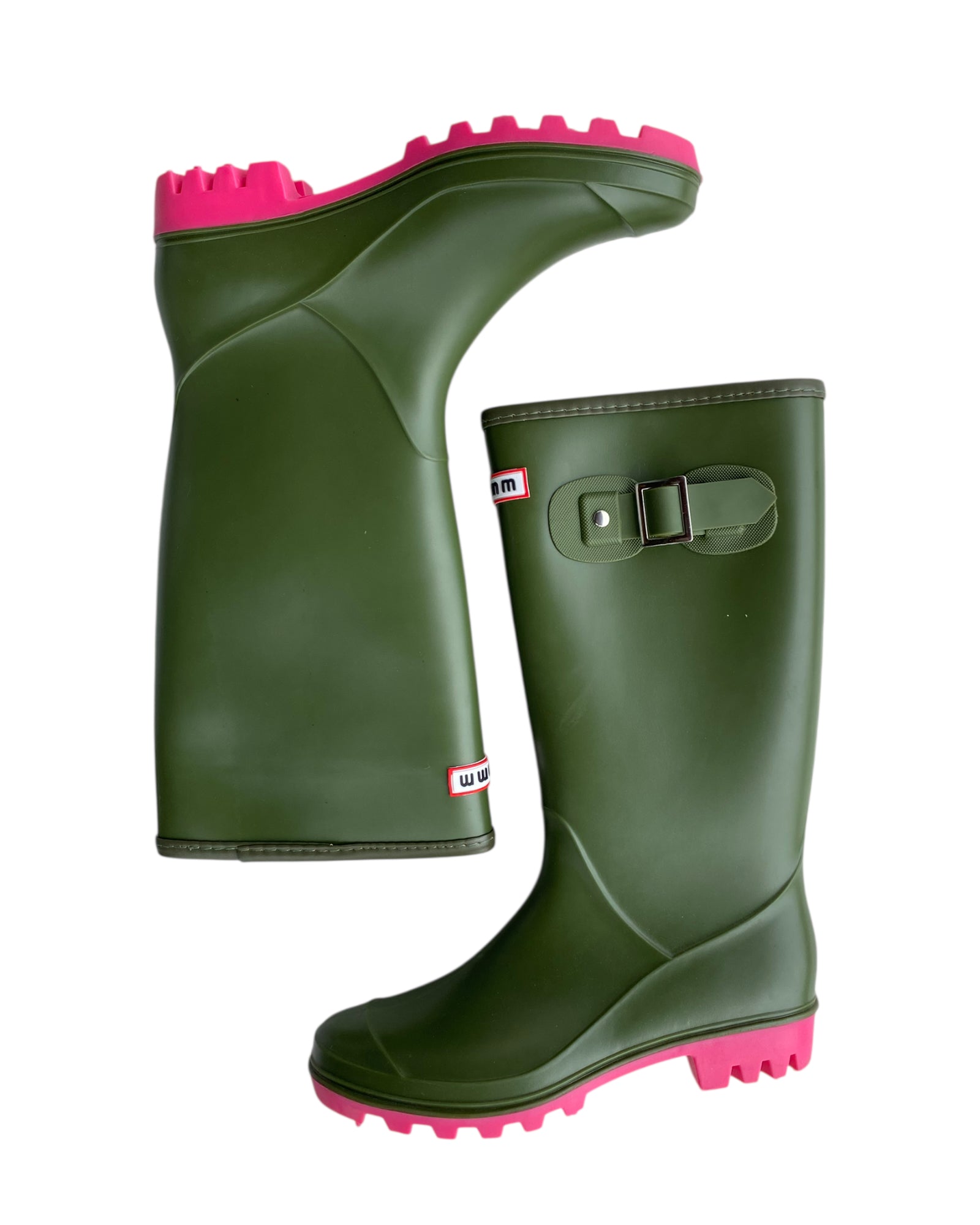 BOTAS TALLA 40 VERDE MILITAR CON SUELA ROSA PARA LA LLUVIA, MARCA POR DELANTE EN BLANCO, NEGRO Y ROJO, A LA PANTORRILLA, SIN CIERRES. EN PERFECTO ESTADO, SIN USAR.