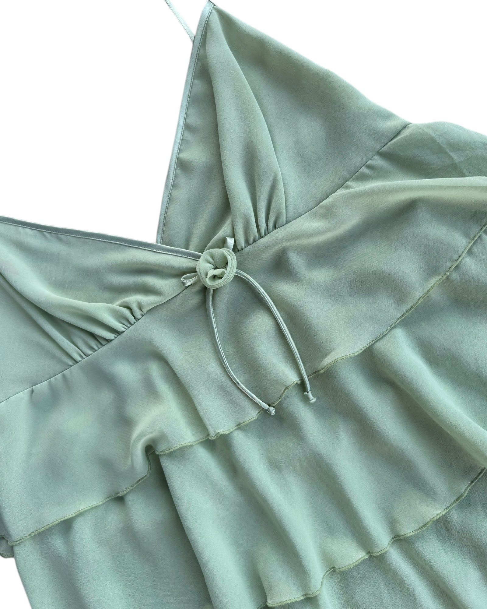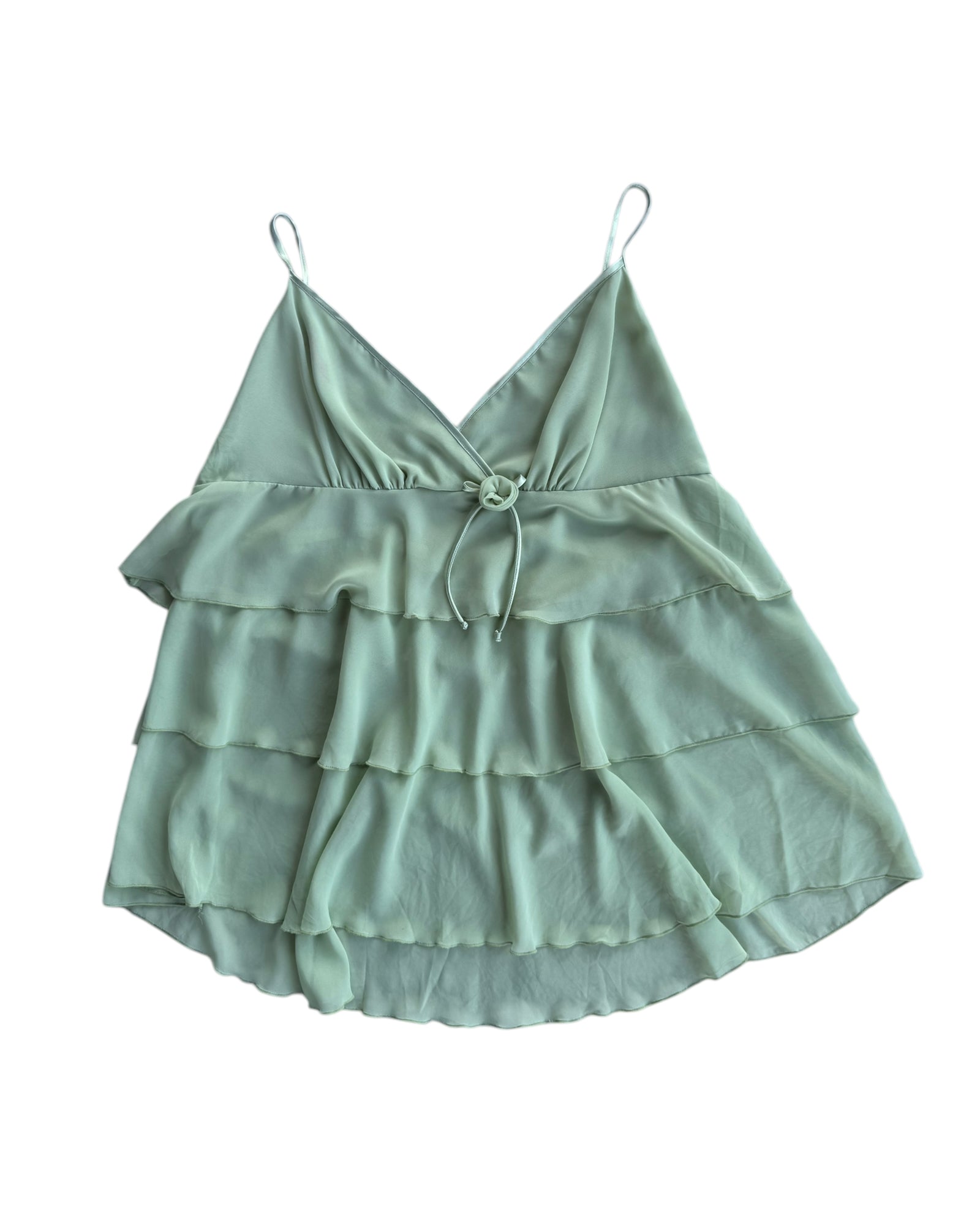 TOP EN CUELLO V CRUZADO VERDE MENTA DE MESH CON RUFLES Y DETALLE DE ROSA EN EL PECHO, TIRANTES AJUSTABLES Y DELGADOS, NO TIENE DETALLES, 100% POLYESTER