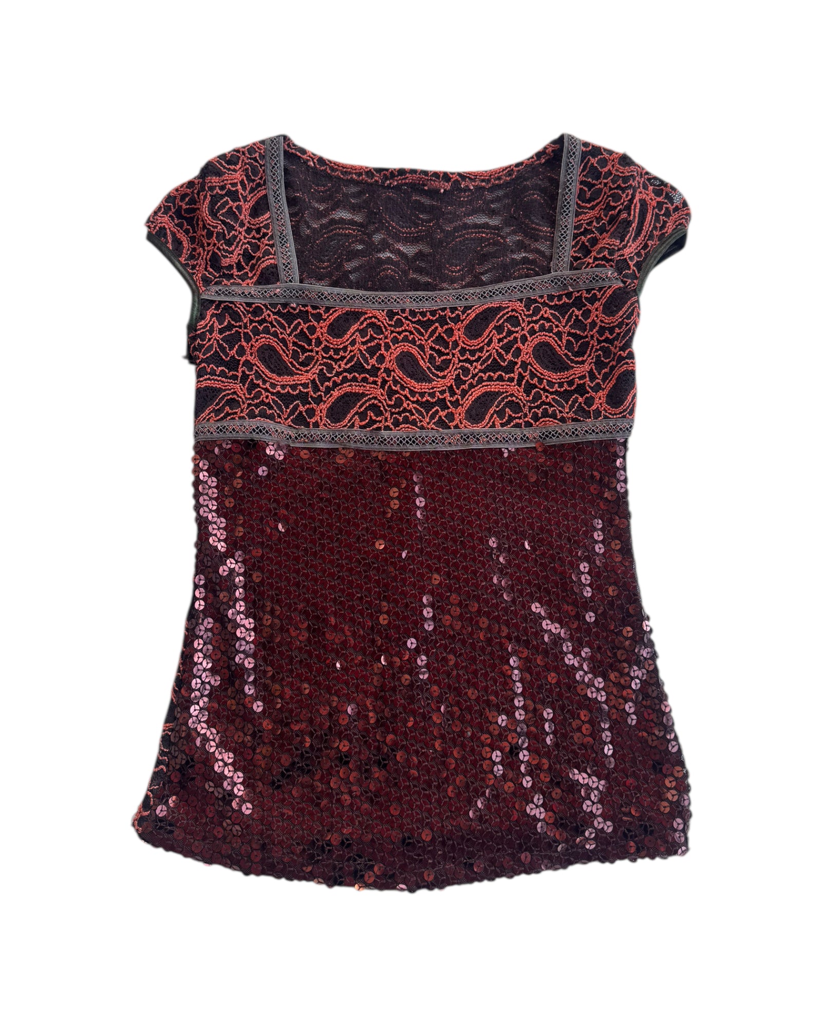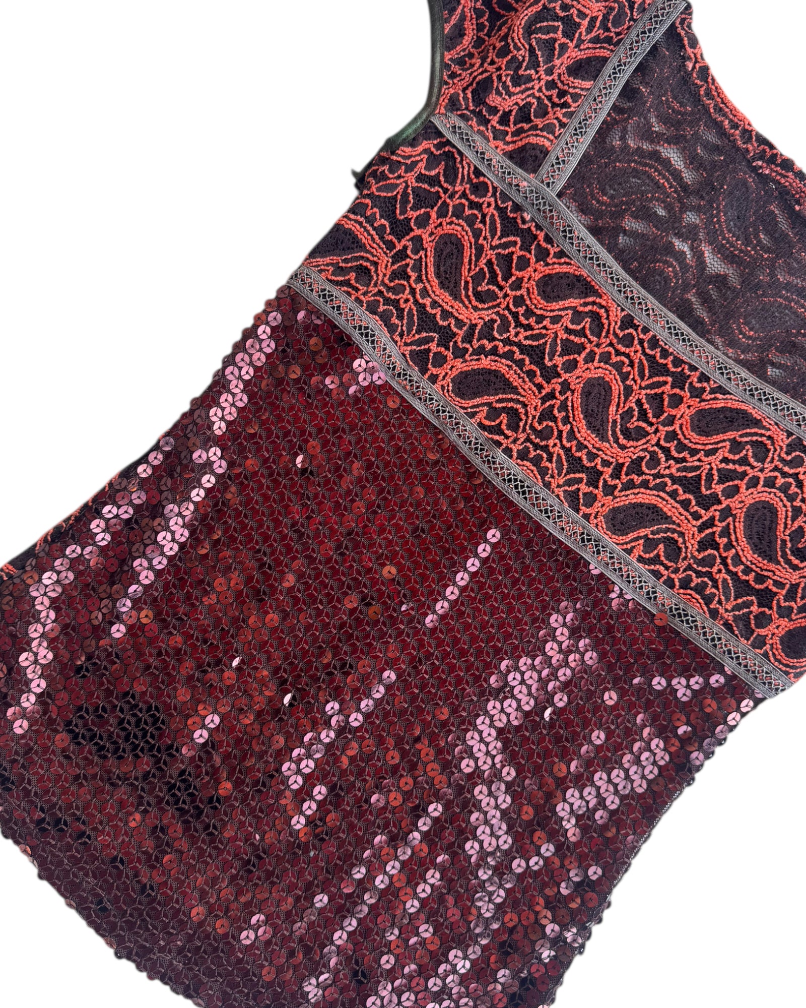 TOP EN COLORES NARANJA, VERDE MILITAR, NEGRO Y VINO CON ENCAJE DE PATRÓN DE MÁNDALAS Y BANDA DEL BUSTO PARA ABAJO DE LENTEJUELAS COLOR VINO. NO TIENE DETALLES, EN PERFECTO ESTADO.
