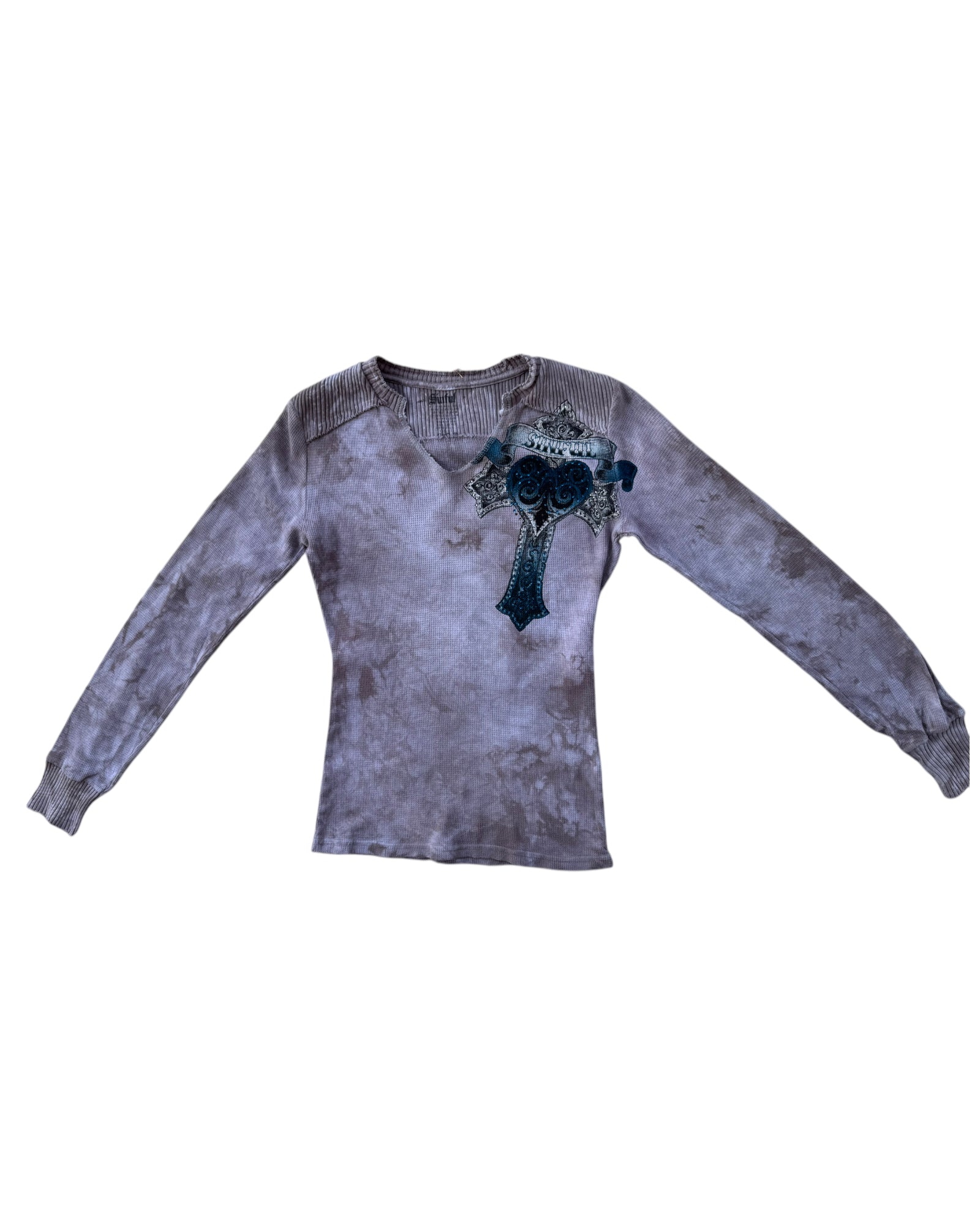 PLAYERA TERMAL CON CUELLO EN LIGERO V 100% ALGODON CON PRINT DE CRUZ AL FRENTE Y PRINT DE CRUS CON CORAZON Y ALAS EN TONOS AZUL Y GRIS EN LA PARTE DE ATRAS. NO DETALLES DE USO.