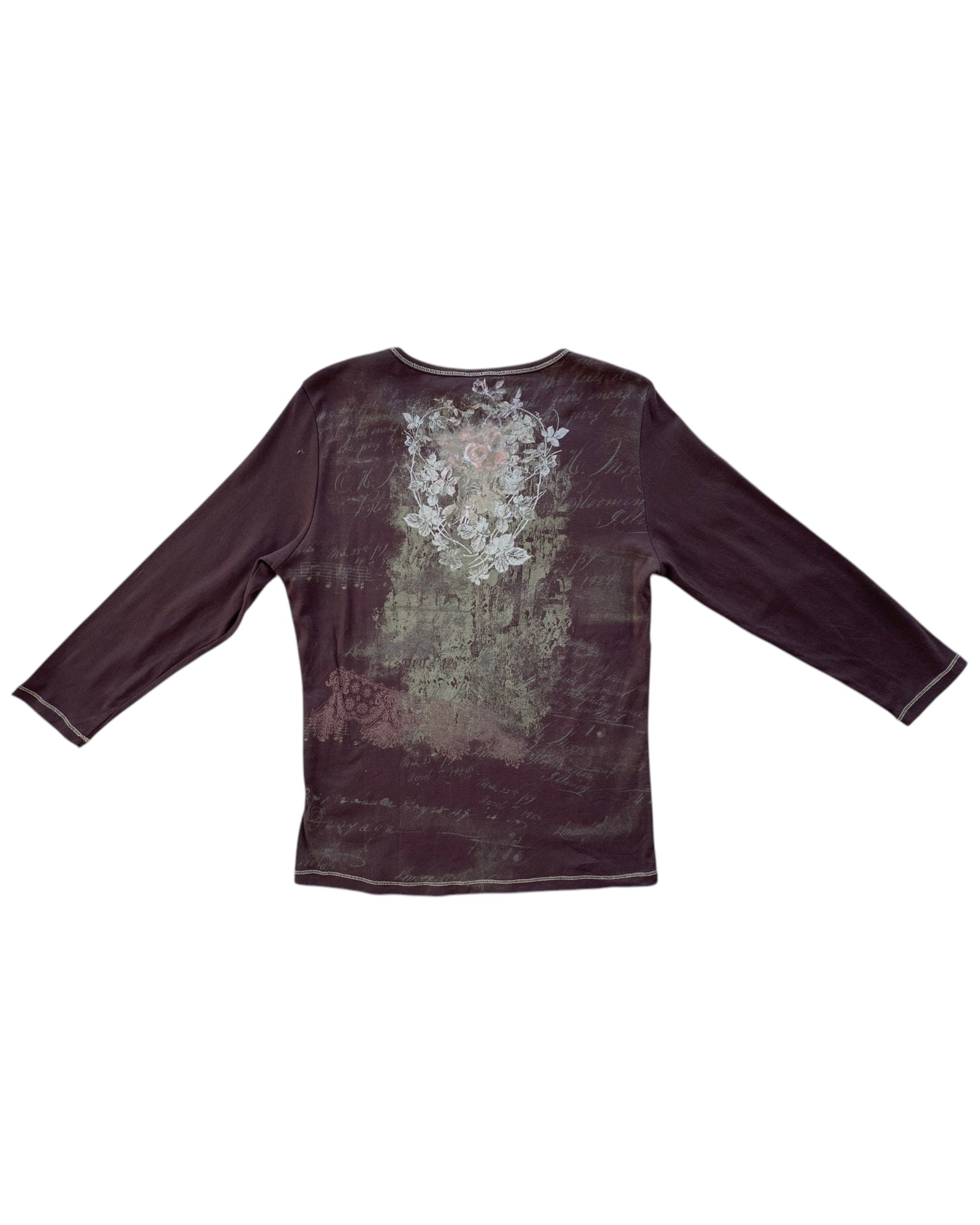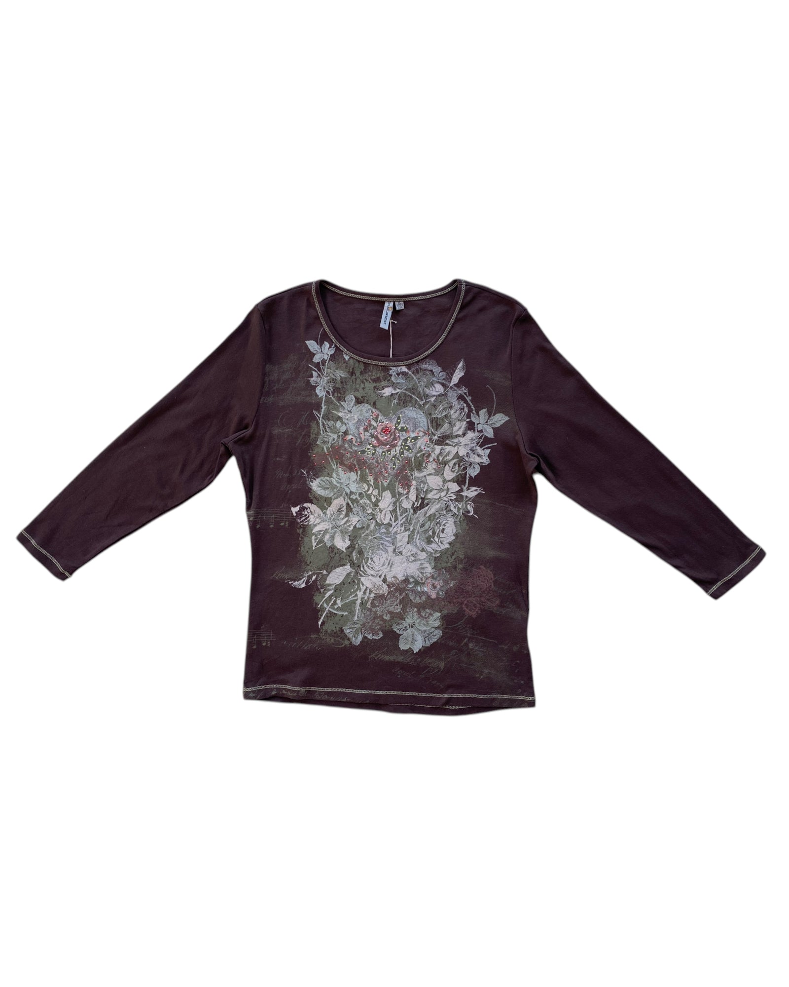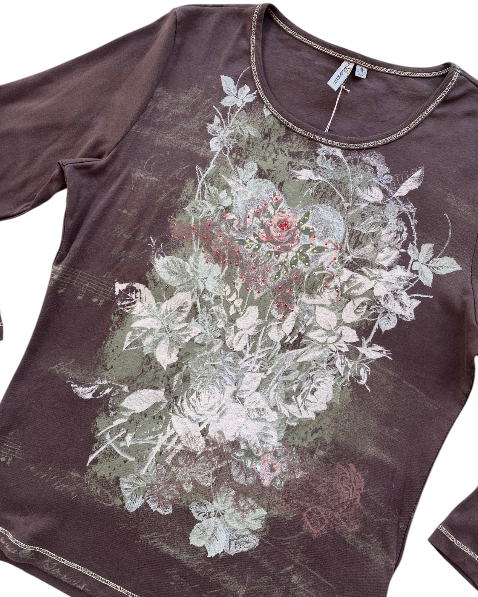 PLAYERA MANGA TRES CUARTOS CAFE OSCURO CON PRINT DE CORAZON Y ROSA CON MUCHAS HOJAS EN EL CENTRO Y LIGEROS BRILLOS PEGADOS. 100% ALGODÓN. SIN DETALLES DE USO.