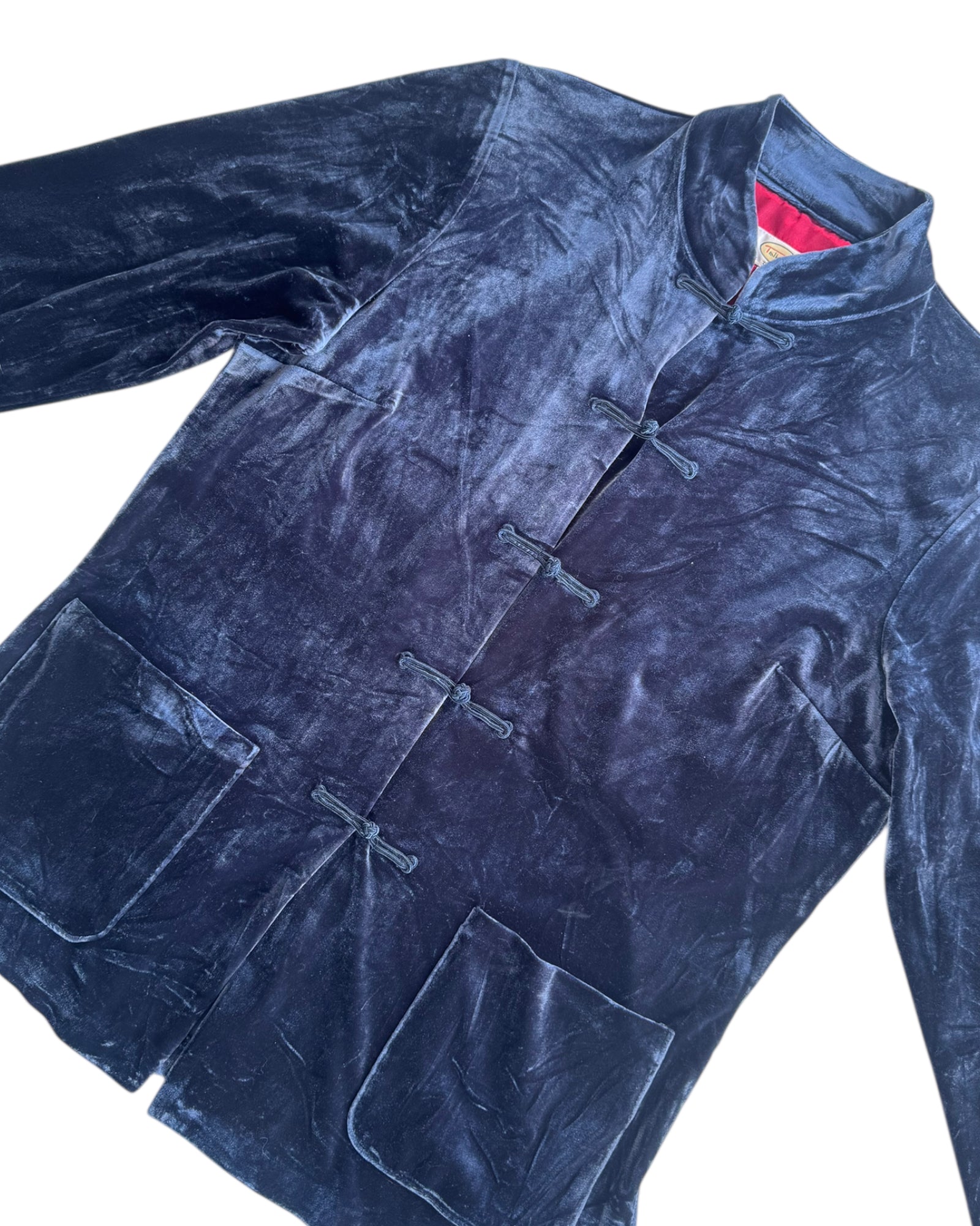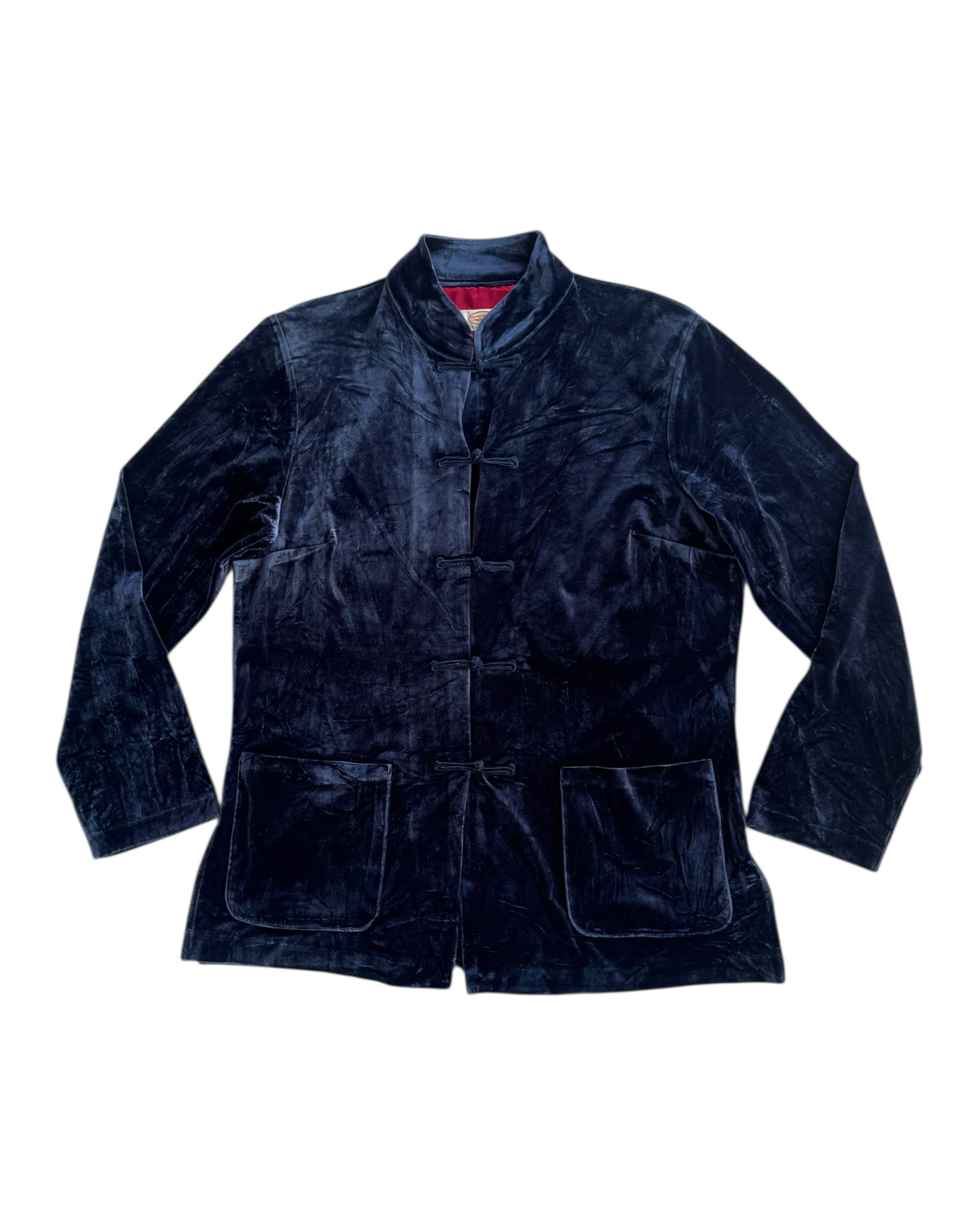 CAMISA AZUL MARINO DE TERCIOPELO CON FORRO EN COLOR ROJO ESTILO SATINADO Y BOTONES ESTILO ASIATICO, DOS BOLSILLOS EN LA PARTE DE ABAJO FUNCIONALES, NO TIENE DETALLES, EN PERFECTO ESTADO.