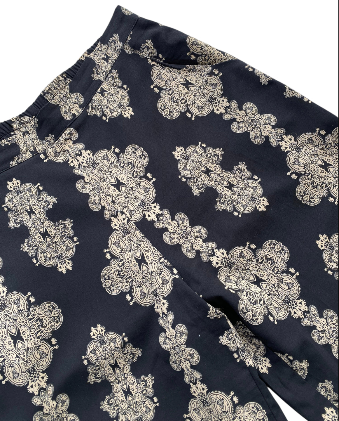 PANTALONES CON ELASTICO EN LA CINTURA DE COLOR NEGRO CON PRINT DE MANDALAS EN COLOR BEIGE, TIENE BOLSILLOS EN AMBOS LADOS. NO TIENE DETALLES, EN PERFECTO ESTADO.