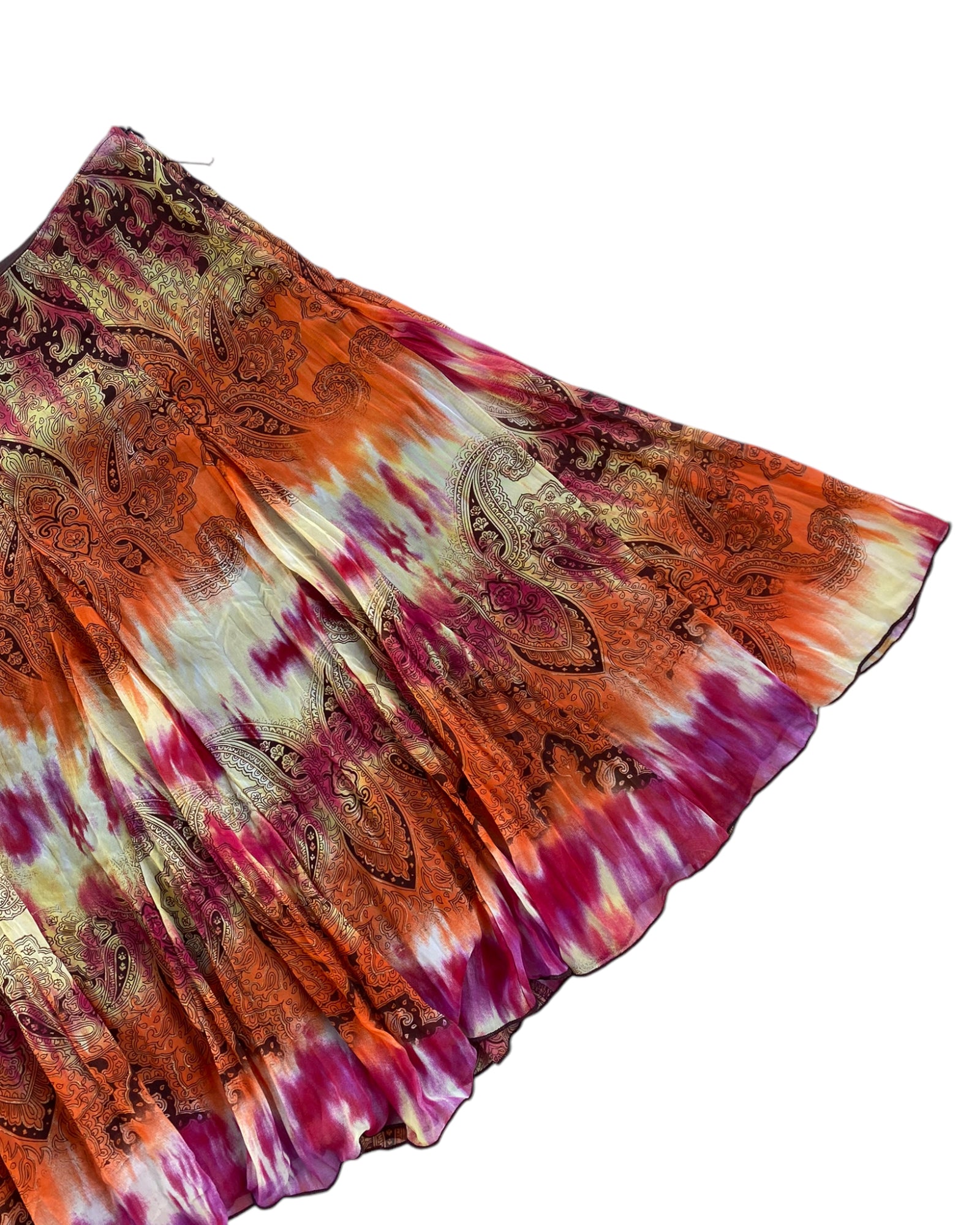FALDA MIDI 100% POLYESTER EN COLORES NARANJA, ROSA, AMARILLO Y CON PRINT DE PAISLEY CAFE. CORTE A CON LIGERO VUELO. SIN DETALLES DE USO.