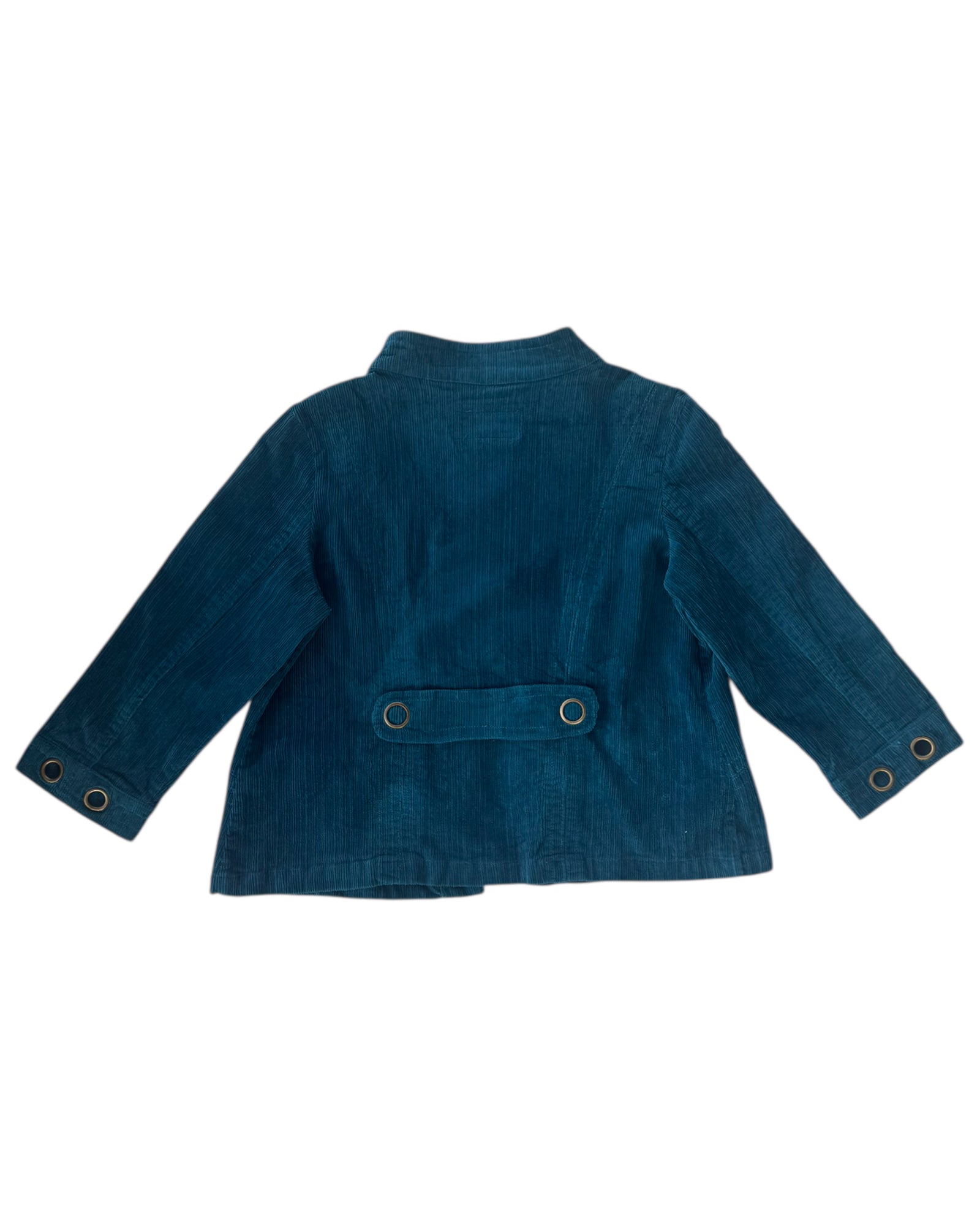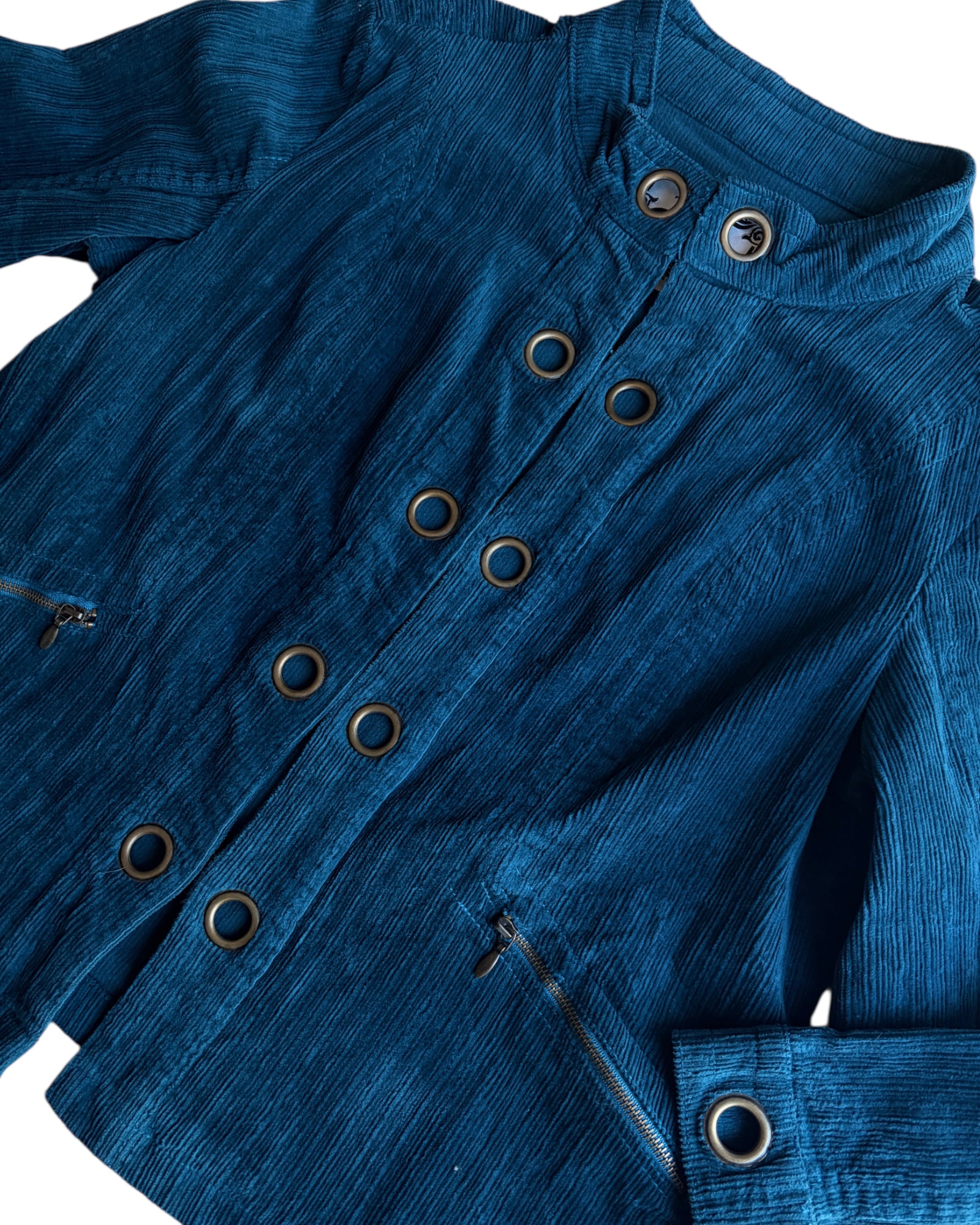 CHAMARRA 98% ALGODÓN Y 2% SPANDEX EN COLOR TURQUESA DE ESTILO PANA CON GRILLETES DORADORAS Y DOS CIERRES EN LA PARTE DELANTERA CON BOLSILLOS FUNCIONALES, NO TRAE BOTONES. NO TIENE DETALLES, EN PERFECTO ESTADO.