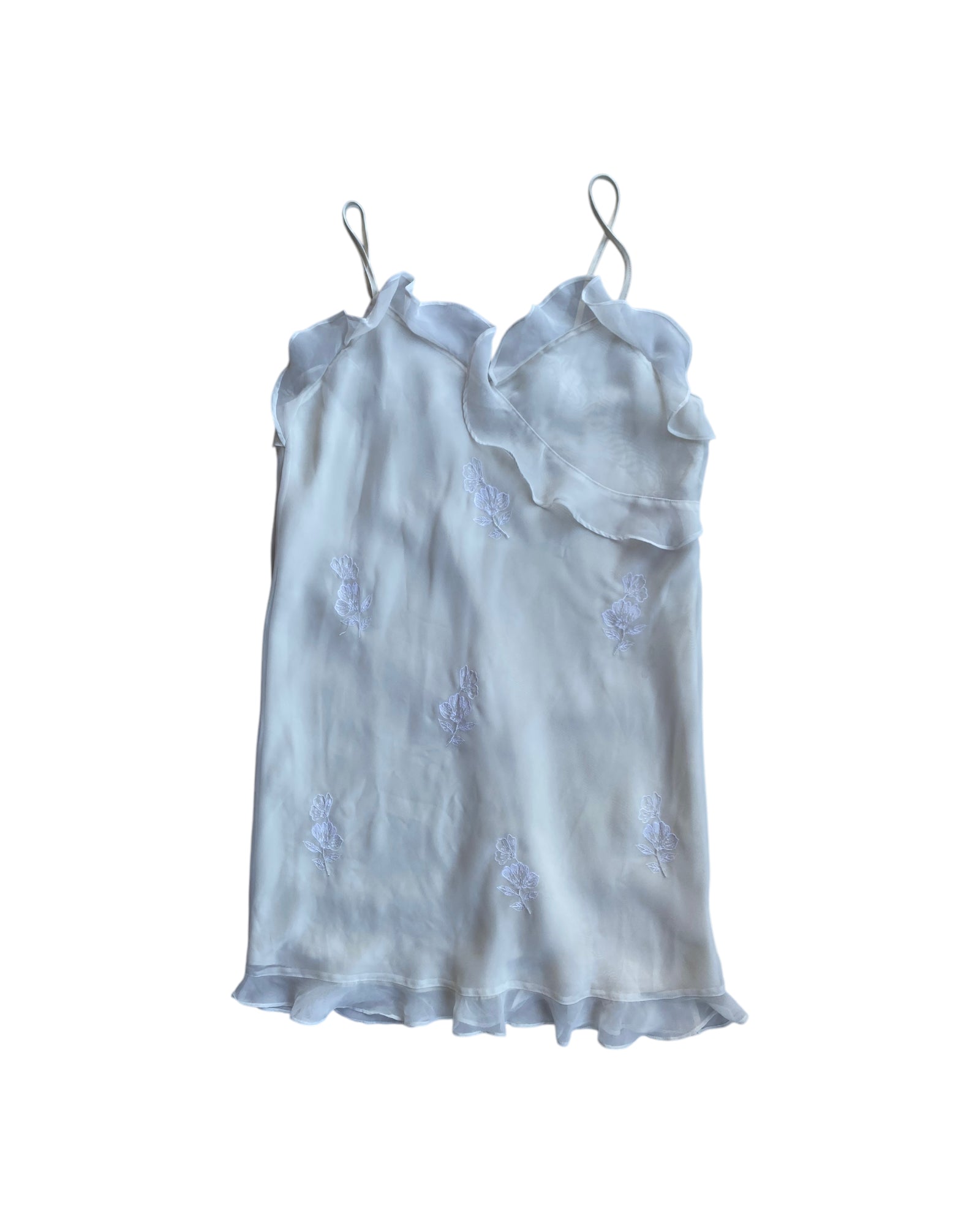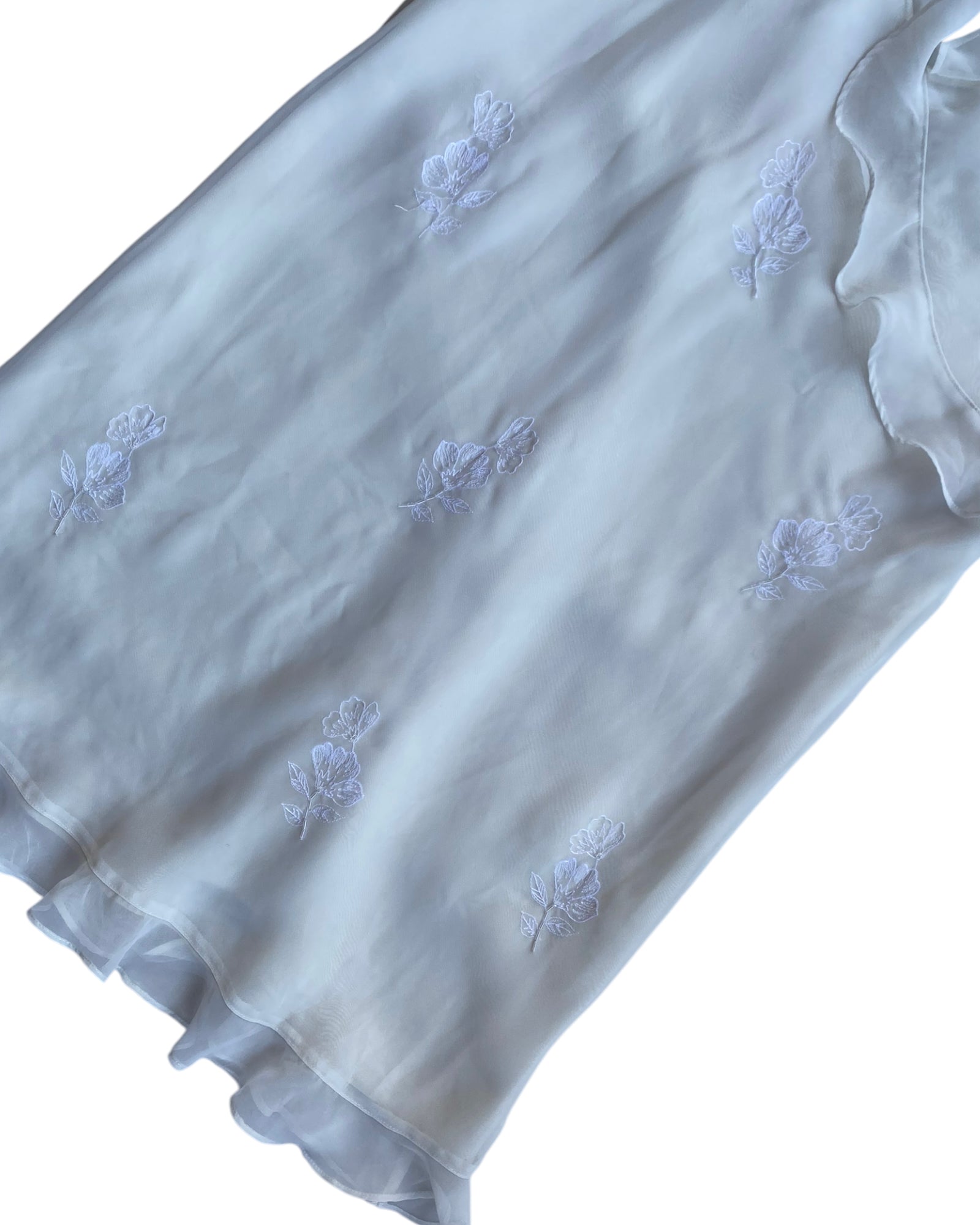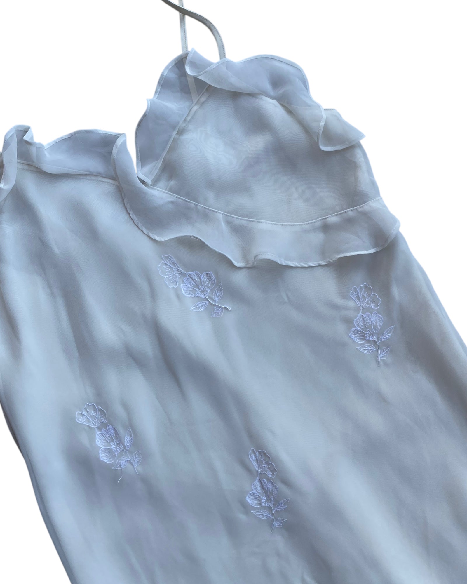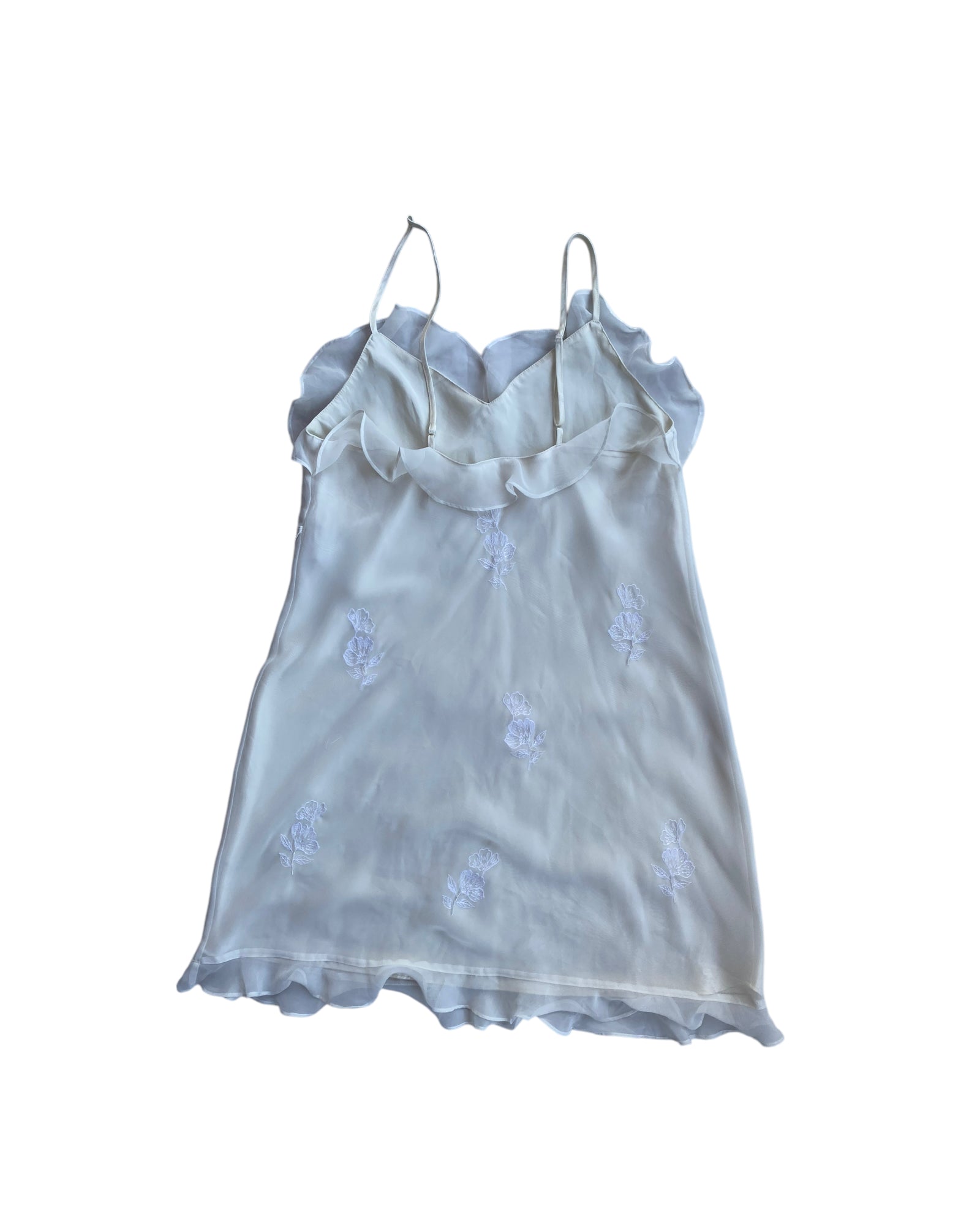 VESTIDO BLANCO CON BORDADOS DE FLORES Y DETALLES DE DOBLADILLO ONDULADO. 100% POLYESTER. COMODO Y FRESCO. NO TIENE DETALLES