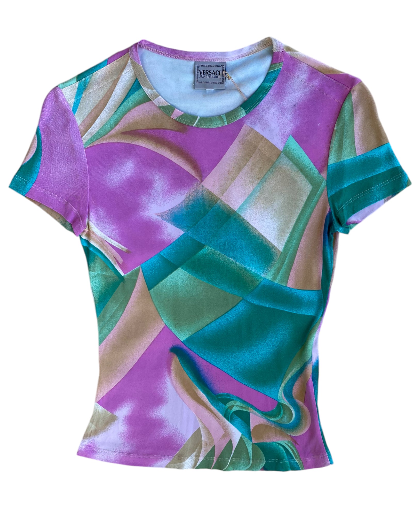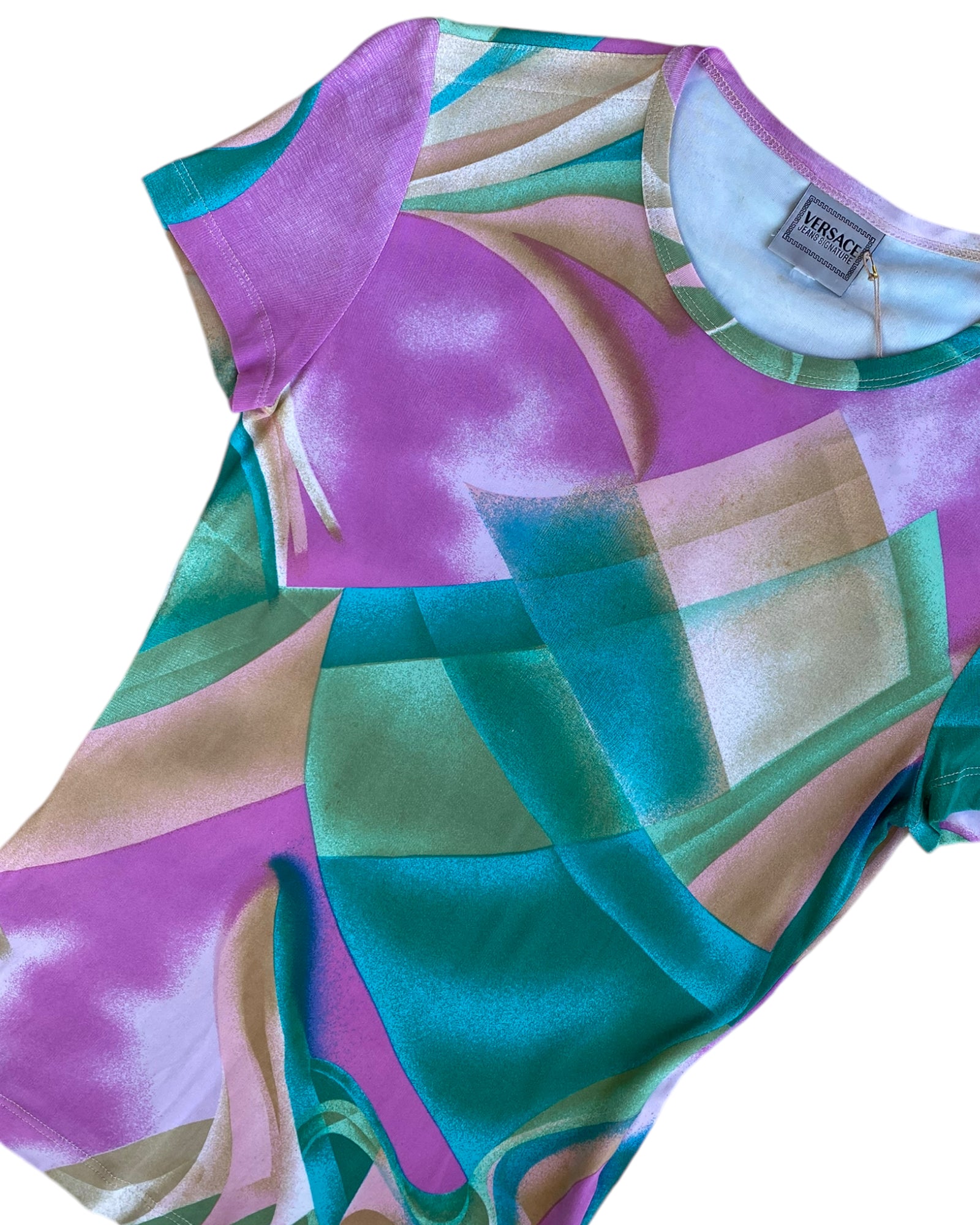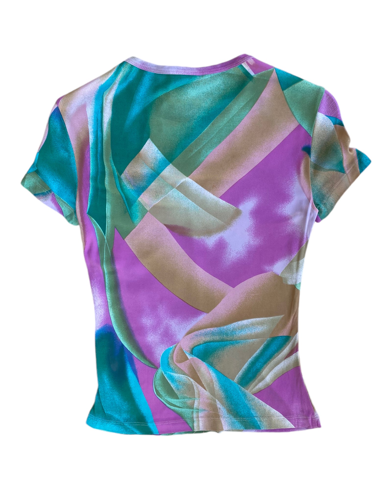 PLAYERA CEÑIDA CON PRINT MULTICLOR (FUCSIA, VERDE AQUA,, CHAMPAÑA) AJUSTADA AL CUERPO. SIN DETALLES DE USO.