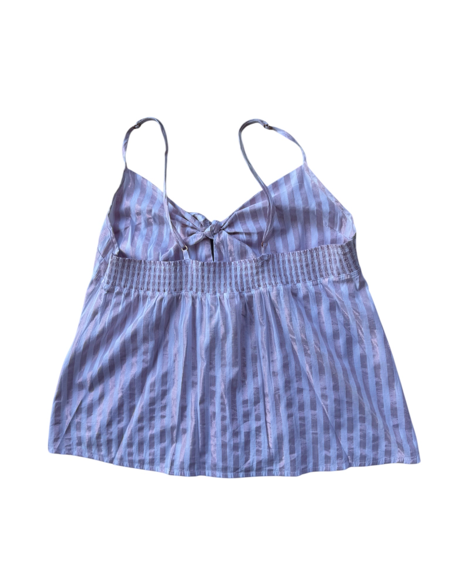 TOP CAMI DE RAYAS VERTICALES BLANCAS Y ROSA CLARO CON LIGERO BRILLO, MOÑO EN EL BUSTO PARA AJUSTAR Y TIRANTES AJUSTABLES. NO TIENE DETALLES DE USO.