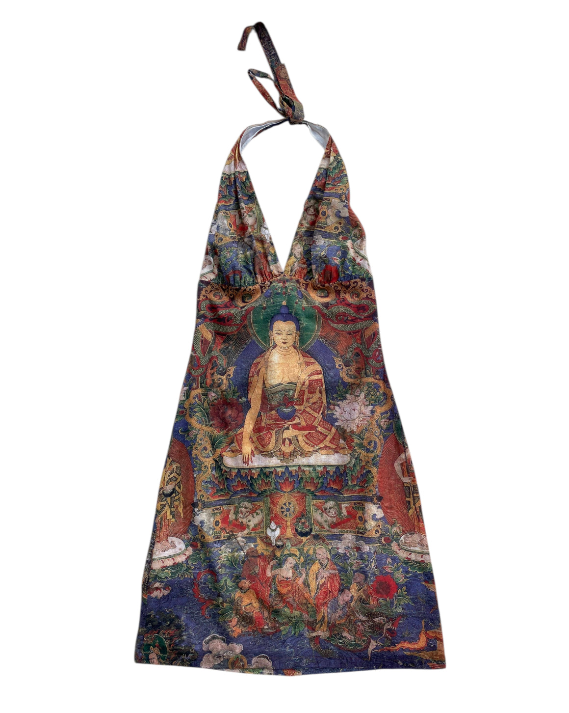 VESTIDO 100% ALGODON CON UN PRINT BELLISIMO, COLORES VIBRANTES EN TODO EL, ESPALDA DESCUBIERTA Y CUELLO ESTILO HALTER, NO TIENE DETALLES, EN PERFECTO ESTADO.