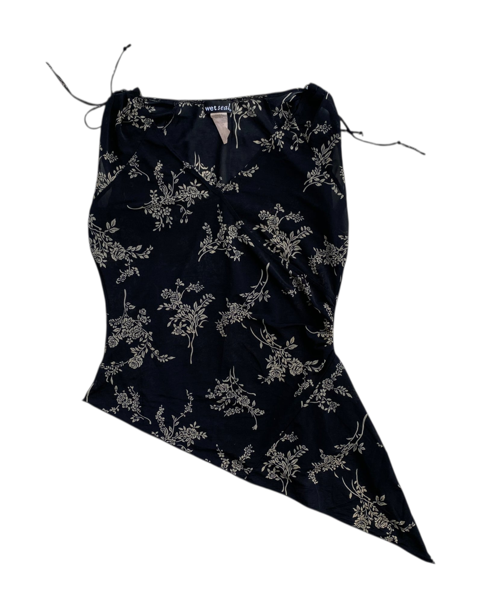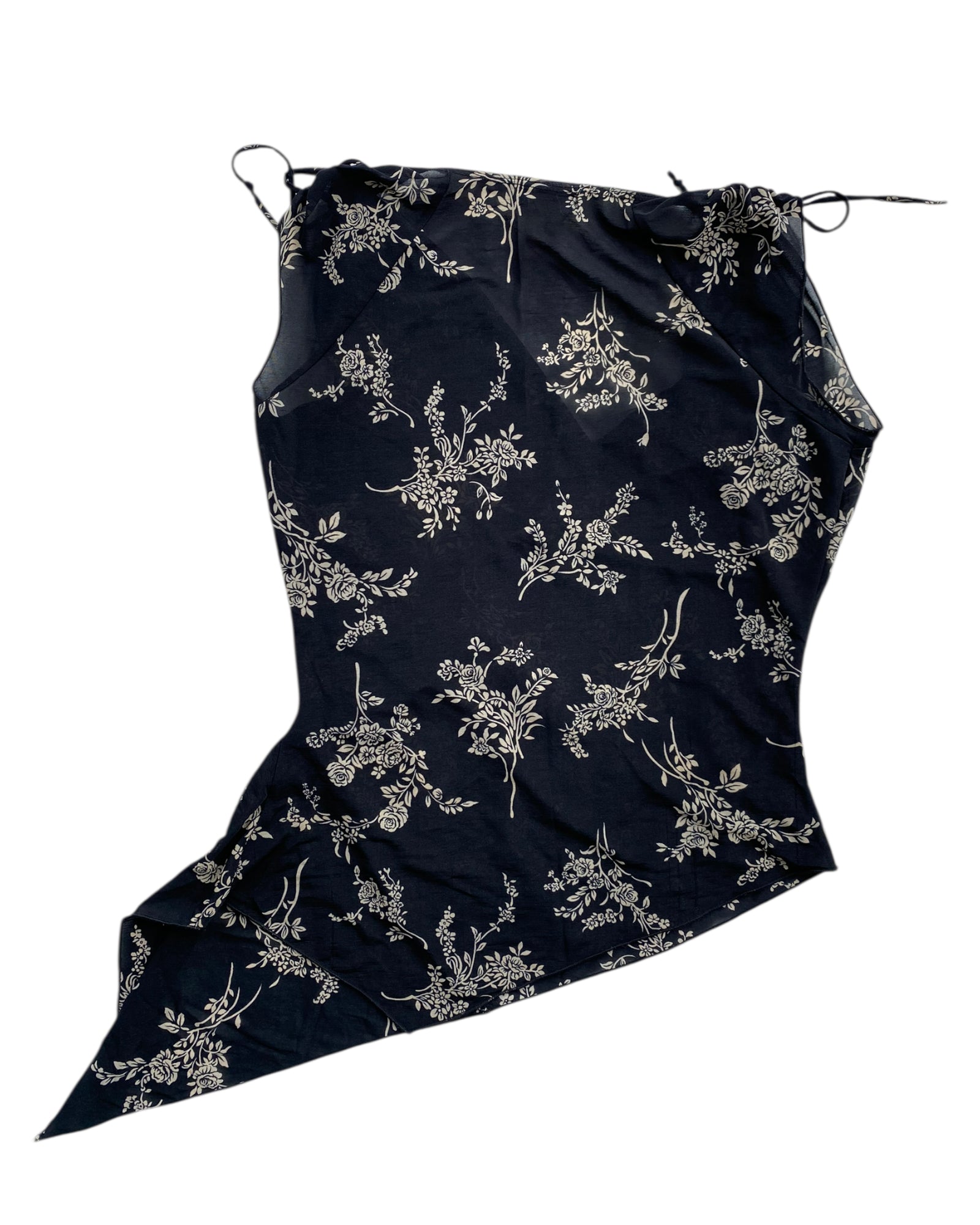 TOP NEGRO DE TELA SEMI- TRANSPARENTE EN NEGRO CON PATRON DE FLORES BLANCAS, LISTONES AJUSTABLES EN LA PARTE DE LOS HOMBROS Y ASIMETRIA DEL LADO IZQUIERDO. 100% NYLON. EN PERFECTO ESTADO.