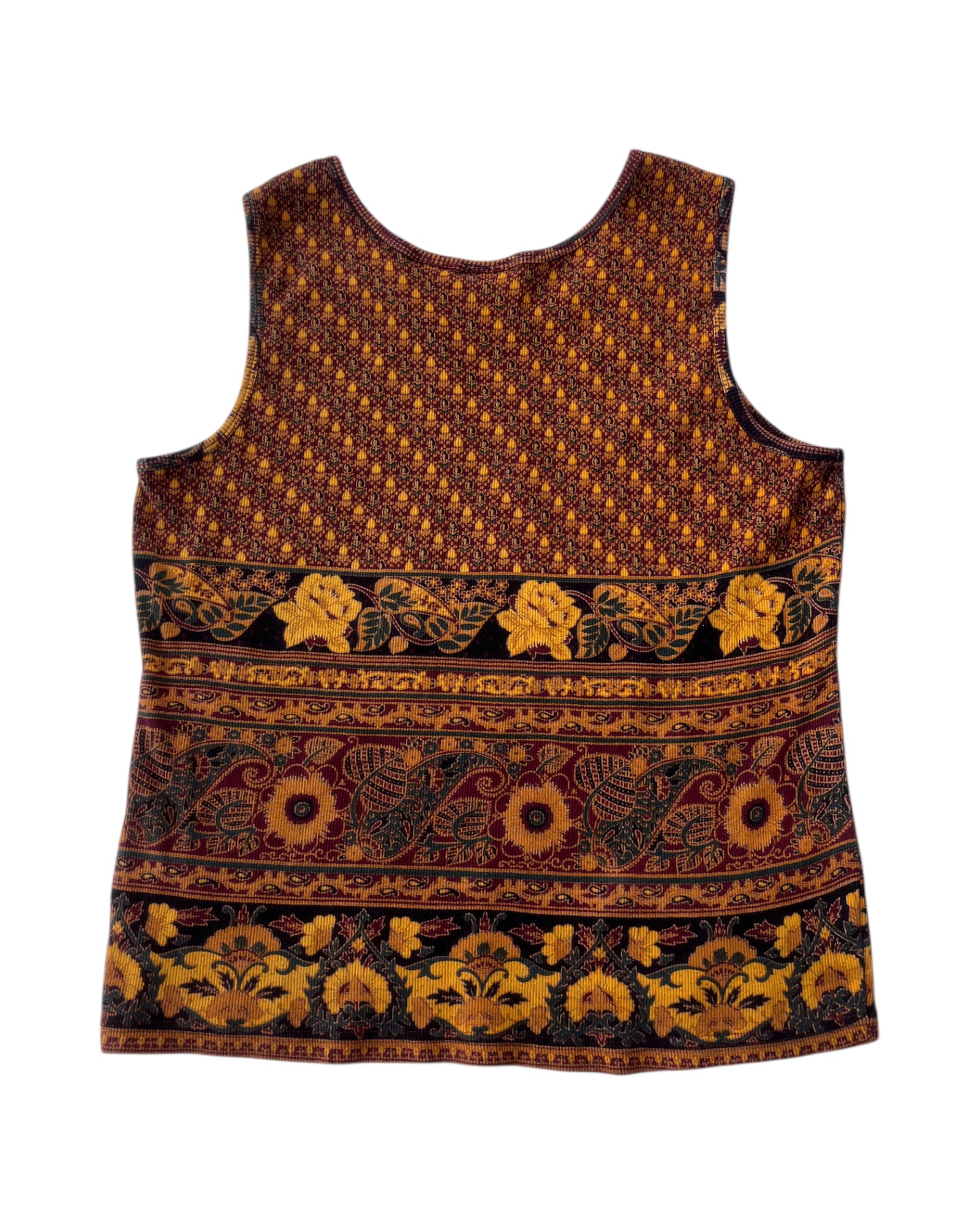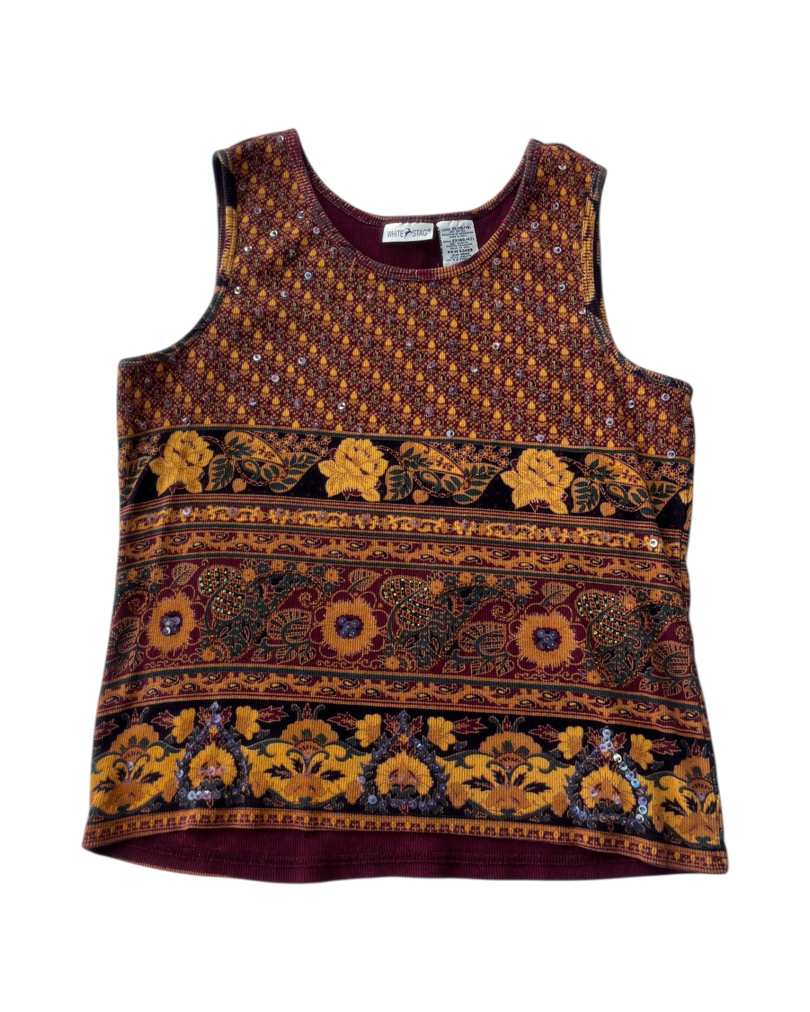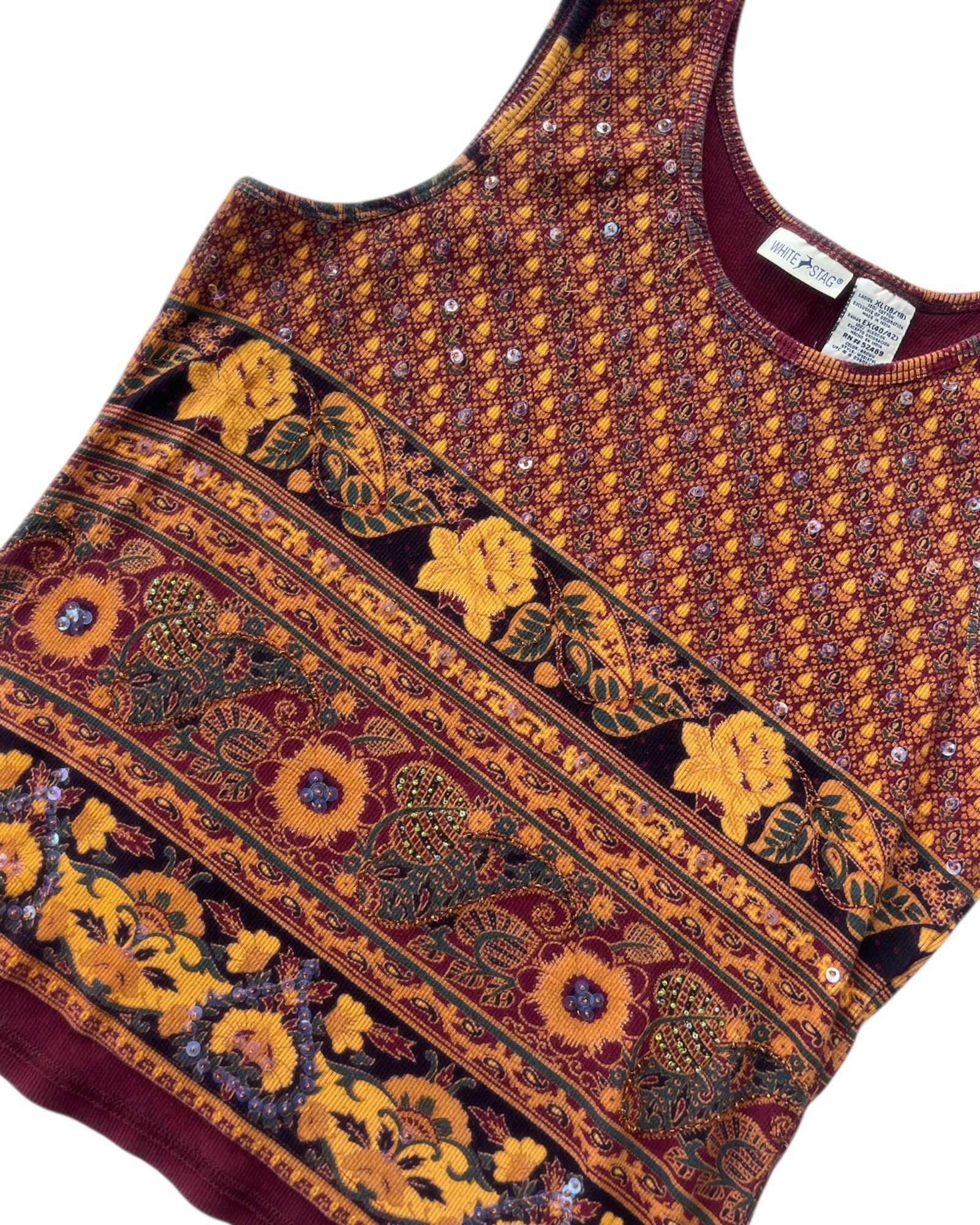 TOP DE TIRANTES GRUESOS CON PRINT INDIO DE FLORES EN COLORES AMARILLO, VERDE Y CAFÉ SOBRE FONDO COLOR VINO, CUENTAS Y LENTEJUELAS BORDADAS, NO TIENE DETALLES, EN PERFECTO ESTADO.