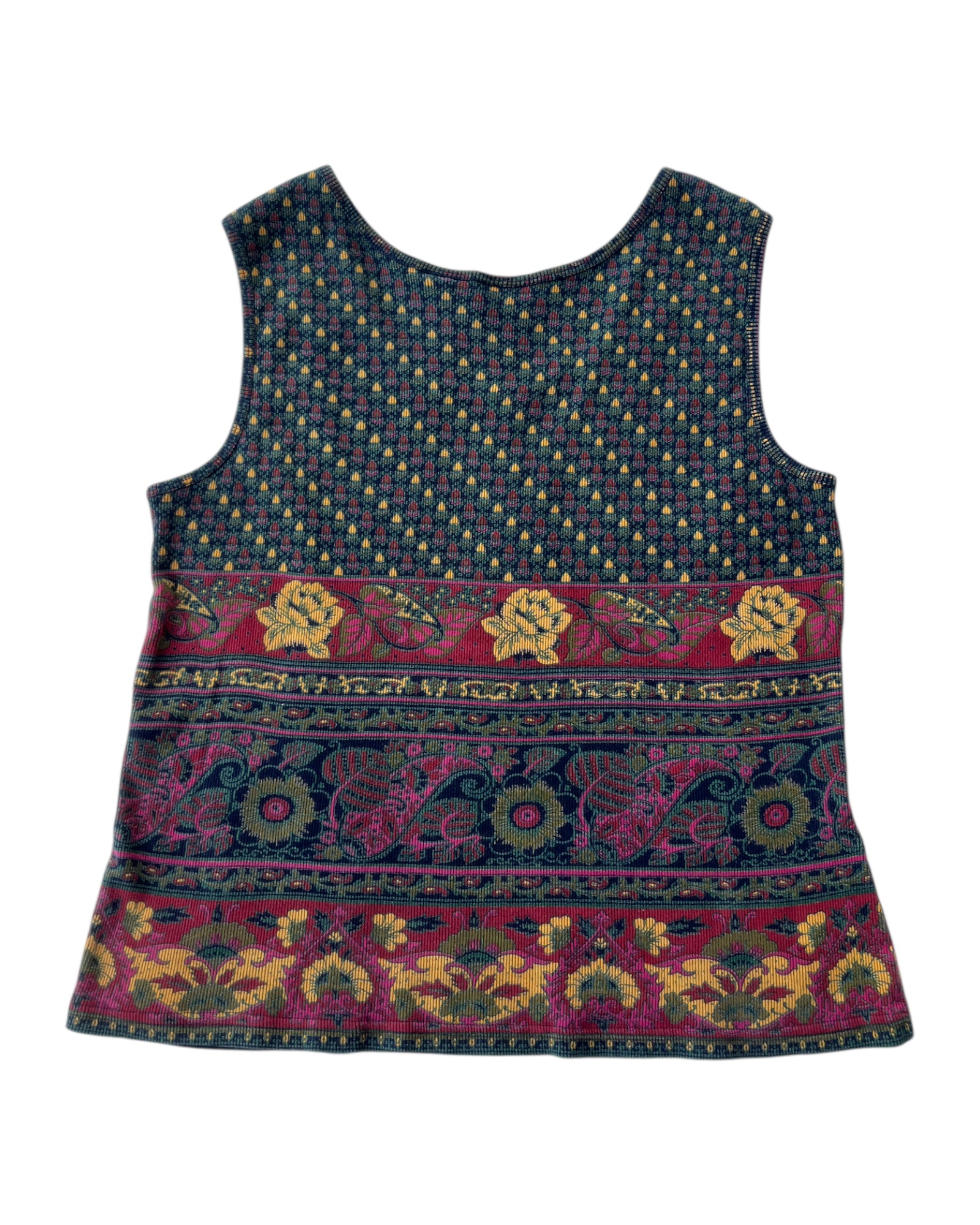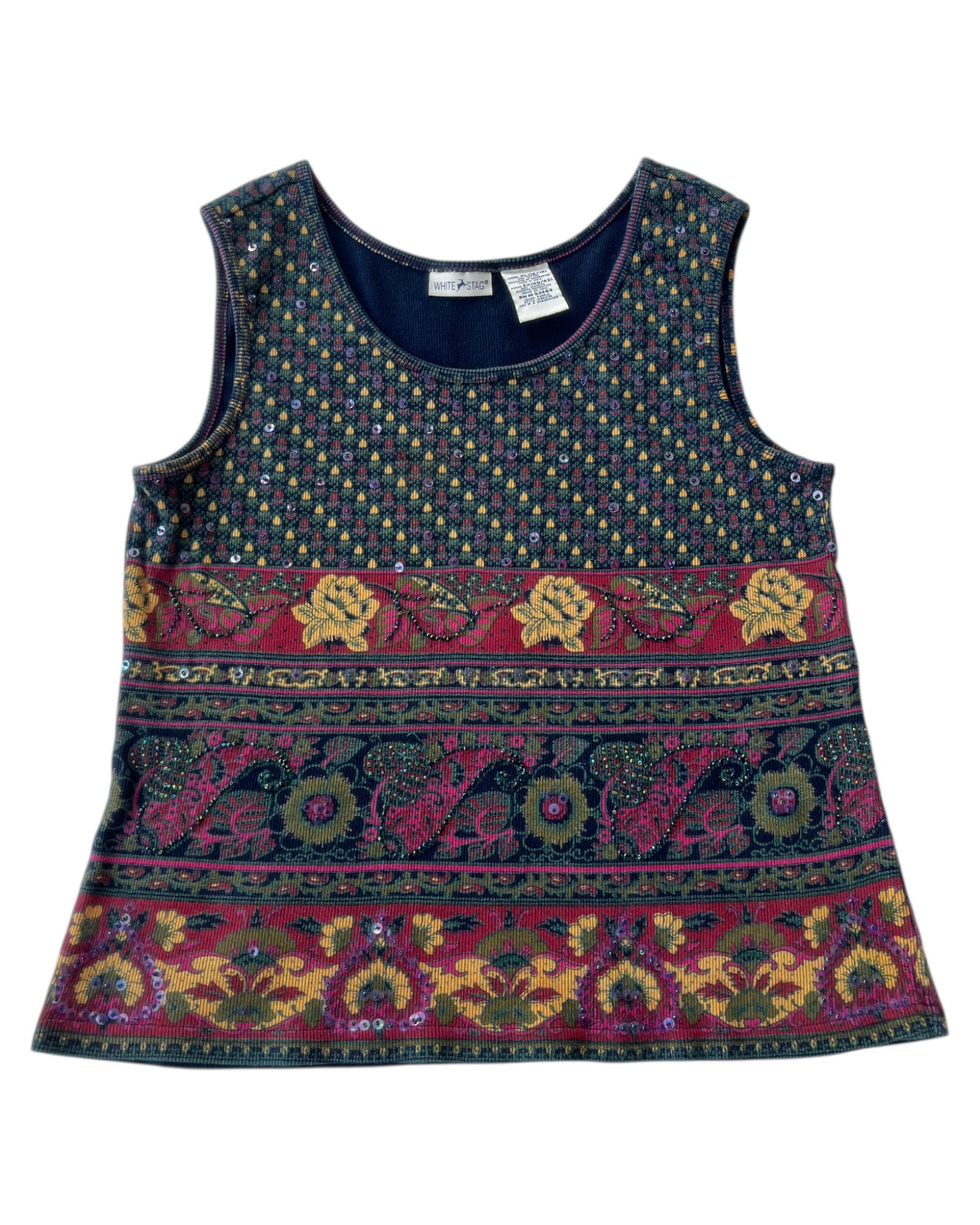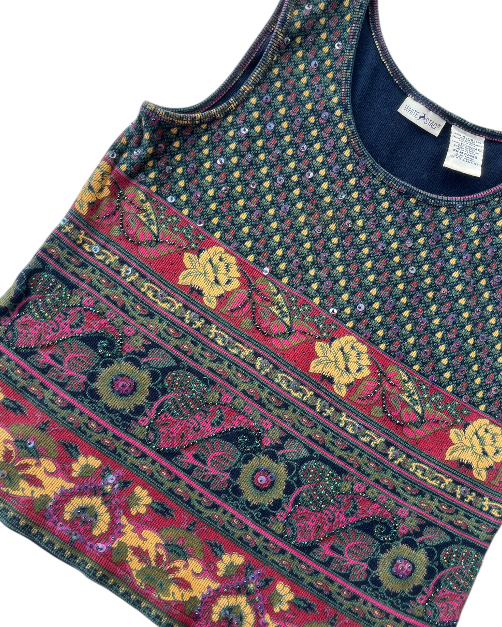 TOP DE TIRANTES GRUESOS CON PRINT INDIO DE FLORES EN COLORES AMARILLO, VINO Y VERDE SOBRE FONDO DE COLOR TURQUESA, CUENTAS Y LENTEJUELAS BORDADAS, NO TIENE DETALLES, EN PERFECTO ESTADO.