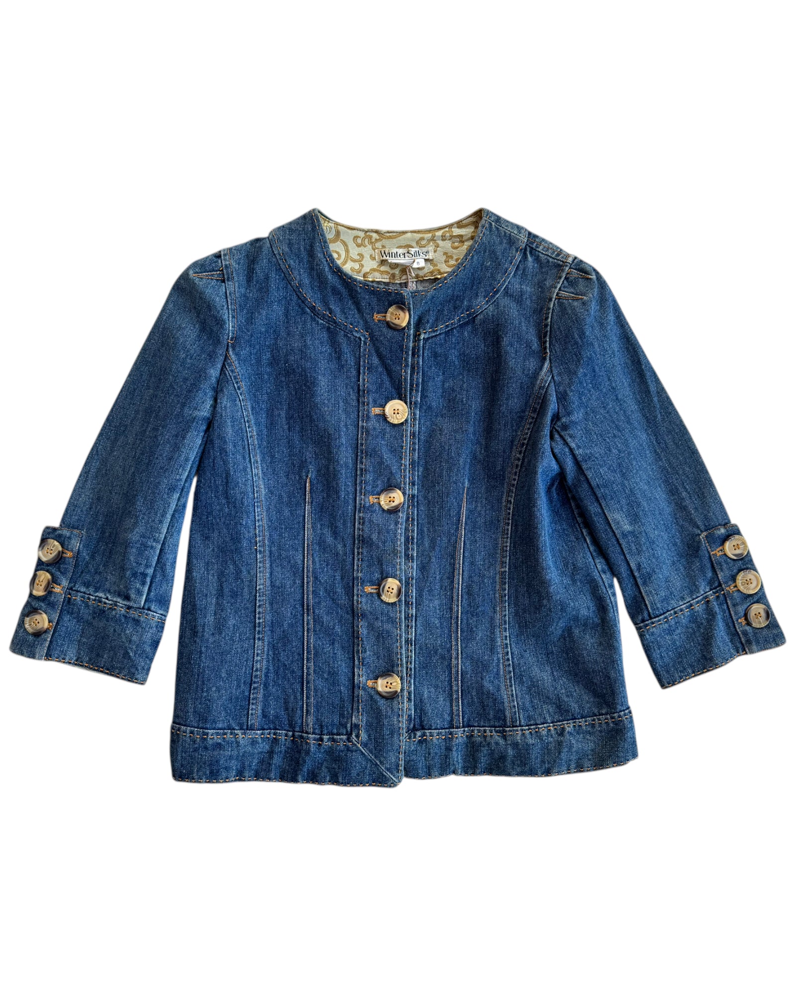 CHAMARRA DE DENIM 100% ALGODÓN EN TONOS DE DENIM AZUL CON BOTONES EN DOS TONOS DE CAFÉ DE TAMAÑO GRANDE Y MANGAS TRES CUARTOS. NO TIENE DETALLES, EN PERFECTO ESTADO.