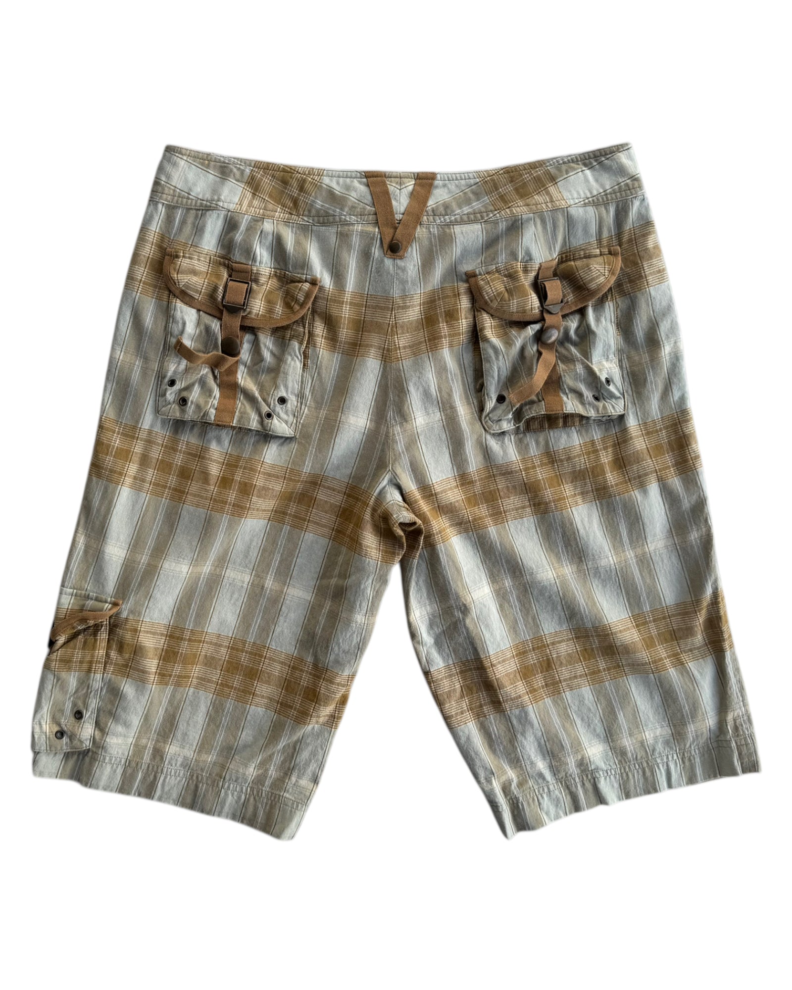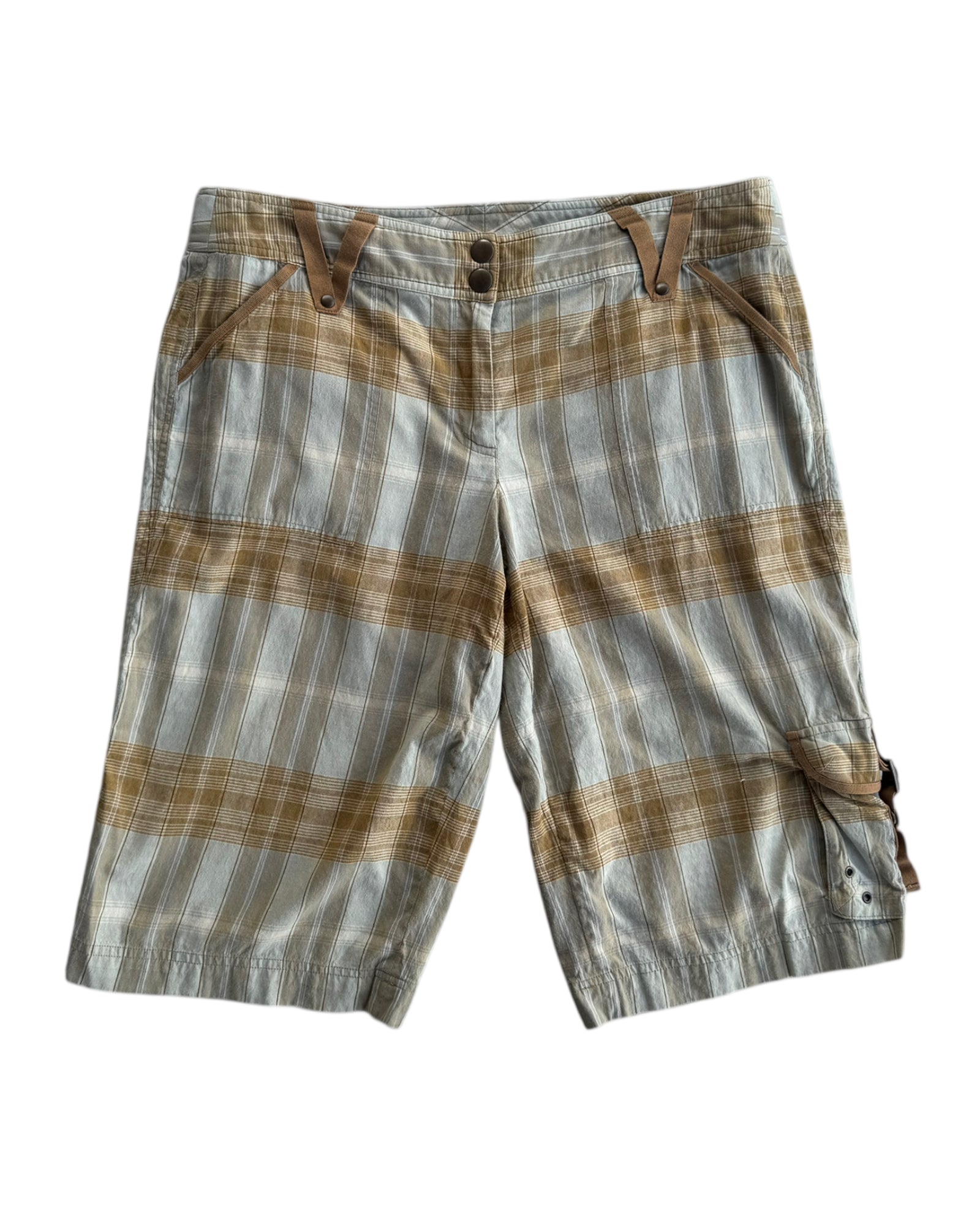 SHORTS ESTILO BERMUDAS BAGGY CON VARIOS BOLSILLOS FUNCIONLES CON PATRON DE CUADROS EN COLOR BEIGE, AZUL CLARO Y BLANCO. NO TIENE DETALLES, EN PERFECTAS CONDICIONES.