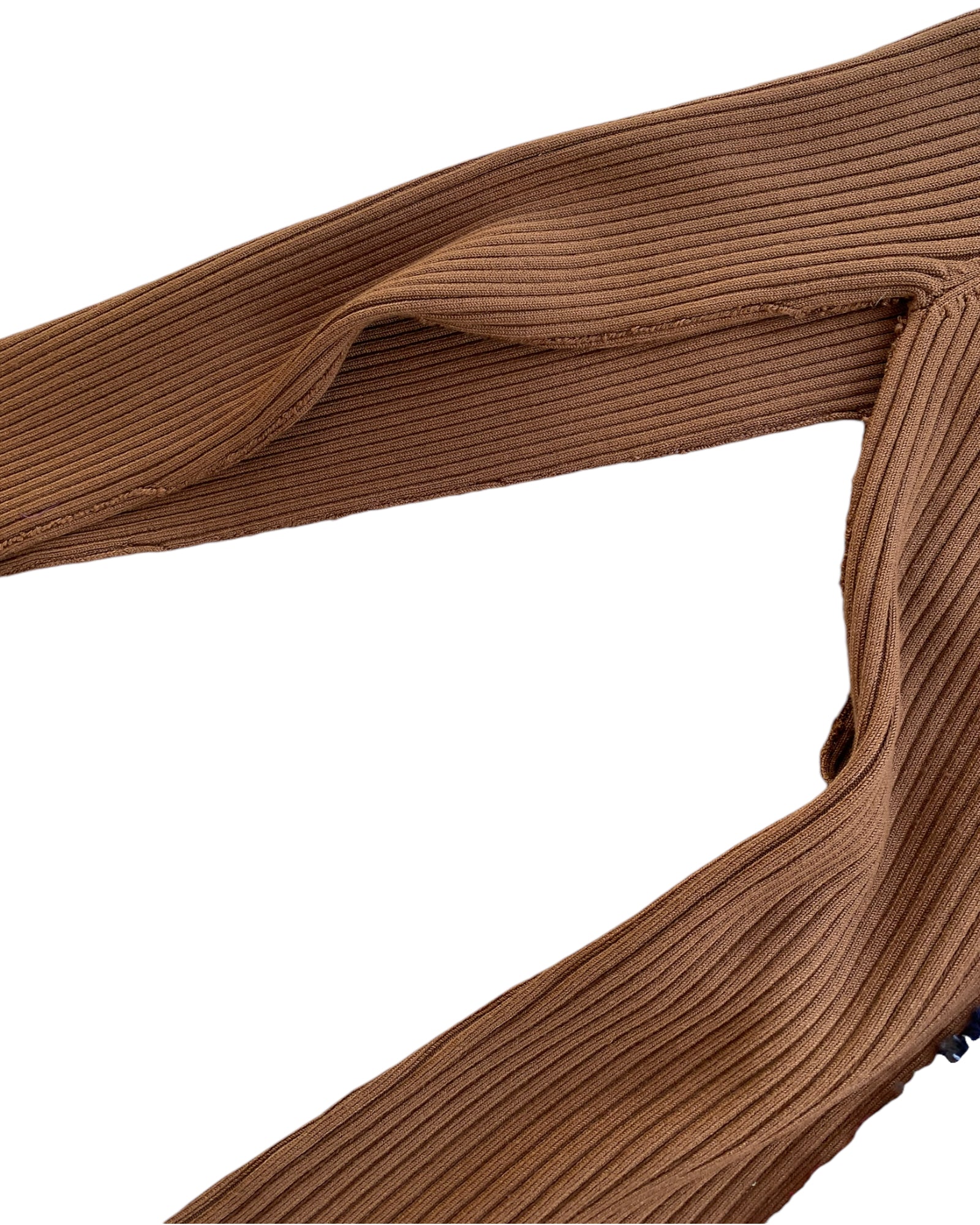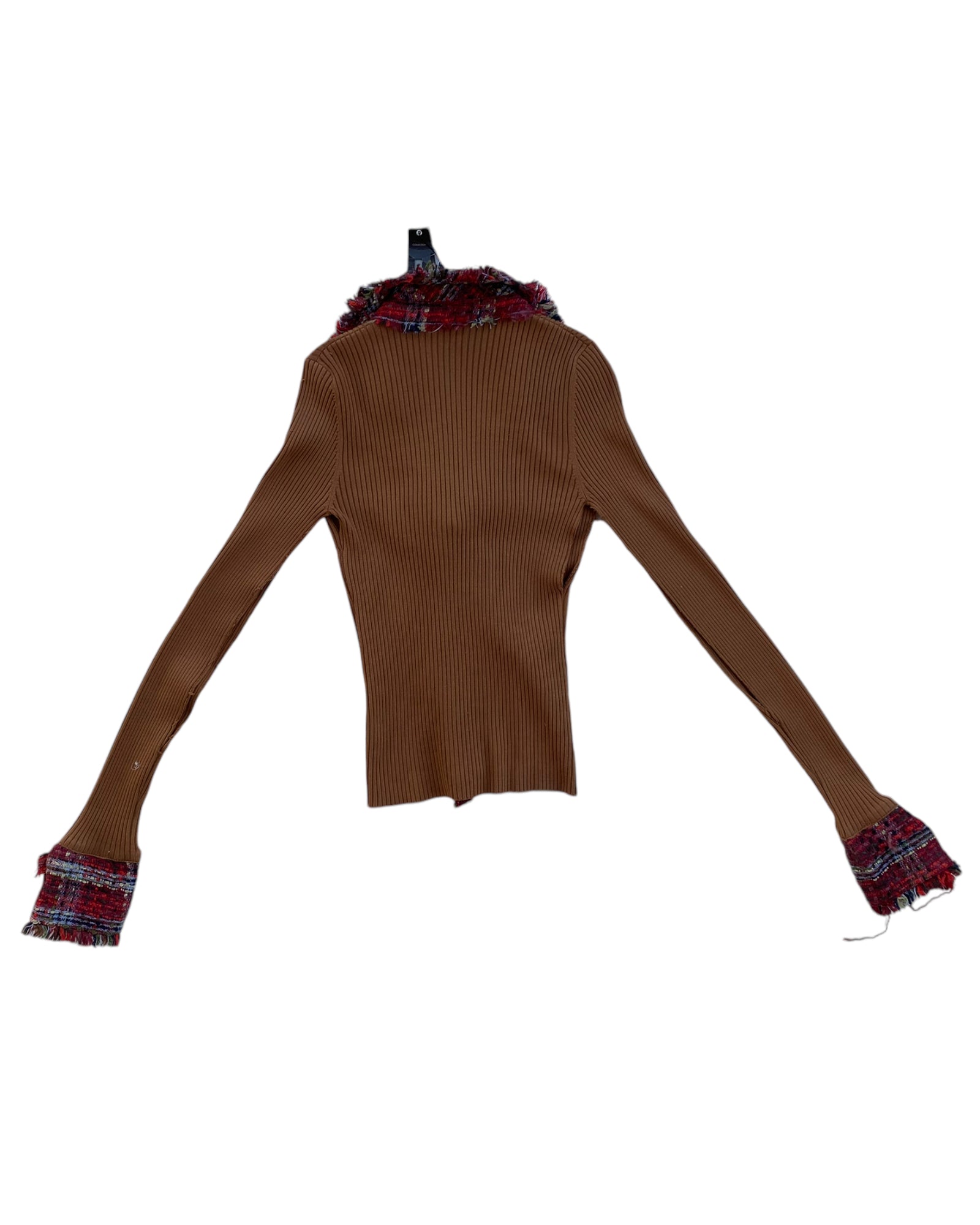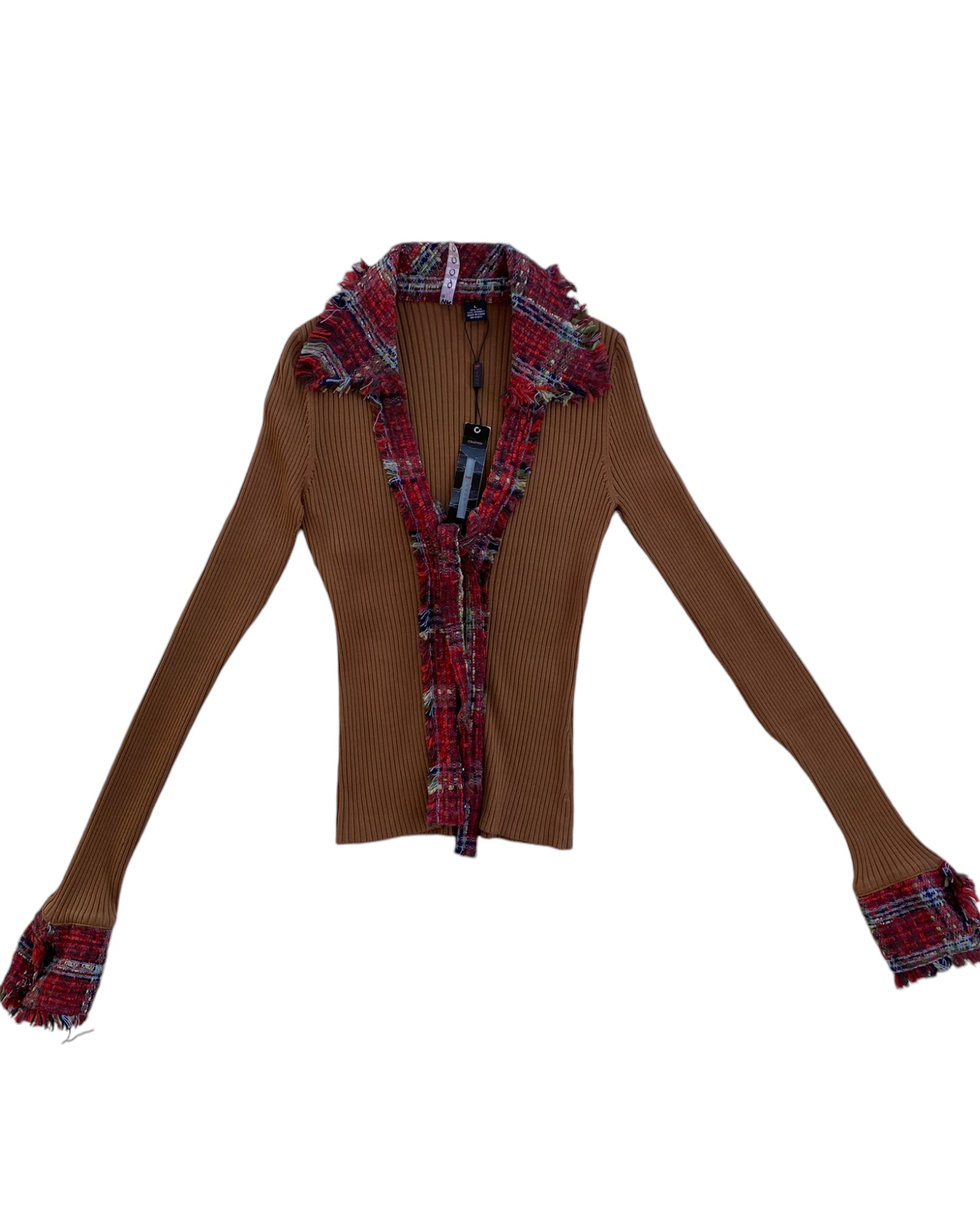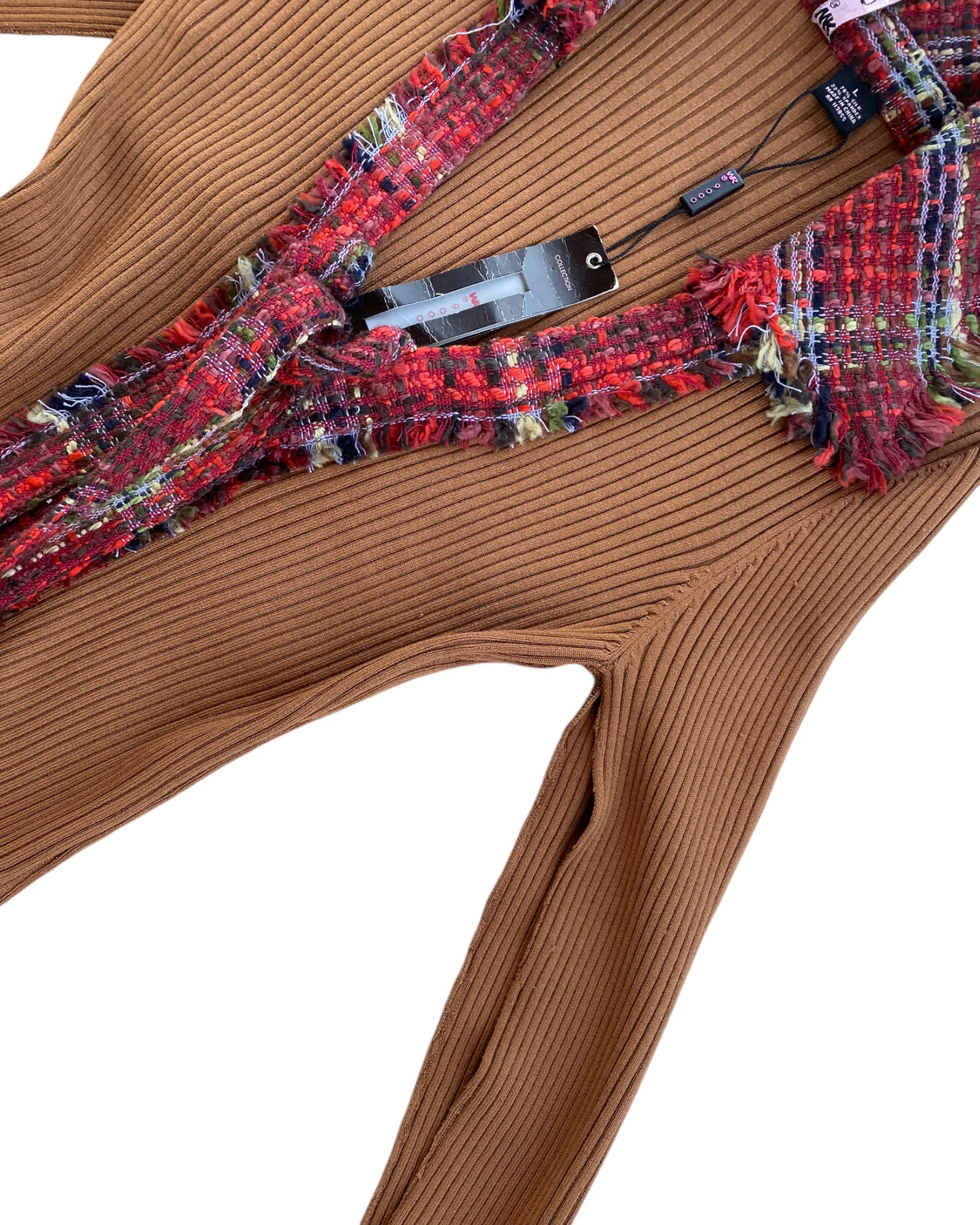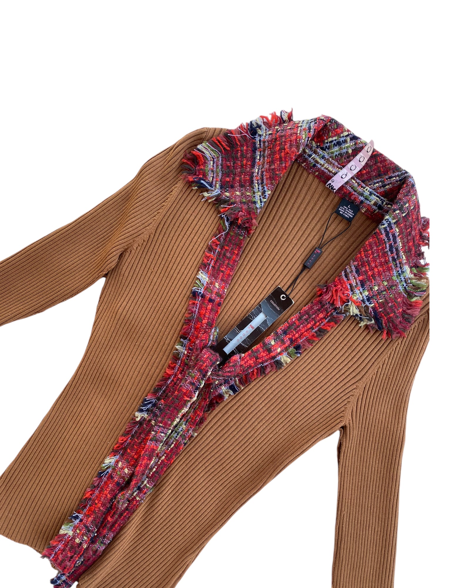 SUETER 78% SEDA 22% SPANDEX CAFE CON DETALLES EN TELA CUADRICULADA EN COLORES ROJO, NEGRO Y BLANCO. APERTURAS EN LOS BRAZOS Y UN SOLO BOTON PARA CERRAR. DETALLE DE MOÑO EN BUSTO. DEADSTOCK CON ETIQUETA. ESTIRA BASTANTE. SIN DETALLES DE USO.