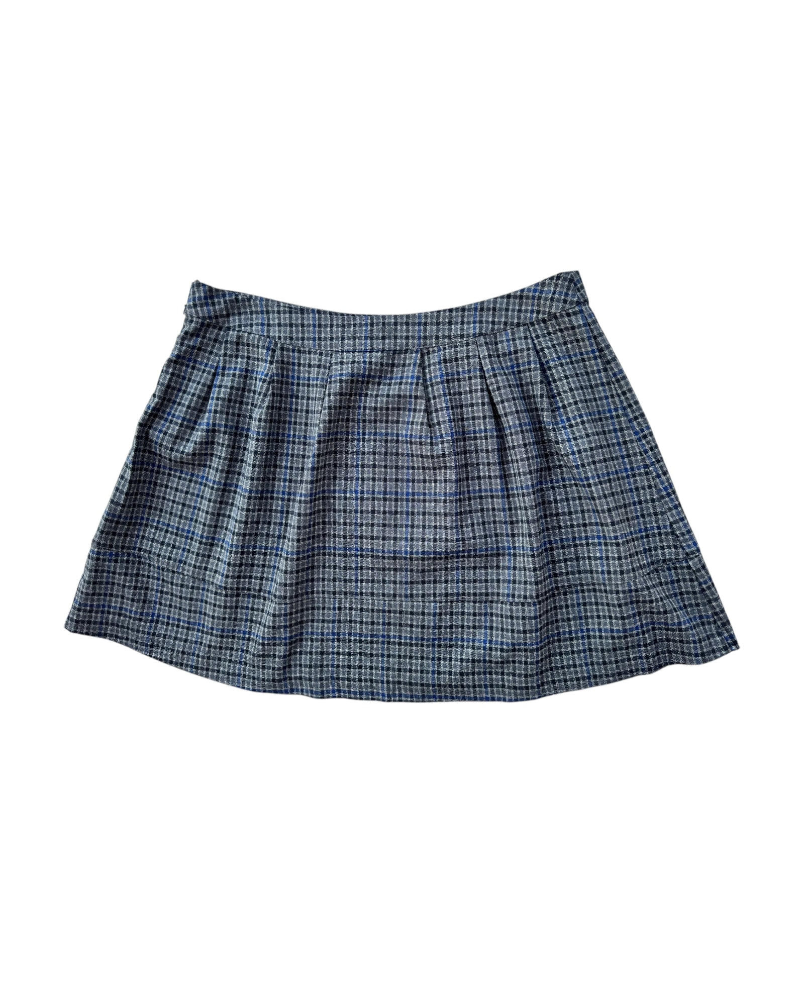 FALDA DE PRINT DE CUADROS EN GRIS, NEGRO Y AZUL. CORTE EN A. CIERRE AL COSTADO. 64% POLYESTER, 34% RAYON Y 2% SPANDEX. NO TIENE DETALLES DE USO.