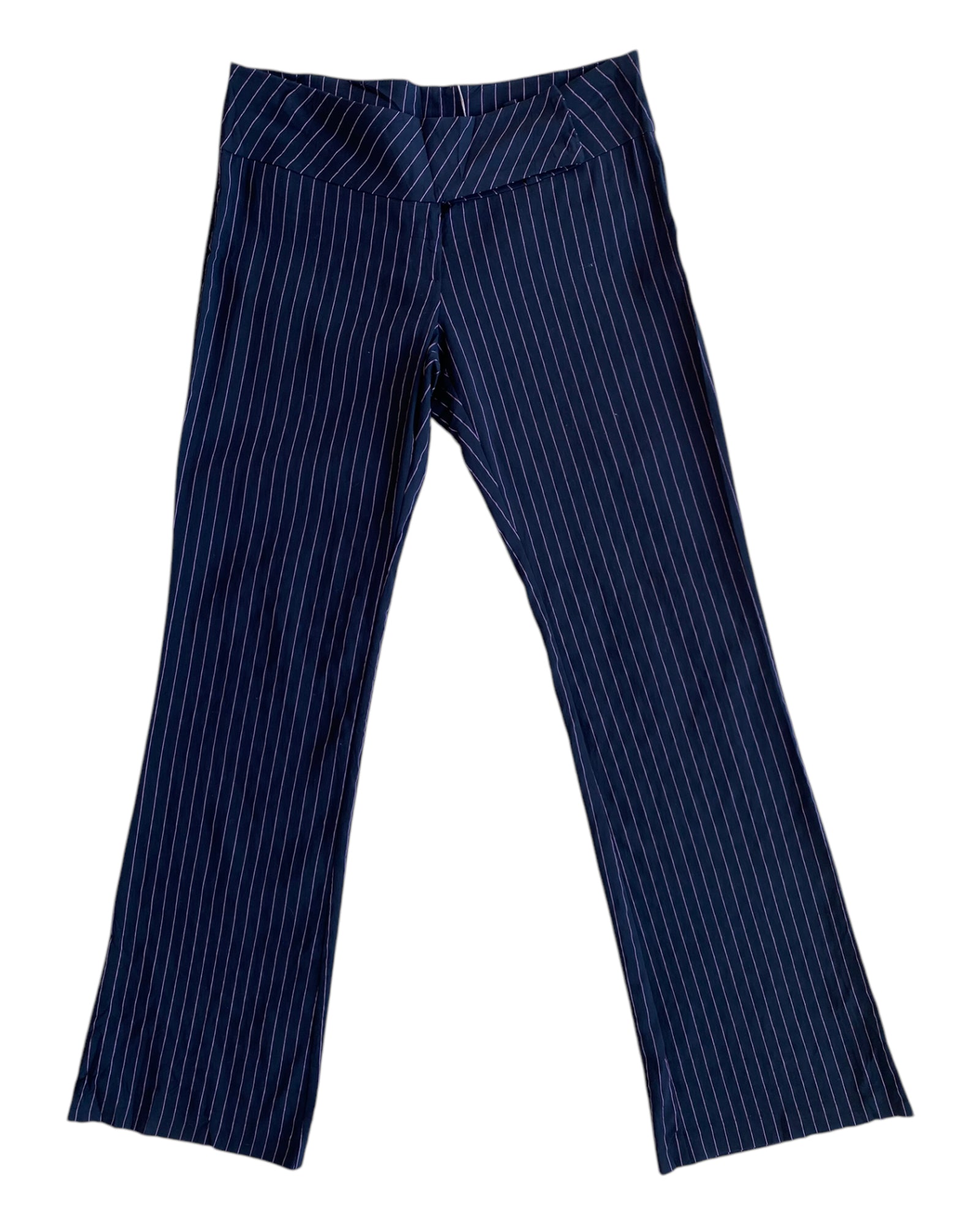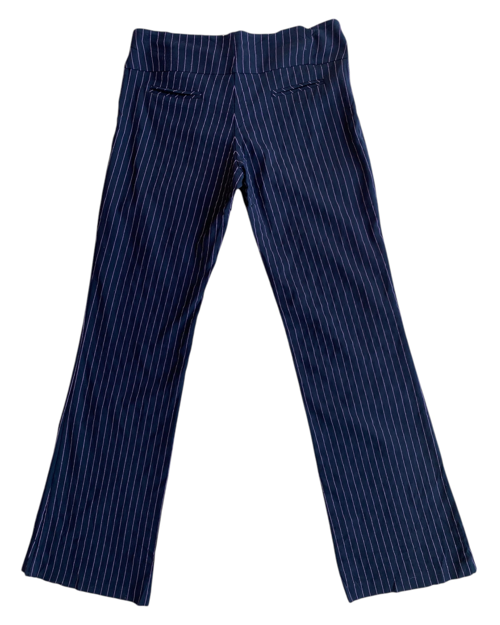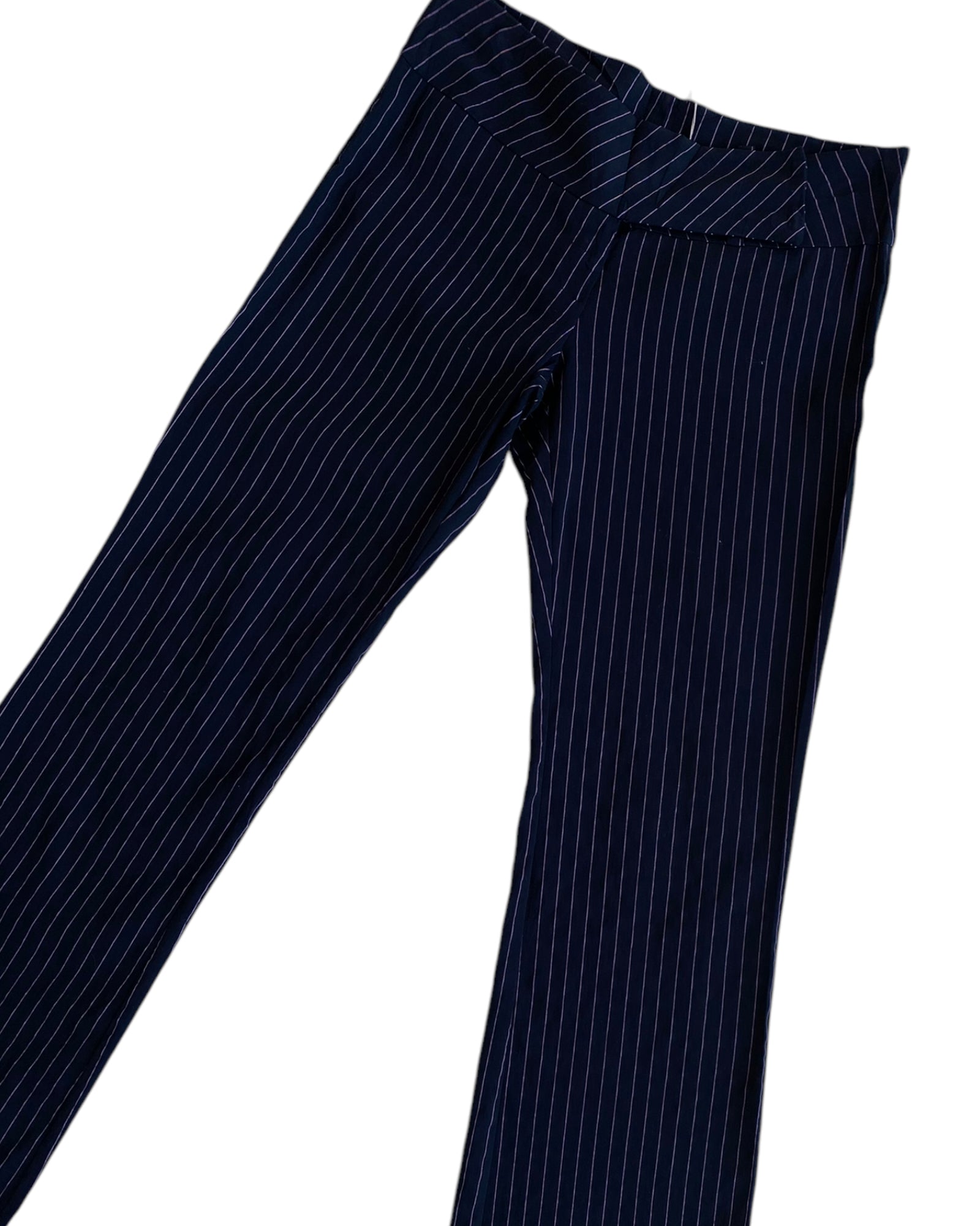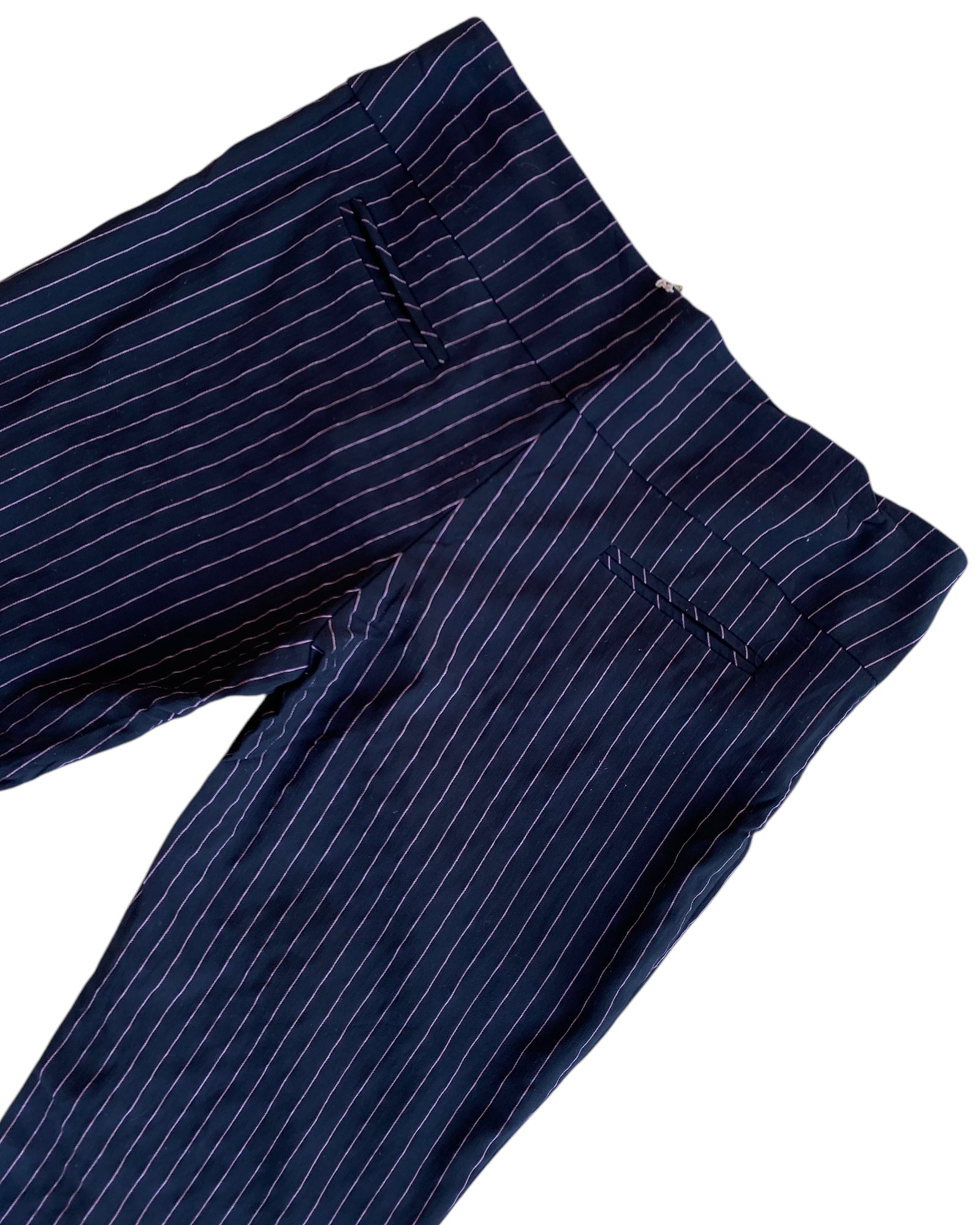 PANTALONES DE RAYAS VERTICALES ROSAS EN NEGRO, TIPO FLARE, NO BOLSILLOS. BANDA EN LA CINTURA. SIN DETALLES DE USO.