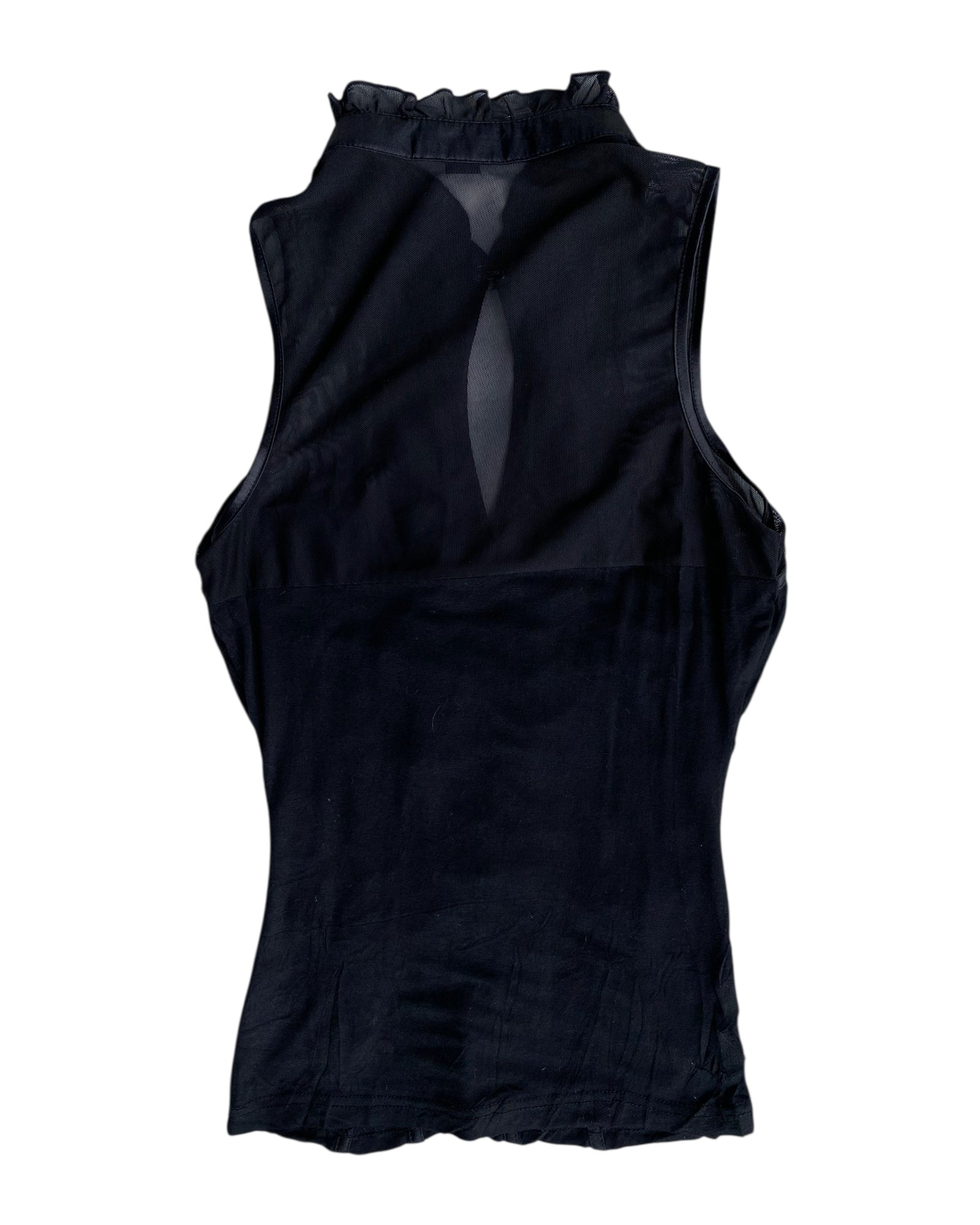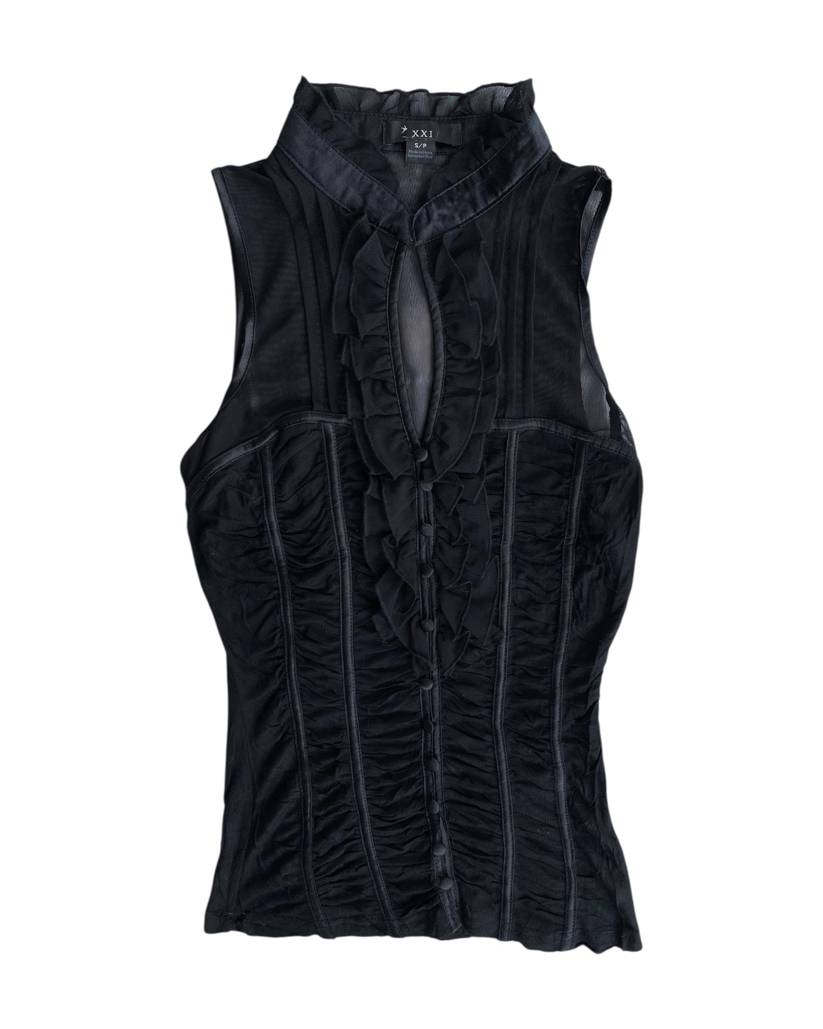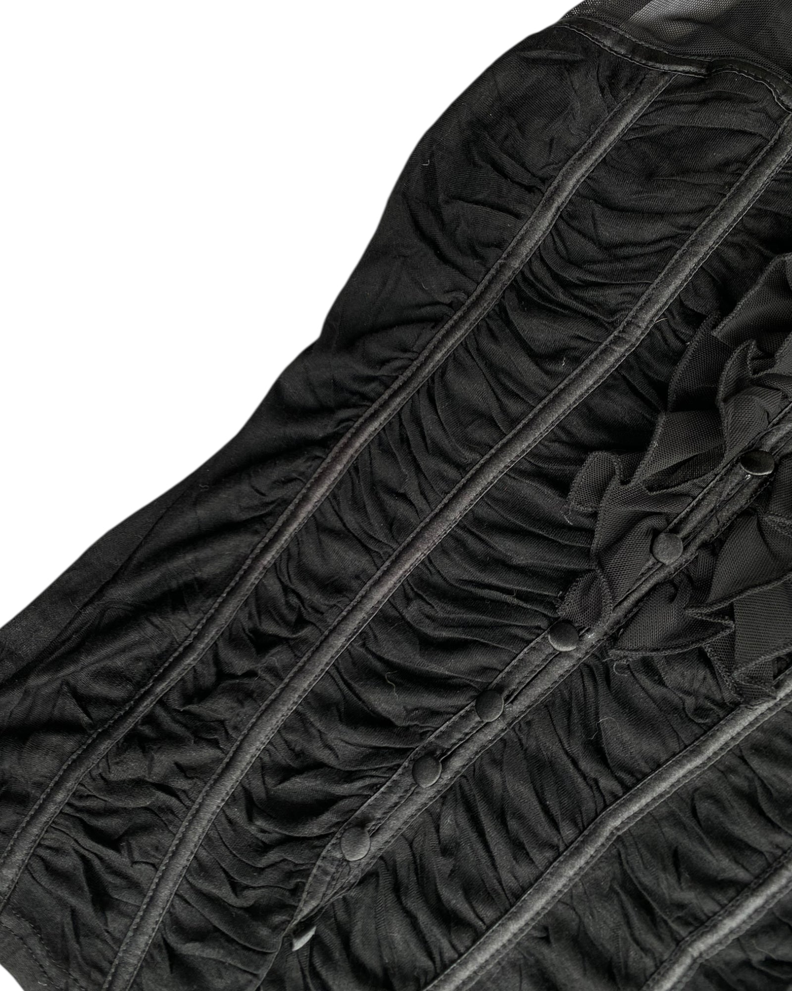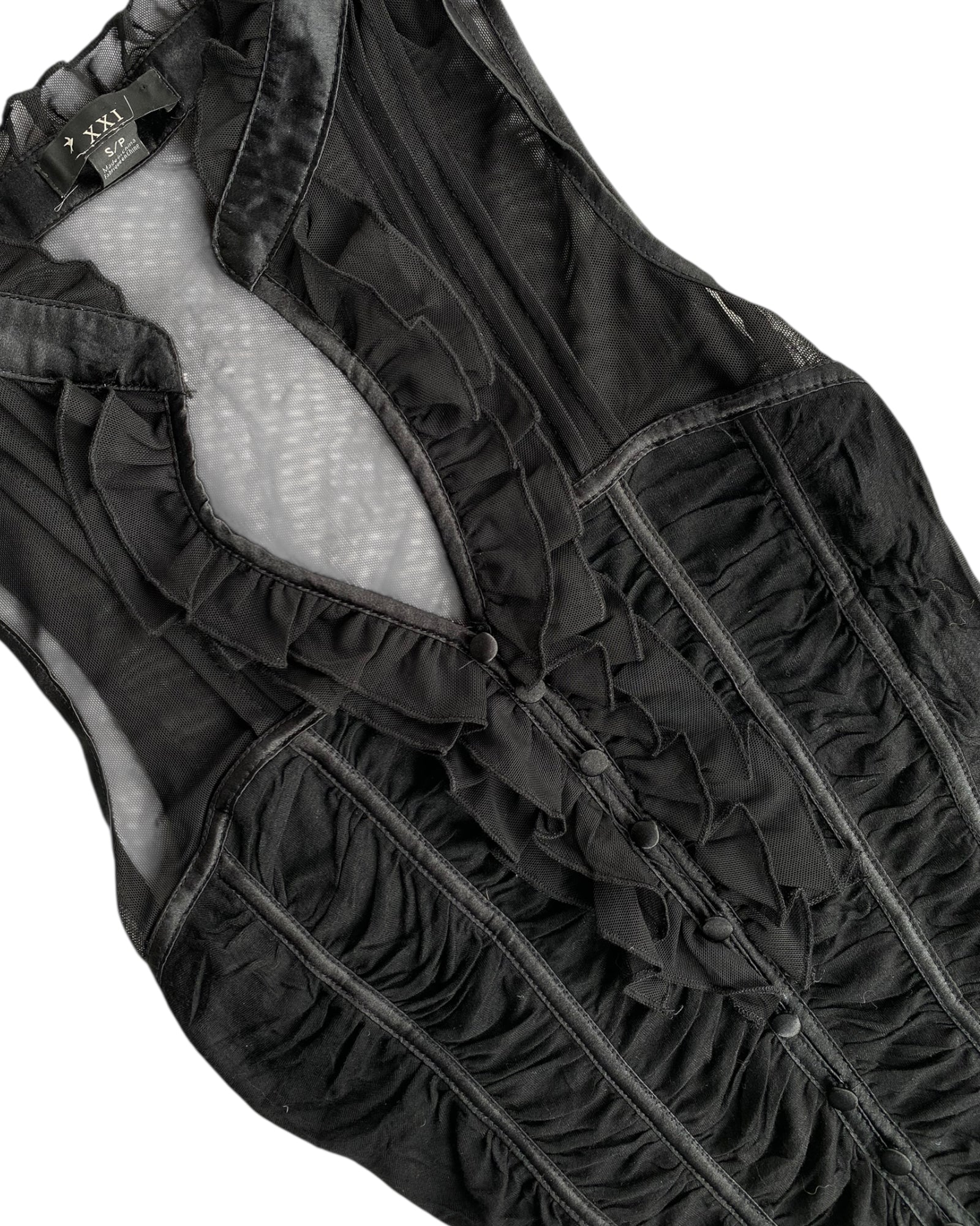 CAMISA CON PINZAS ESTILO CORSET EN NEGRO CON DETALLES EN MESH TRANSPARENTE Y BOTONES ESTILO TERCIOPELO. 95% RAYON 5% SPANDEX, ESTILO BUSTIER, AJUSTABLE AL CUERPO. EN PERFECTO ESTADO