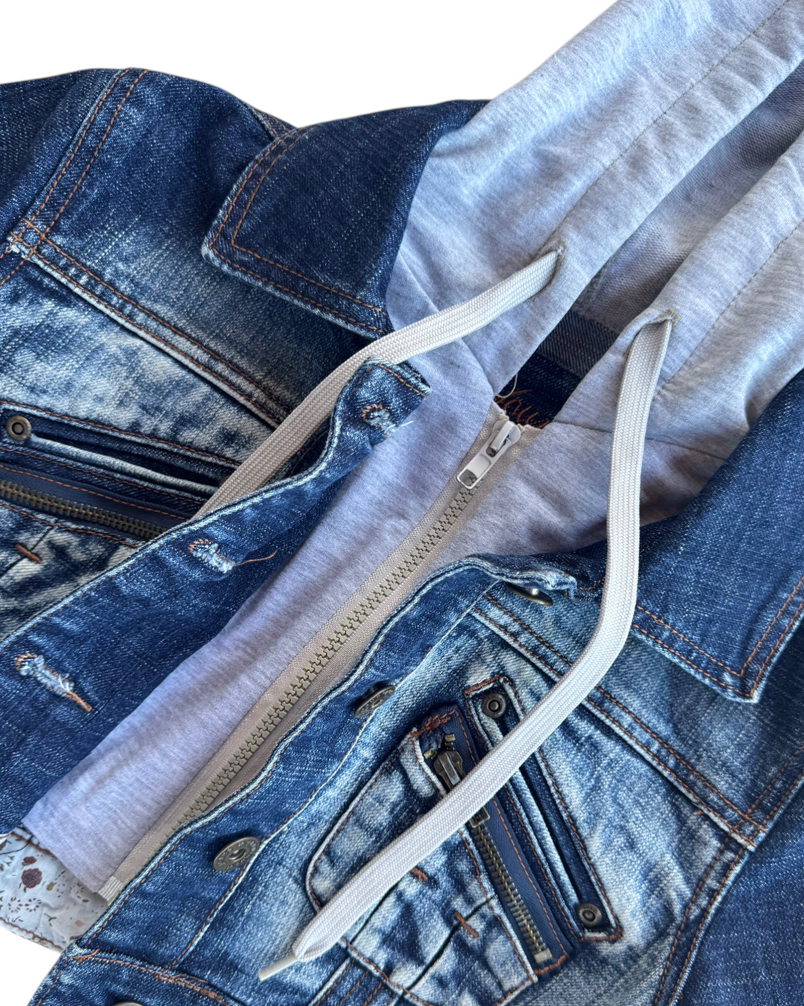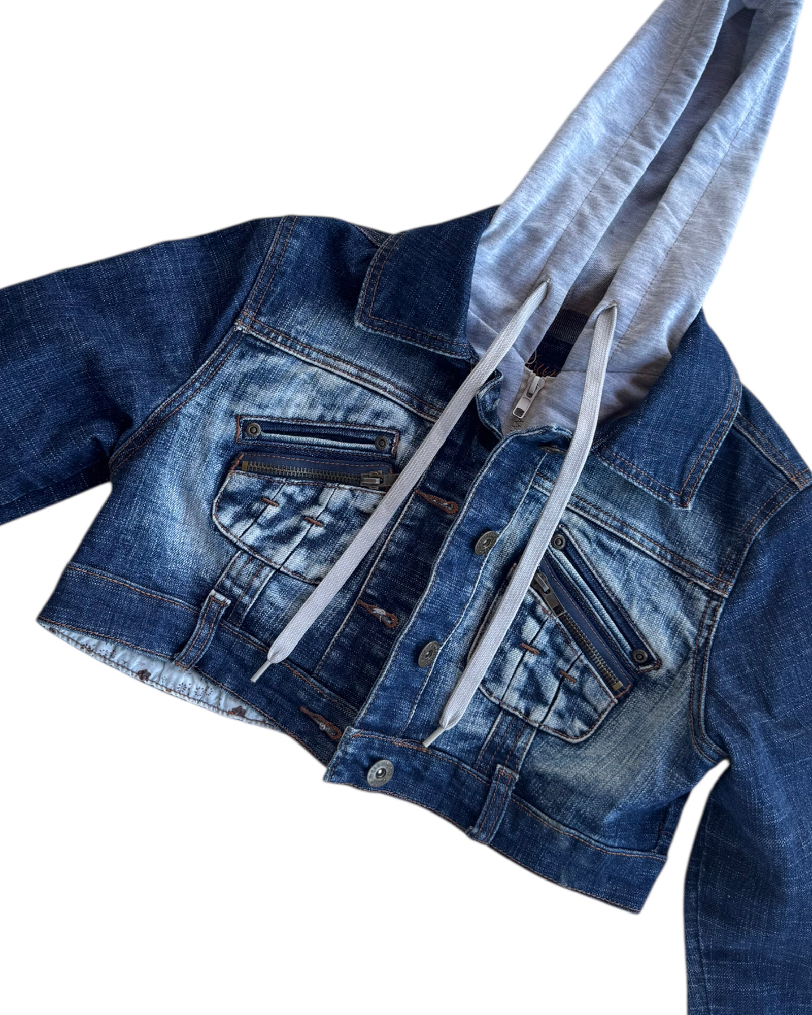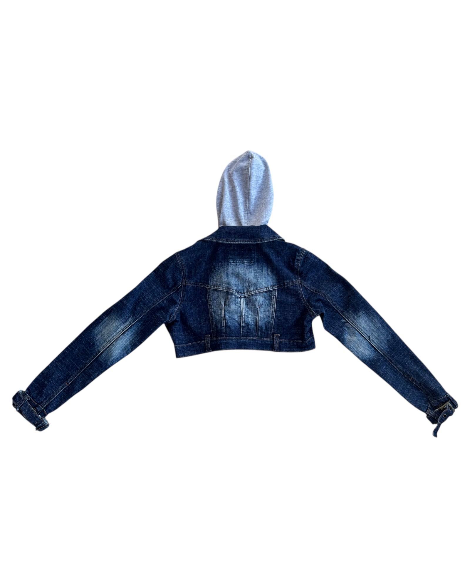 CHAMARRA SUPER CROPPED DENIM ESTILO DESLAVADO A PROPOSITO MUY CORTA CON CHAMARRA DE ESTILO SUDADERA CON GORRO EN COLOR GRIS DEBAJO, 70% ALGODON, 29% POLYESTER Y 1% SPANDEX. NO TIENE DETALLES, EN PERFECTO ESTADO.