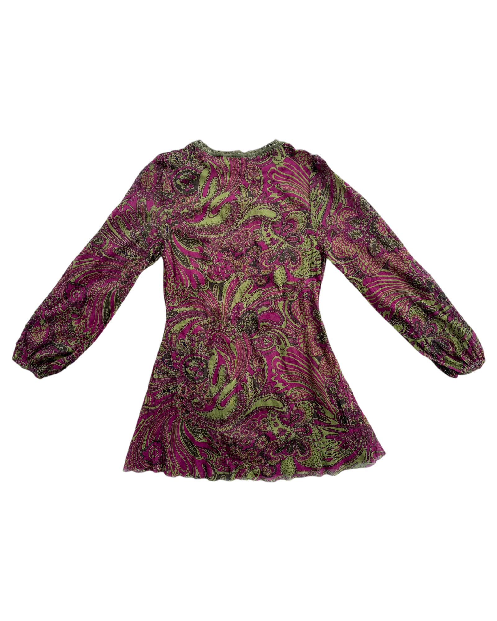 BLUSA 100% POLYESTER DE MESH CON PRINT DE MANDALAS EN COLOR VERDE MILITAR Y MORADO, MANGA TRES CUARTOS Y CUELLO EN V CON DETALLE DE ENCAJE VERDE, NO TIENE DETALLES, EN PERFECTO ESTADO.