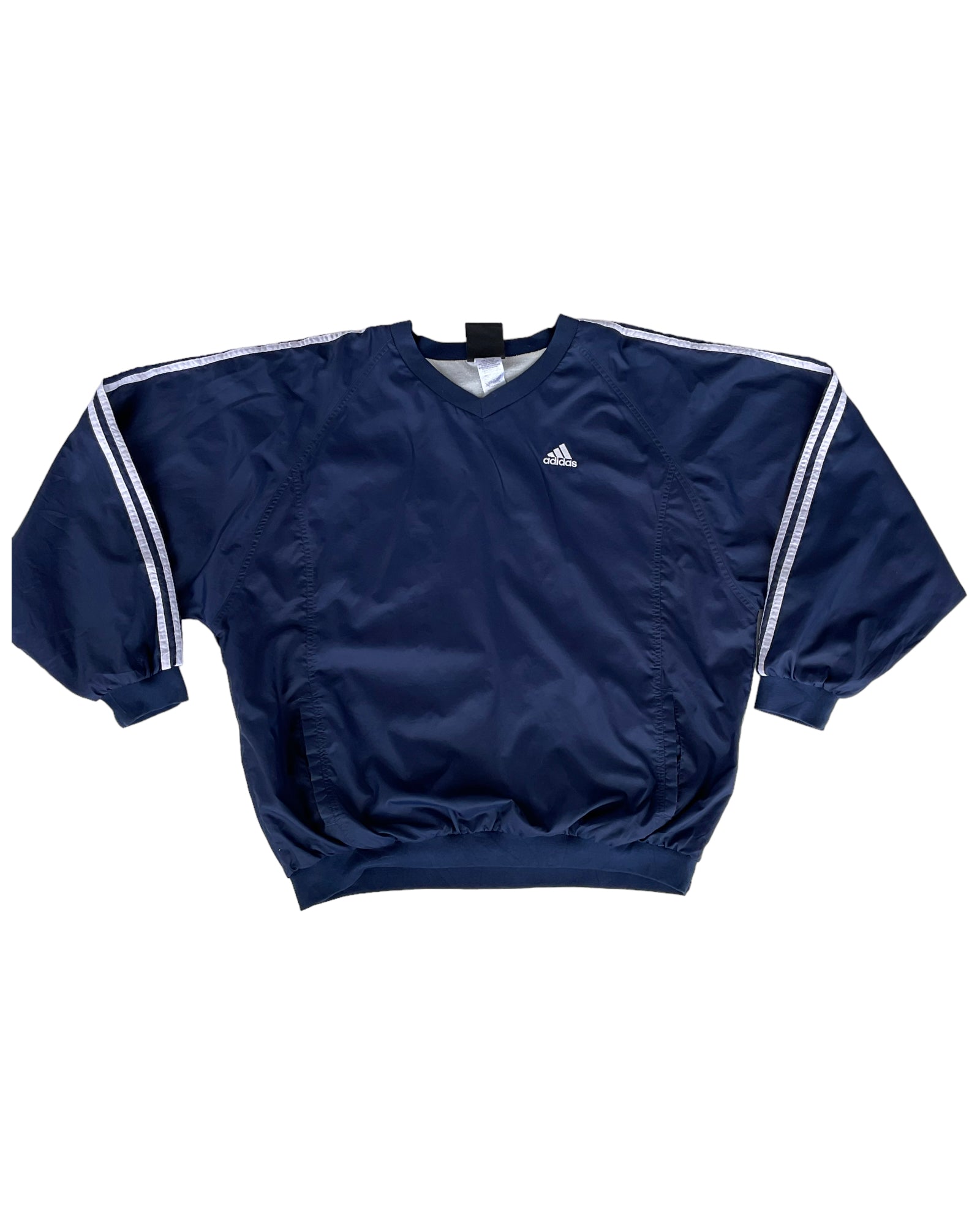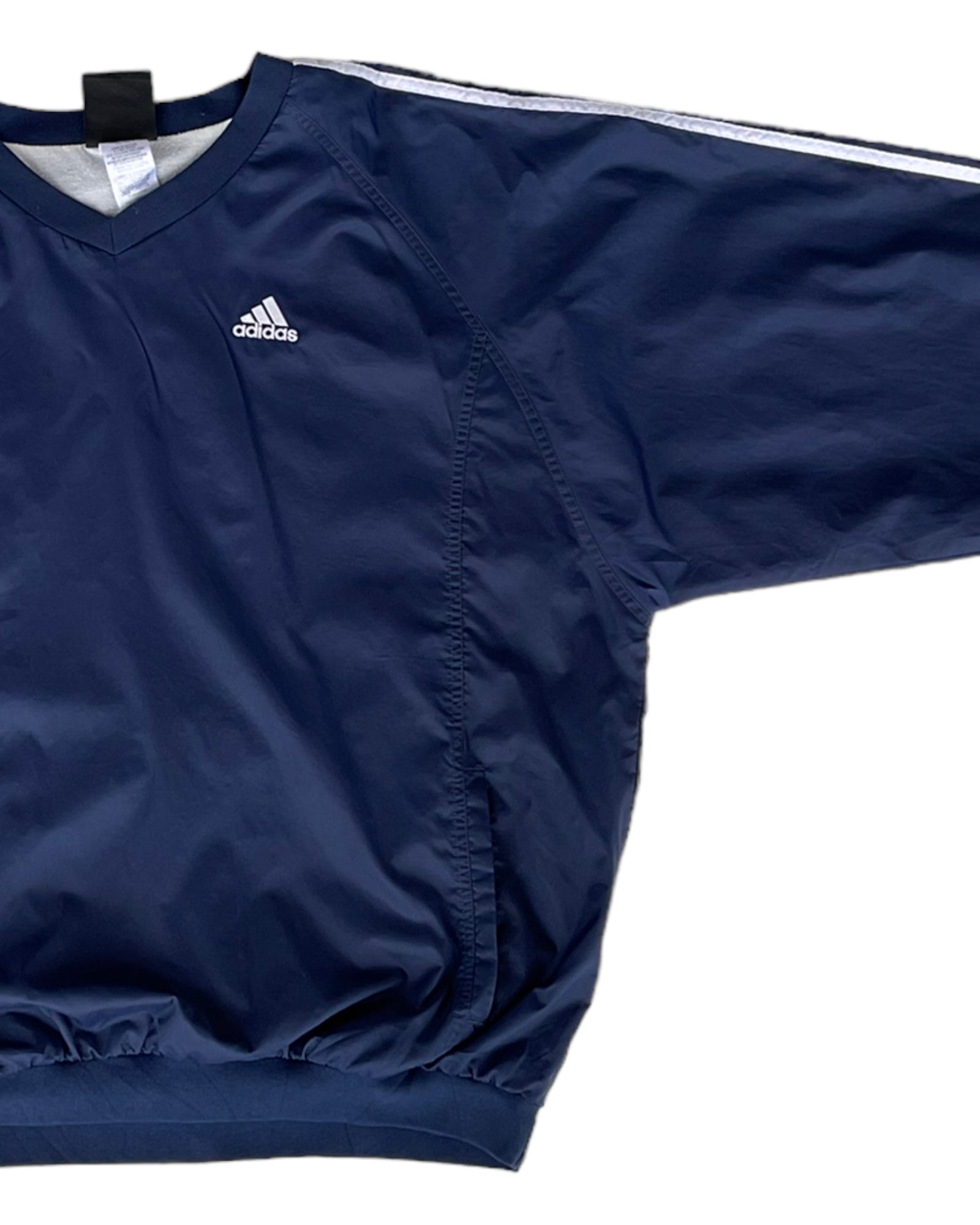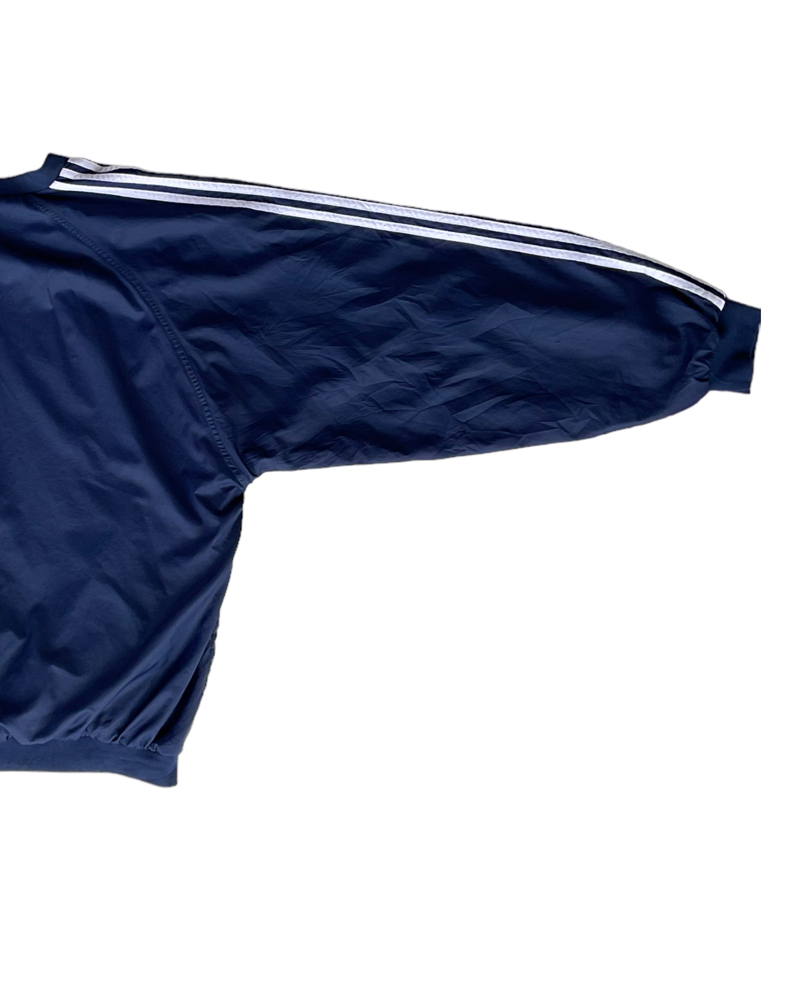ROMPEVIENTOS ADIDAS AZUL MARINO,EXTERIOR 100% NAYLON, INTERIOR 35% POLIÉSTER 65% ALGODÓN. RAYAS BLANCAS A LO LARGO DE LOS BRAZOS Y LOGO DE ADIDAS BORDADO EN EL PECHO.