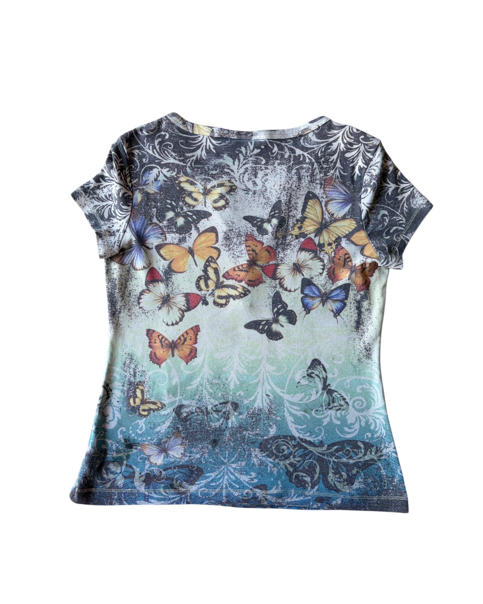 PLAYERA COLOR BLANCO CON DEGRADADO AQYUA, ESTAMPADO DE FLORES Y GRECAS, DETALLE DE TRES BOTONES EN EL ESCOTE, CUELLO TIPO HENLEY