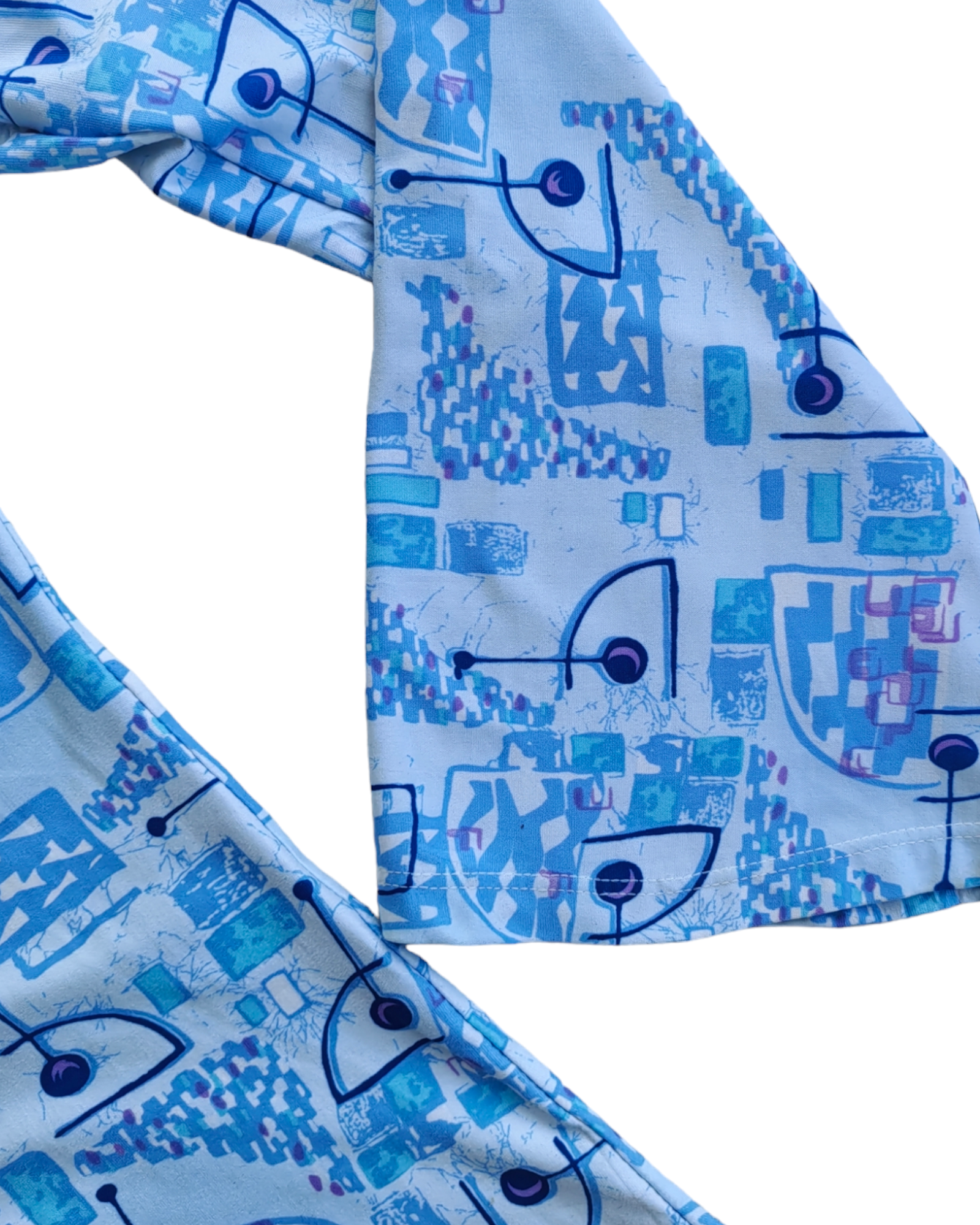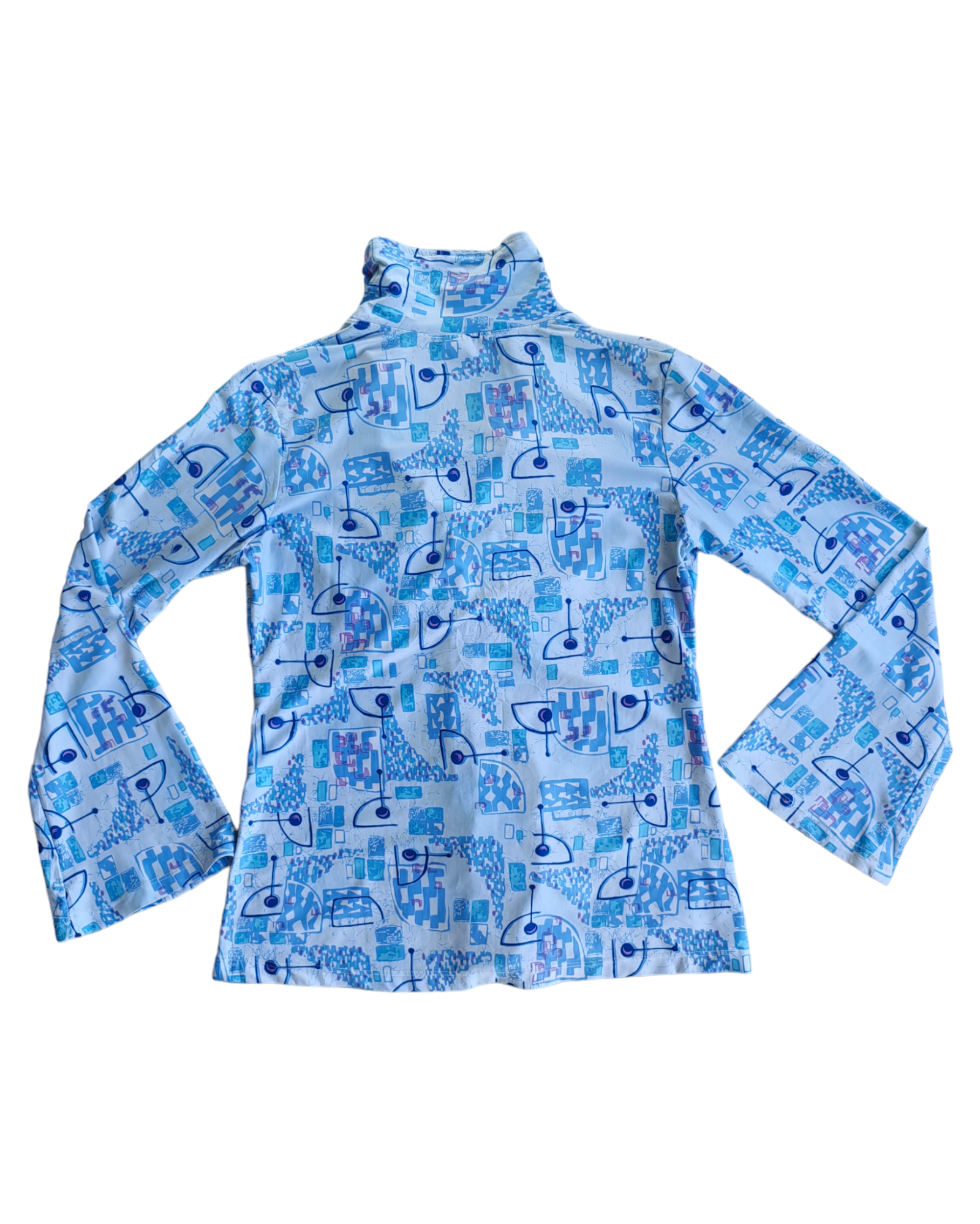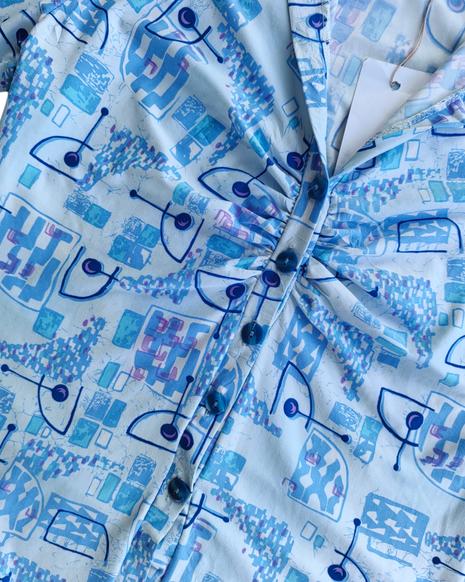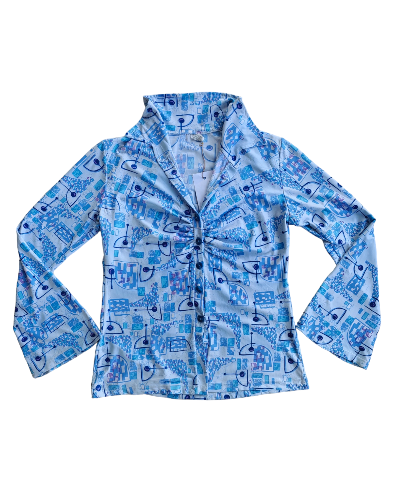 BLUSA MANGA LARGA DE COLOR BLANCO CON ESTAMPADO DE FORMAS AZULES Y MORADAS. BOTONES AZULES, PINZAS EN EL PECHO PARA RESALTAR. SIN DETALLES DE USO.