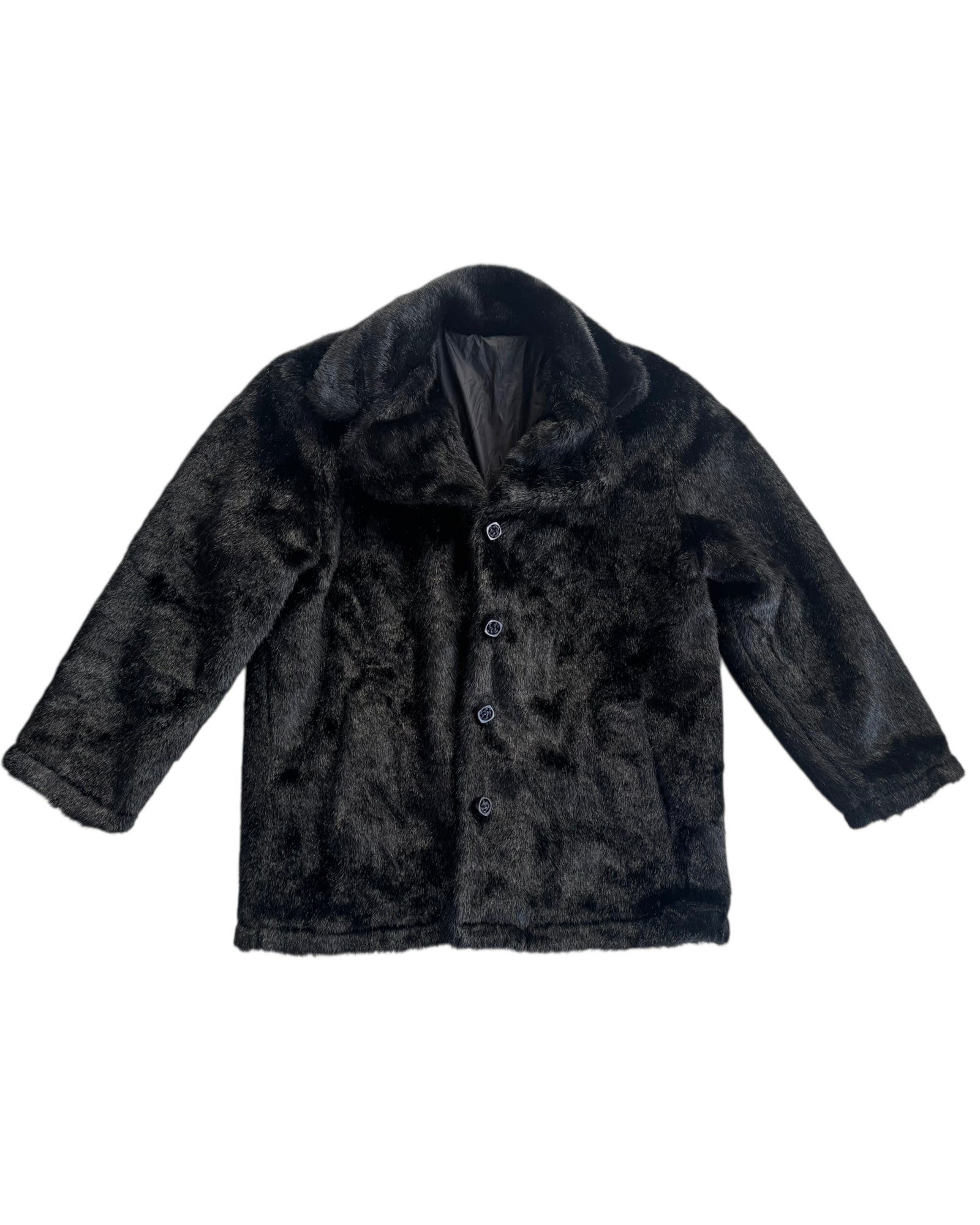ABRIGO LARGO DE PELO, COLOR NEGRO, SIN ESTAMPADOS, CON UNA HILERA DELANTERAS DE BOTONES COLOR NEGRO CUADRADO PARA ABROCHAR. EN PERFECTAS CONDICIONES. SIN DETALLES.