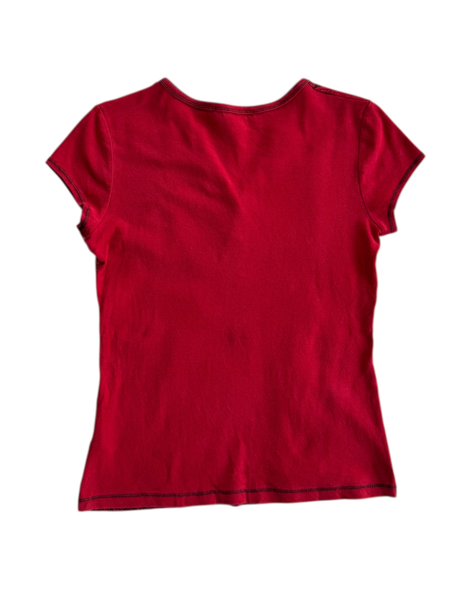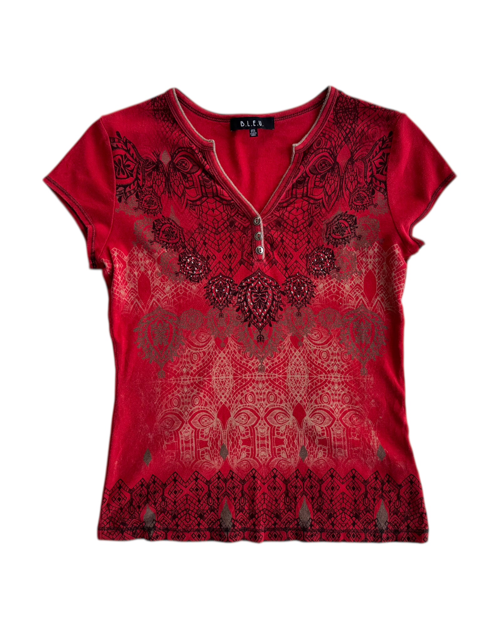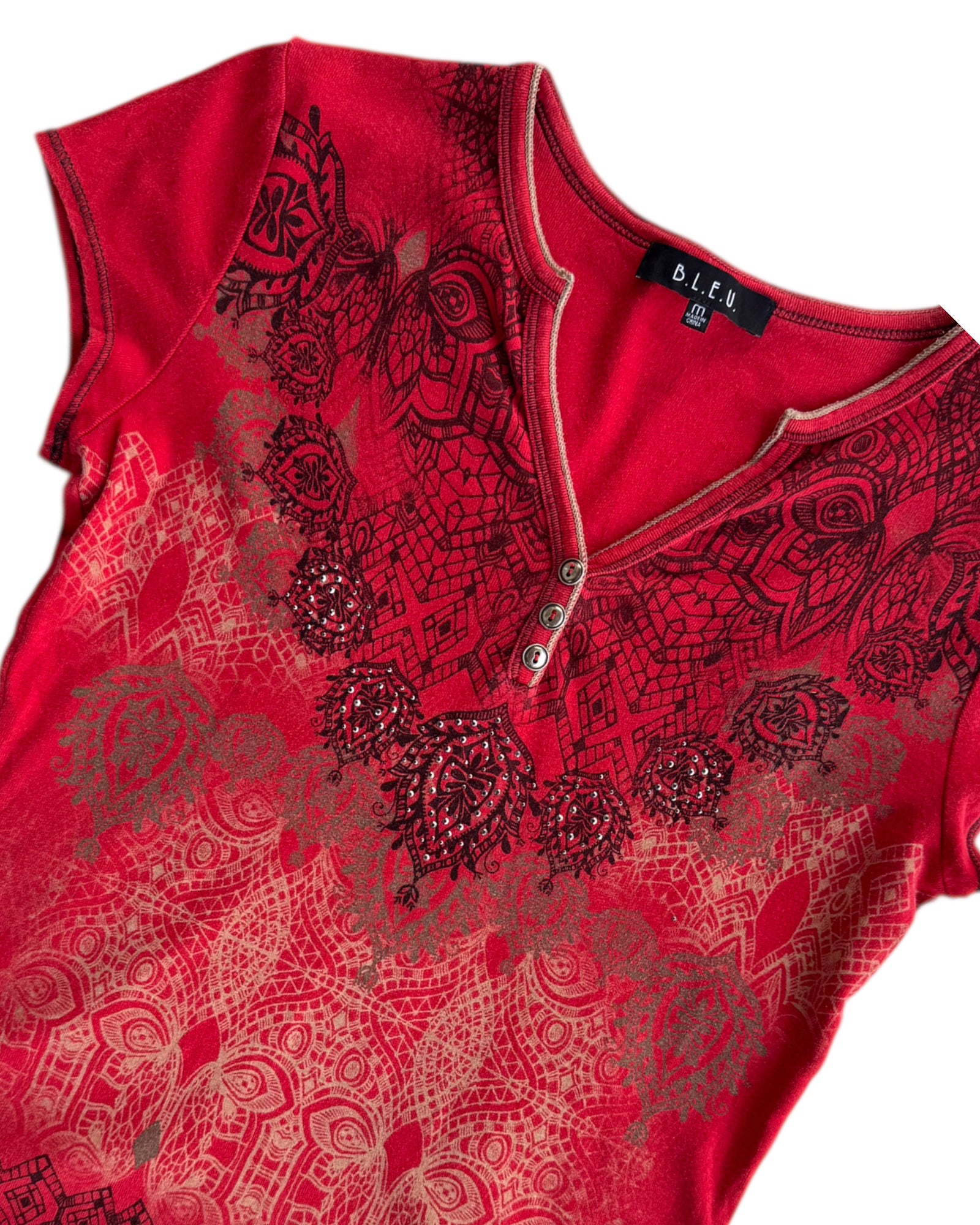 PLAYER ROJA MANGA CORTA ESCOTE EN "V" CON TRES BOTONES METALICOS EN PECHO. ESTAMPADO TRIBAL EN COLORES NEGROS Y BEIGES. 100% ALGODÓN