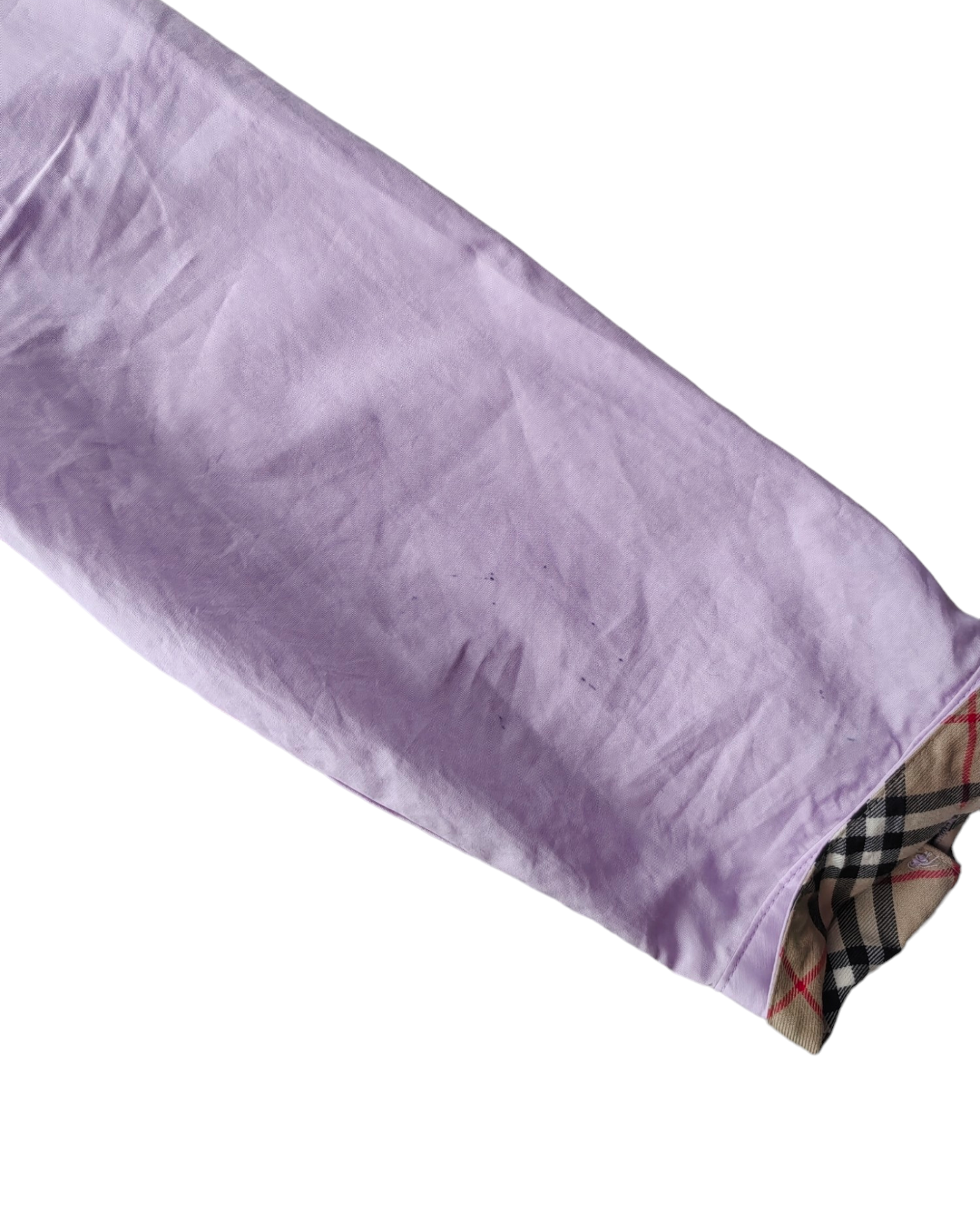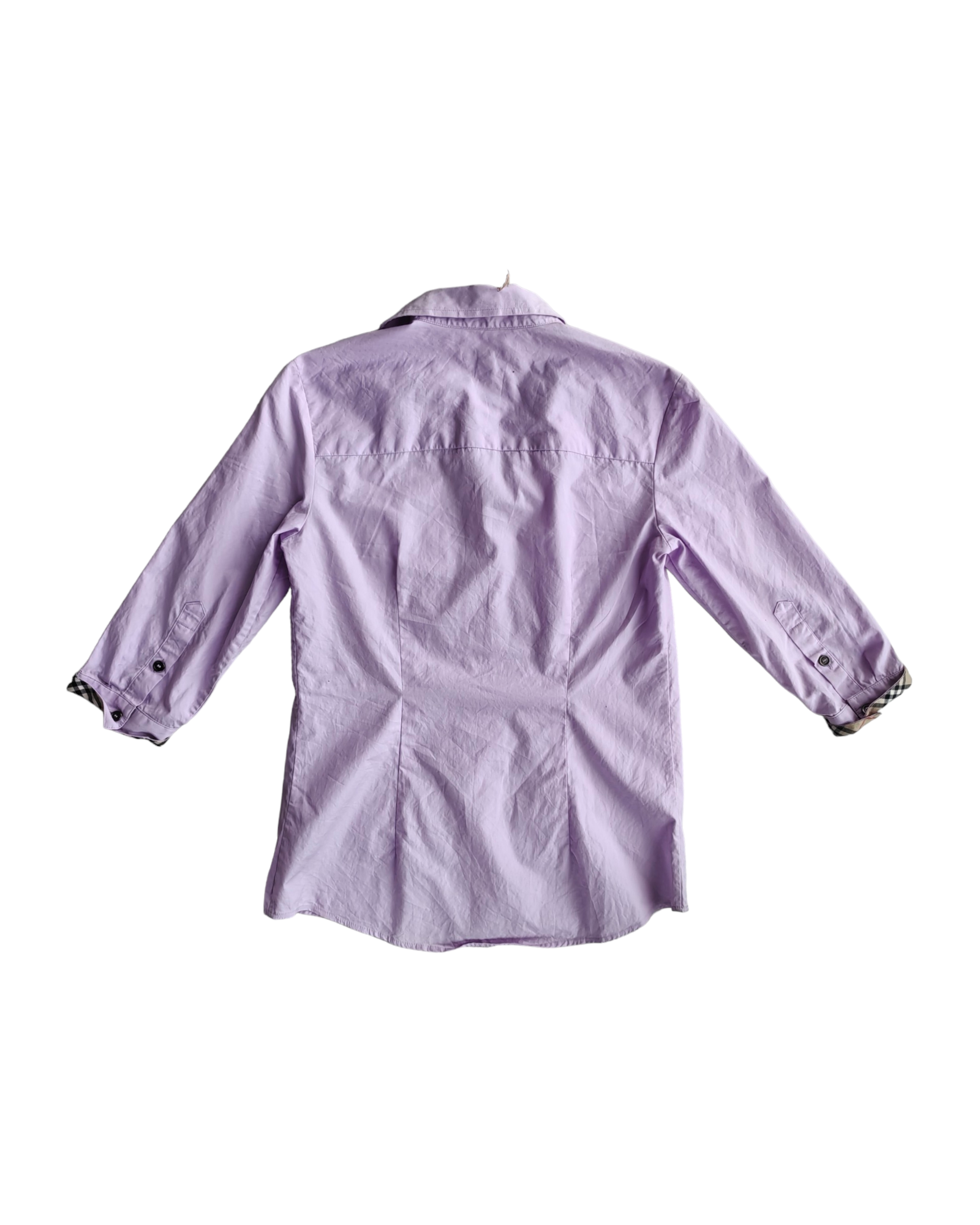 BLUSA DE BOTONES 100% ALGODÓN EN COLOR LILA. MANGA 3/4 CON DETALLES DEL ESTAMPADO DE BURBERRY EN EL CUELLO Y LOS PUÑOS. PEQUEÑAS MANCHAS DE TINTA EN LA MANGA IZQUIERDA.