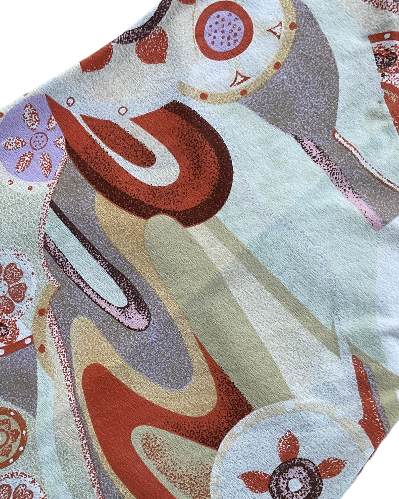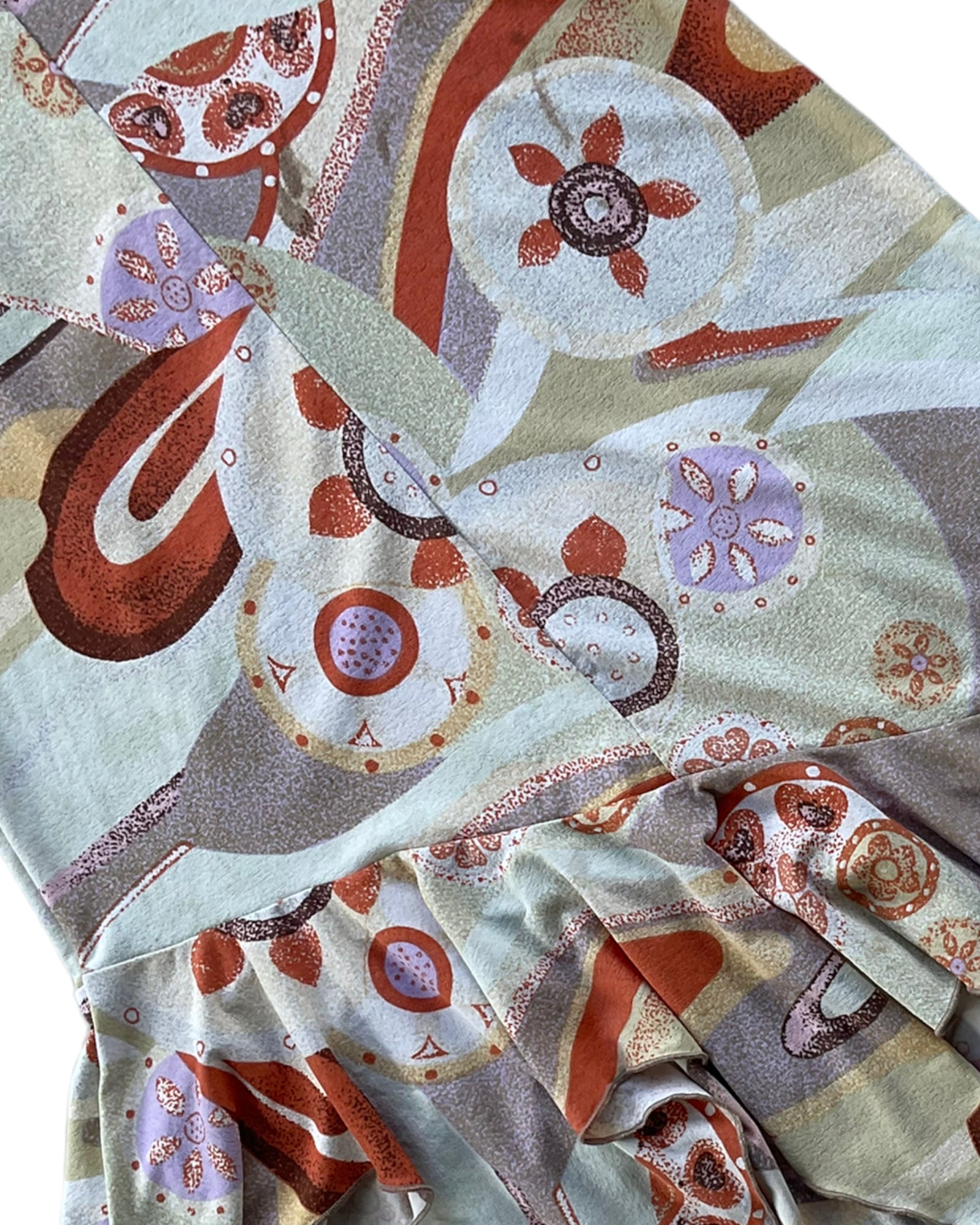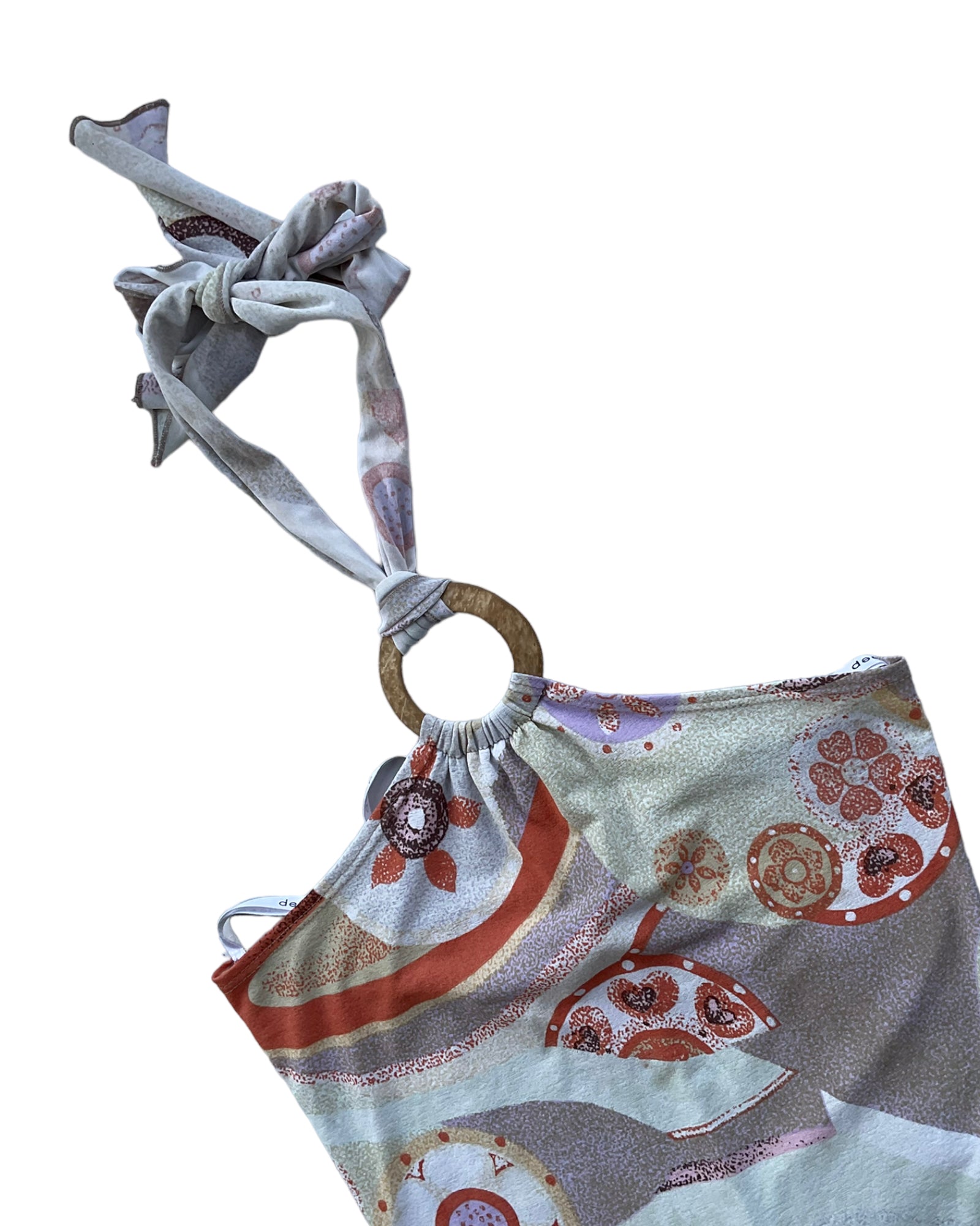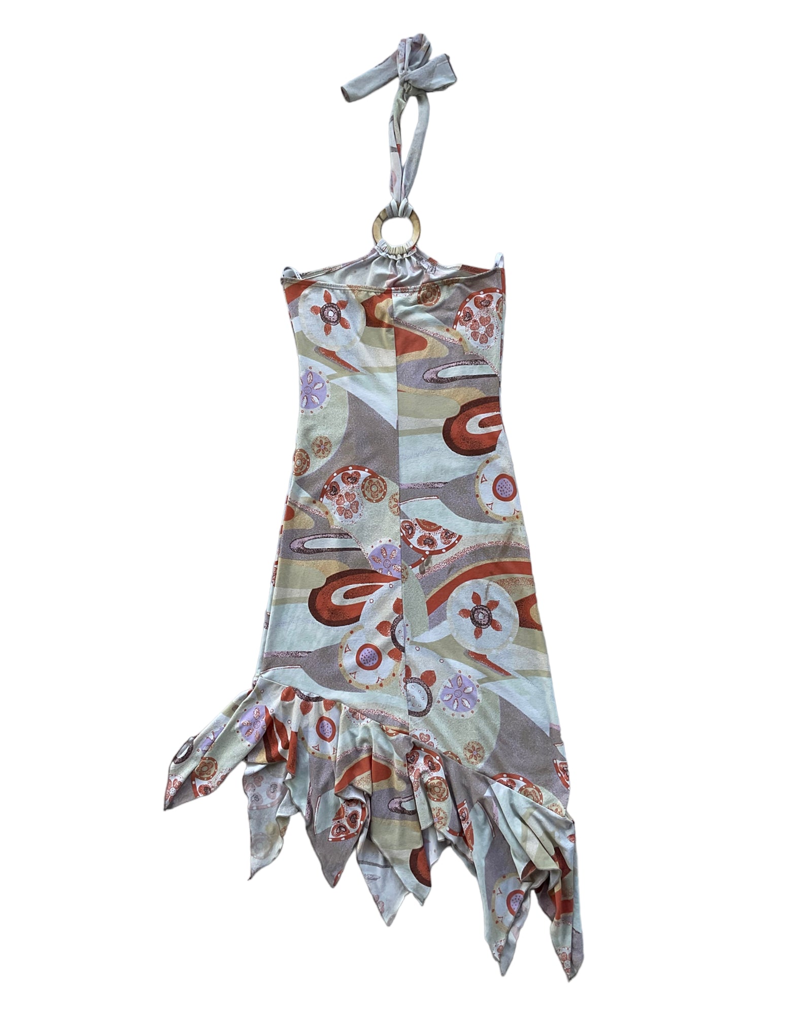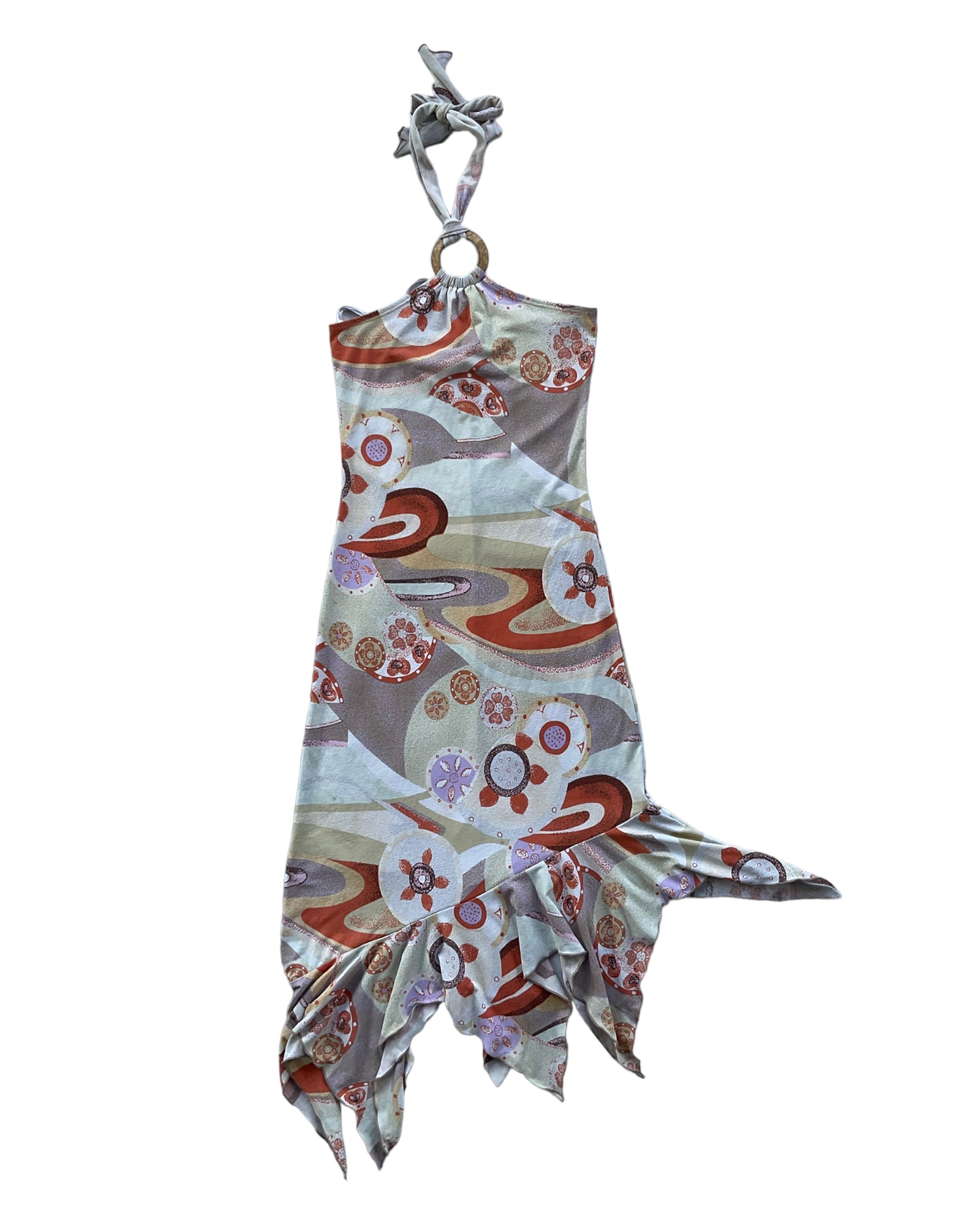 VESTIDO MIDI SIN MANGAS CON ESTAMPADO DE COLORES NARANJA, BLANCO, VERDE CLARO Y CAFÉ, ESPALDA ABIERTA, AMARRE TIPO BIKINI EN EL CUELLO, CÍRCULO CAFÉ EN EL CUELLO. 90% POLIÉSTER, 10% ELASTANO