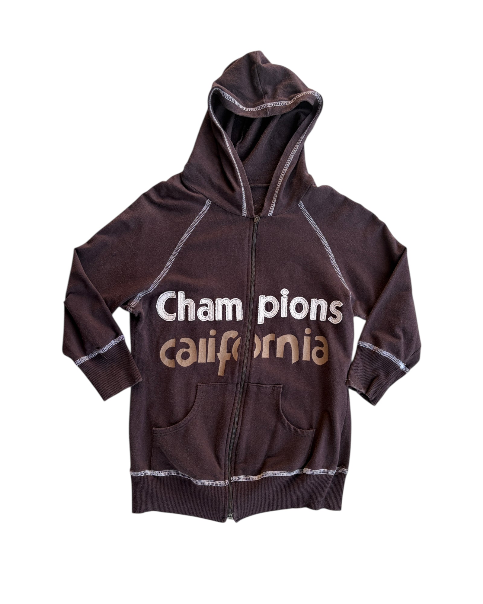 CHAMARRA ZIP UP CAFE CON COSTURAS EN COLOR BLANCO Y LETRAS BORDADAS "CHAMPIONS" EN COLOR BEIGE Y PRINT EN COLOR CAFE "CALIFORNIA". CAPUCHA INCLUIDA. 97% ALGODON Y 3% ELASTANO. NO TIENE DETALLES, EN PERFECTAS CONDICIONES.