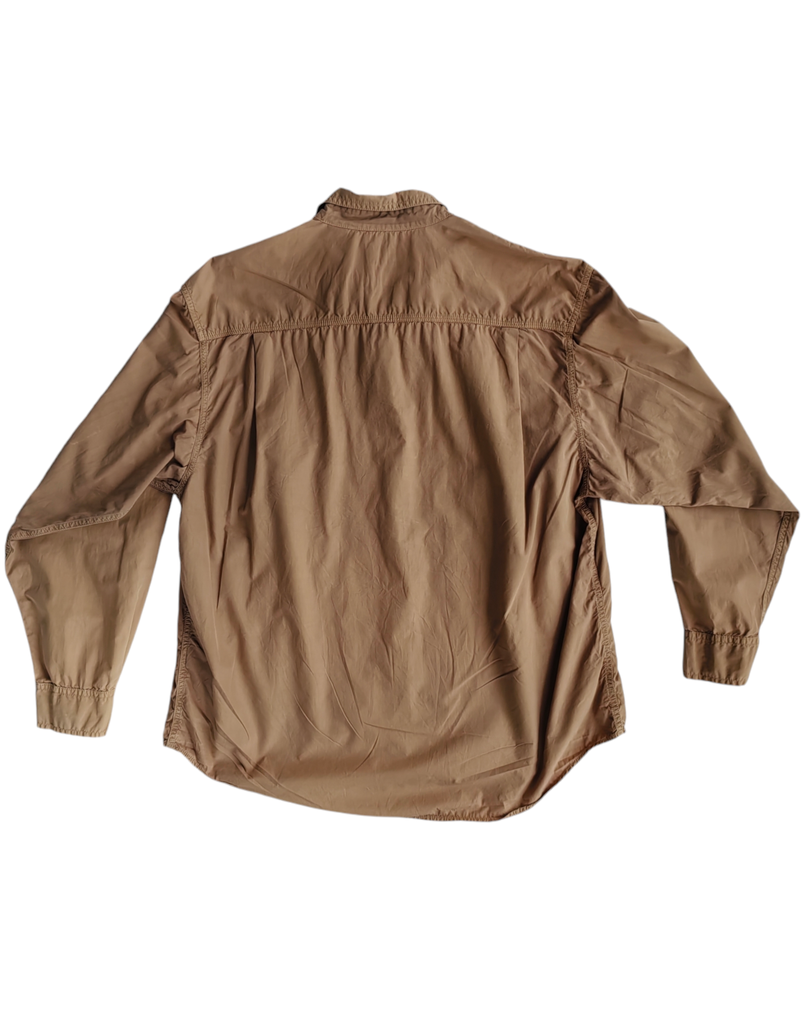 CAMISA MANGA LARGA DE BOTONES 100% ALGODÓN DE COLOR CAQUI, 6 BOTONES FRONTALES Y 1 DE REPUESTO, DOS BOLSILLOS FRONTALES CON BOTÓN, PUÑOS AJUSTABLES CON 2 BOTONES, PARCHE CON LOGO DE LA MARCA BORDADO SOBRE EL BOLSILLO DERECHO. LIGERA MANCHA POR DECOLORACIÓN EN LA MANGA IZQUIERDA.