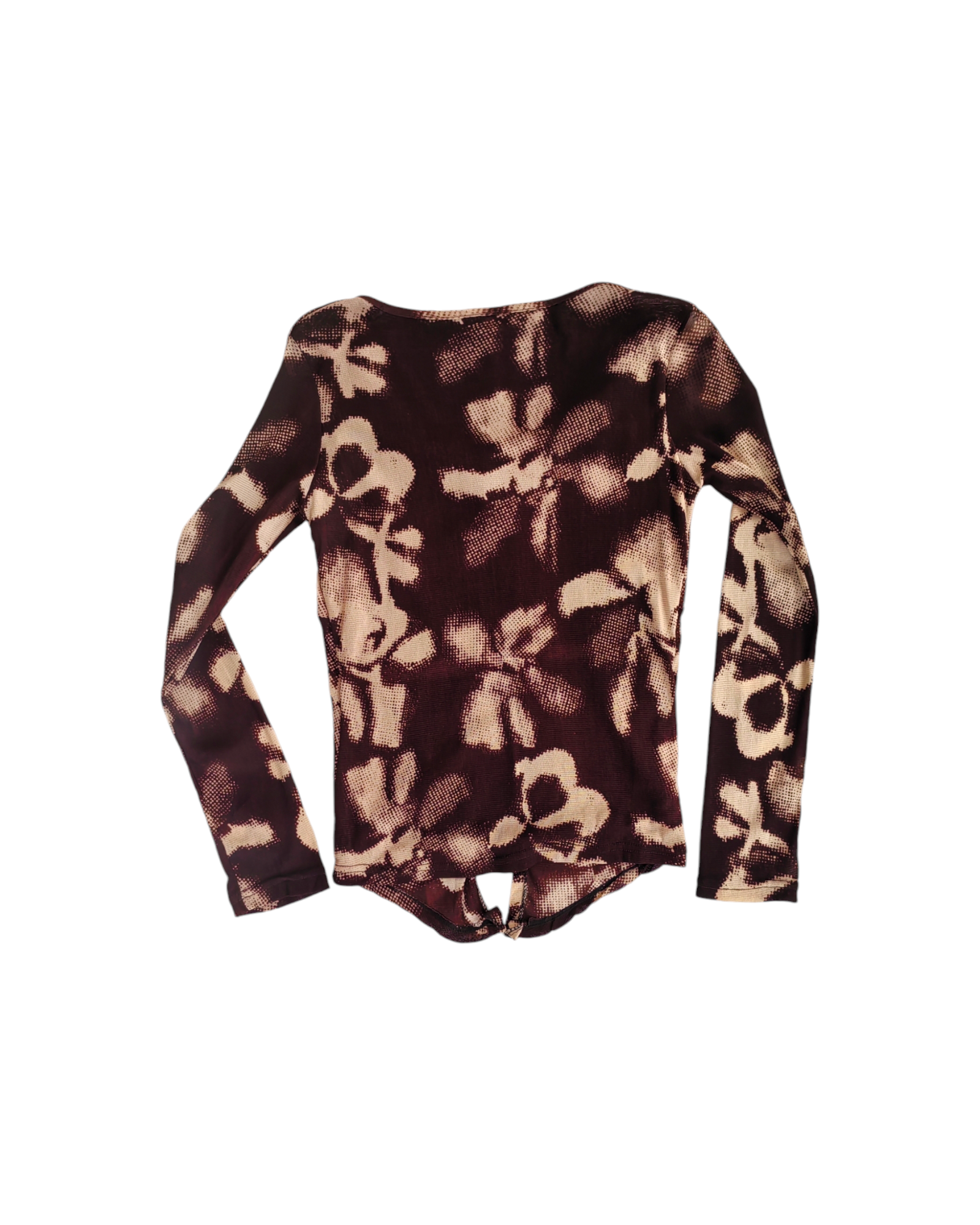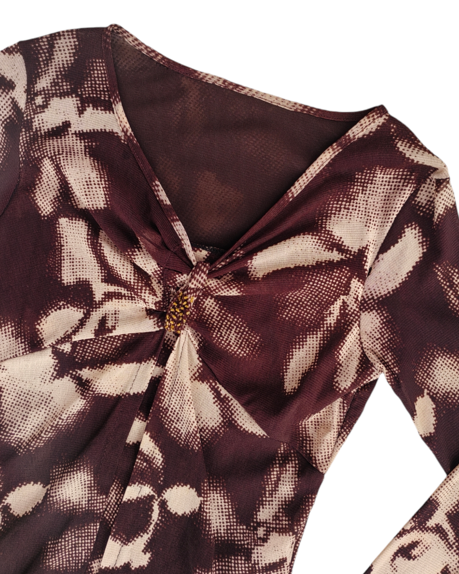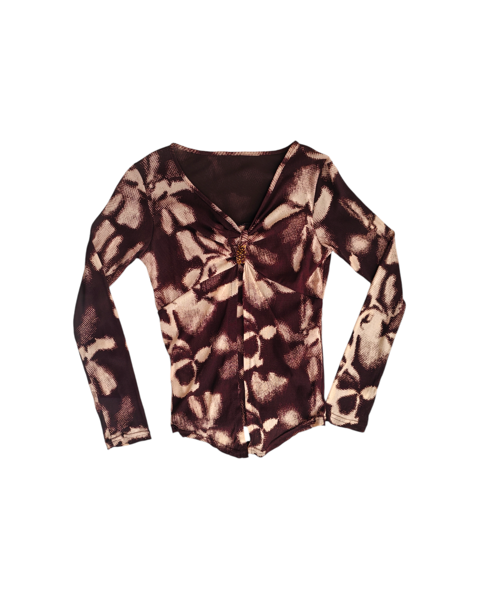 TOP DE MESH CON ESCOTE EN V, DETALLE DE PEDRERÍA EN EL ESCOTE. ESTAMPADO BEIGE CON CAFÉ OSCURO ESTILO MANCHADO. SIN DETALLES DE USO.