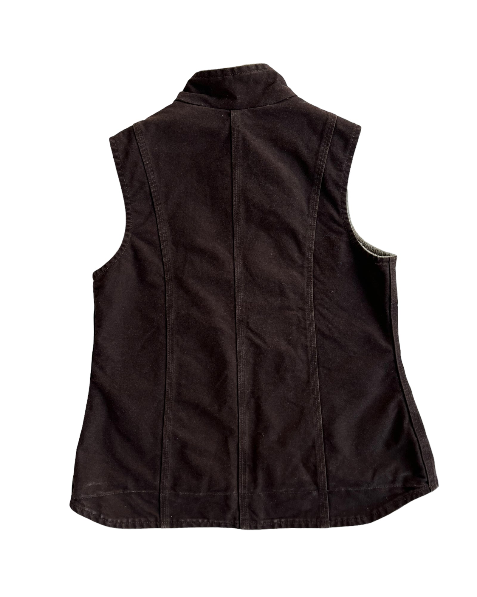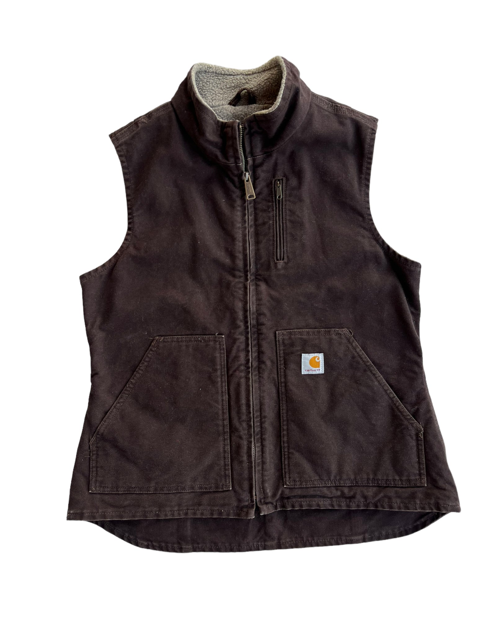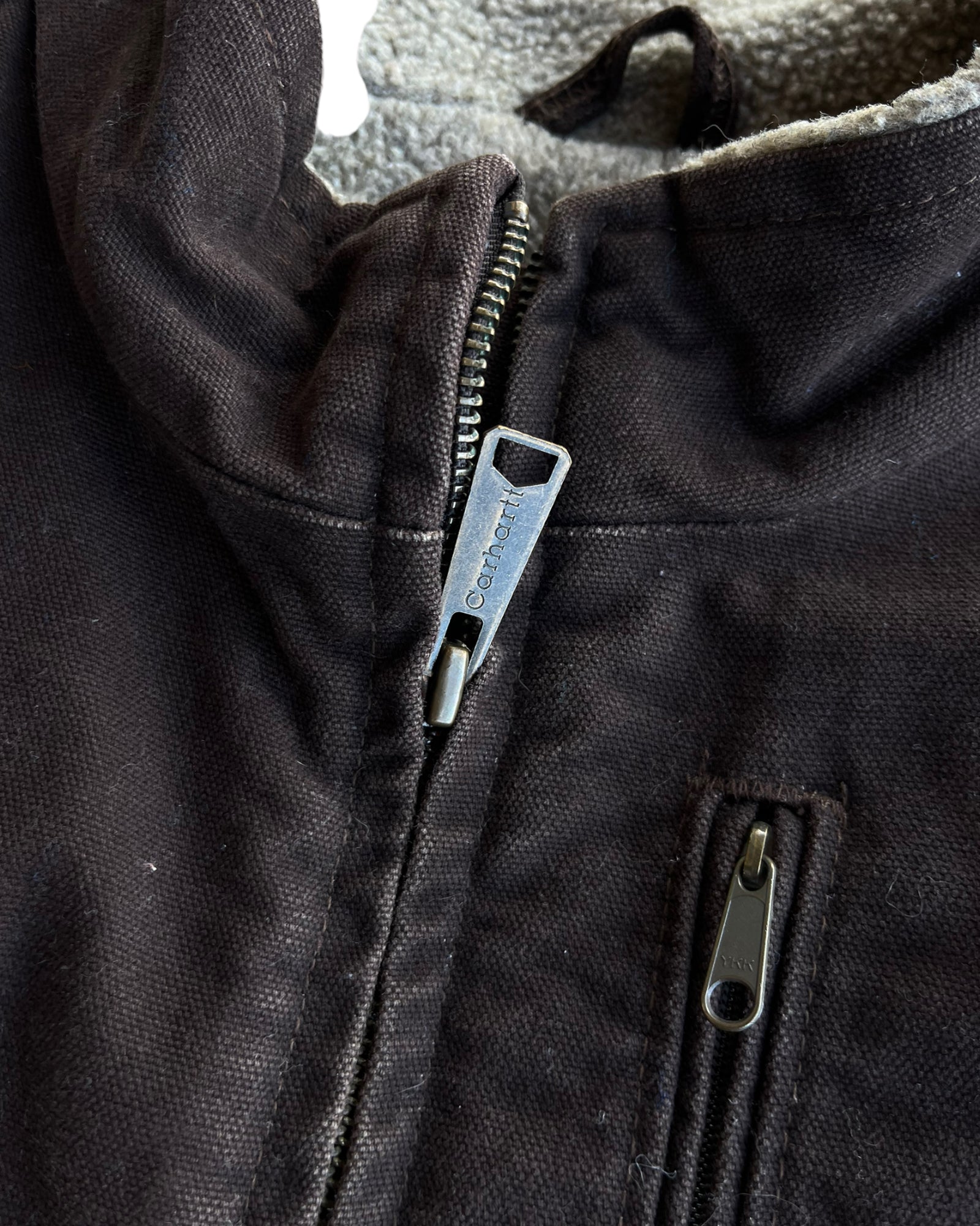 CHALECO CARTHARTT AISLANTE FIRE PROFF COLOR CAFÉ OSCURO, 100% ALGODÓN, 3 BOLSILLOS FRONTALES Y 2 INTERIORES. INTERIOR DE BORREGUITO 55% POLIÉSTER 45% ACRÍLICO. SIN DETALLES DE USO.