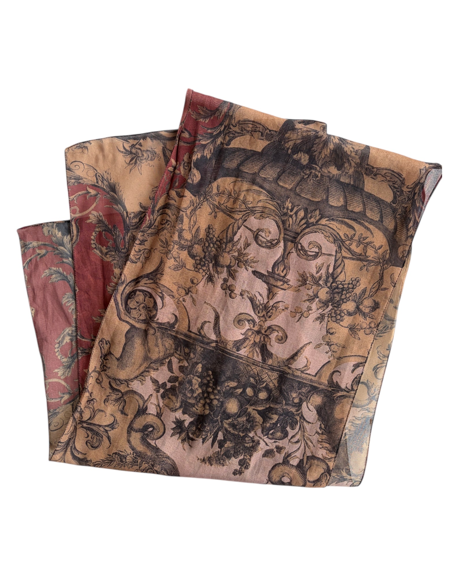 PASHMINA CON PRINT VINTAGE DE FUENTE Y REPISAS CON CANASTAS DE FRUTASEN COLOR BEIGE Y NEGRO CON DETALLES EN ROJO, PRINT ÚNICO Y SE PUEDE USAR COMO ACCESORIO DEL CABELLO. NO TIENE DETALLES, EN PERFECTAS CONDICIONES.