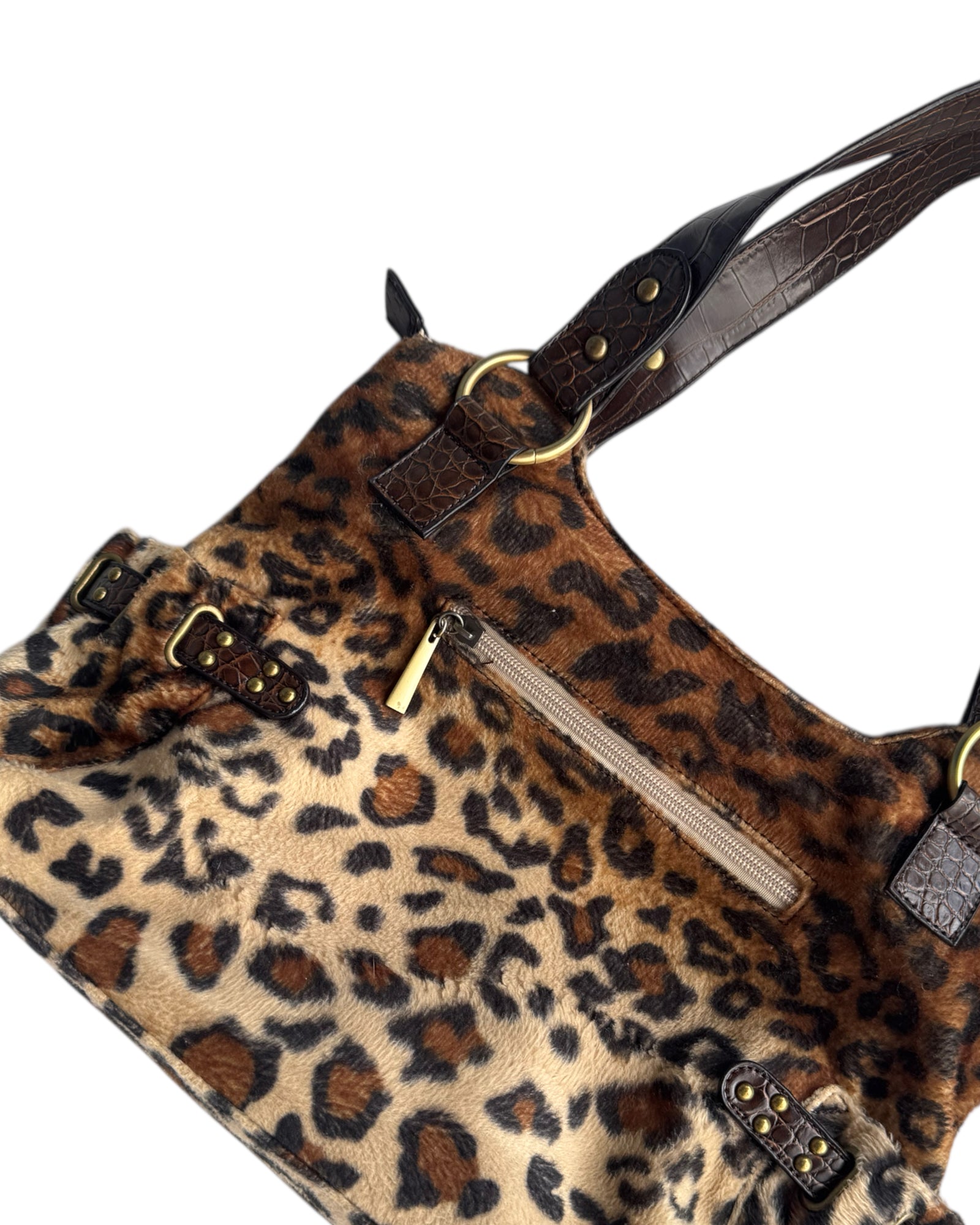 BOLSA ESTAMPADO ANIMAL PRINT DE CHEETAH CON TEXTURA DE PELUCHE, BOLSILLO DELANTERO Y A LOS LADOS CON ELASTICO. ASAS Y DETALLES EN CAFE Y ESTOPEROLES Y HARDWEAR EN DORADO, NO TIENE DETALLES, EN PERFECTO ESTADO.