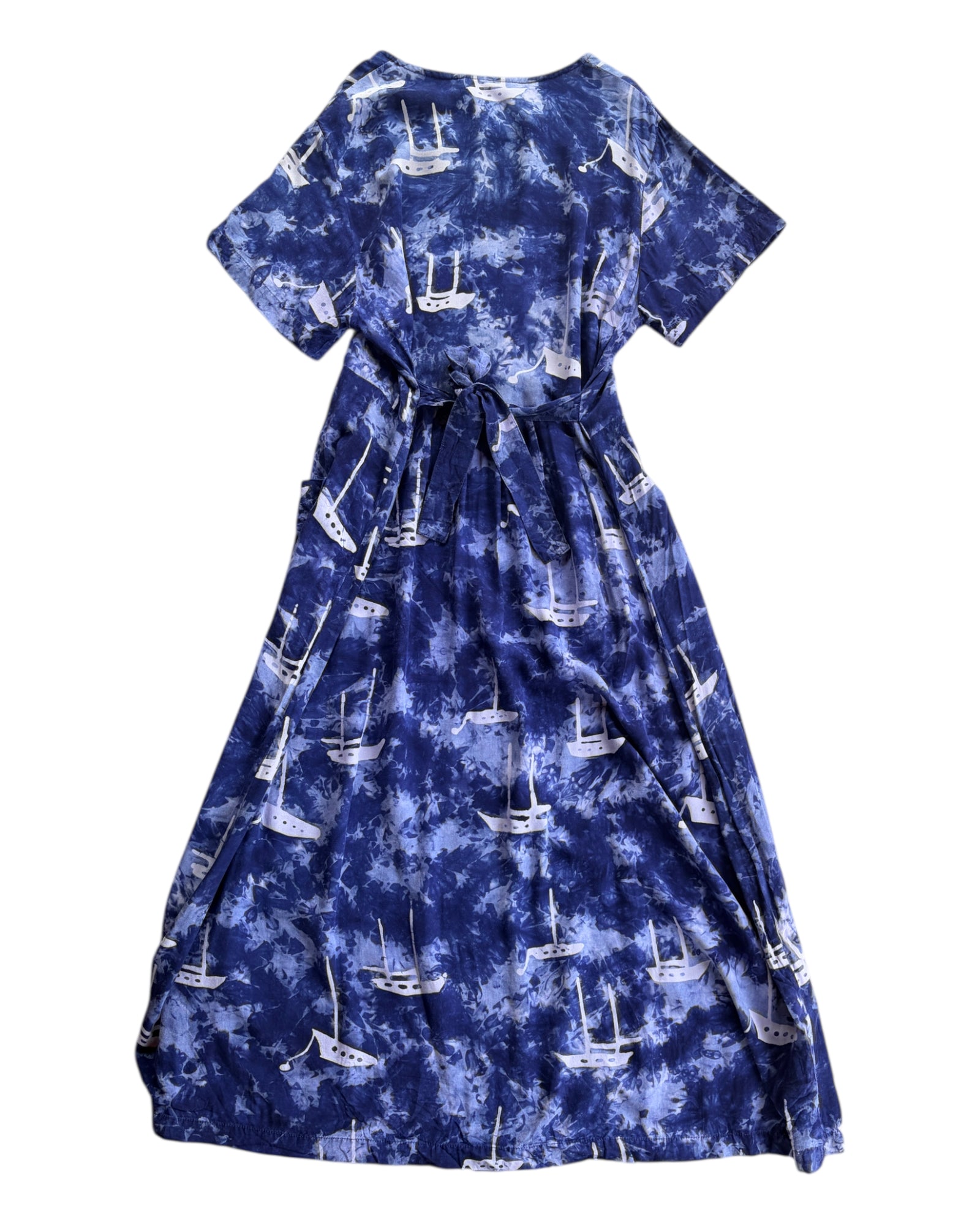 VESTIDO AZUL ESTILO TIE DYE CON PRINT DE BARCOS EN COLOR BLANCO, MANGA CORTA ESTILO PLAYERO, MUY CÓMODO Y CON BOLSILLOS INCLUIDOS FUNCIONALES. SIN DETALLES. EN MUY BUENAS CONDICIONES. 100% RAYÓN