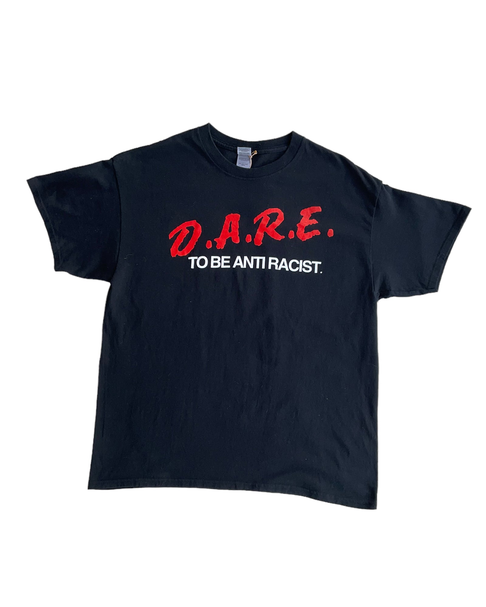 CAMISA 100% ALGODÓN COLOR NEGRO CON ESTAMPADO "DARE TO BE ANTIRACIST" EN COLOR ROJO Y BLANCO EN LA PARTE CENTRAL. SIN DETALLES DE USO.