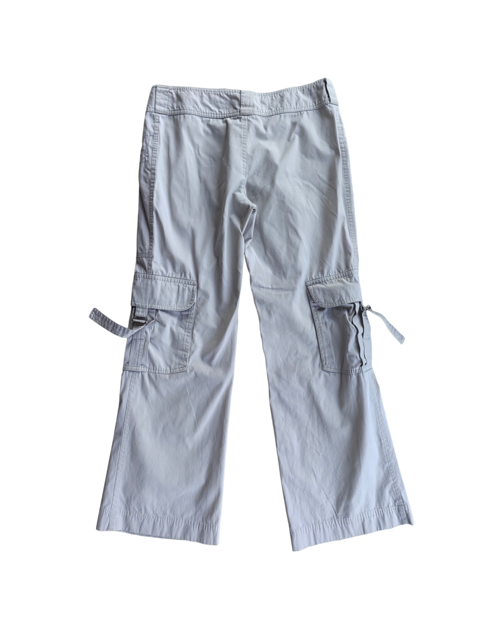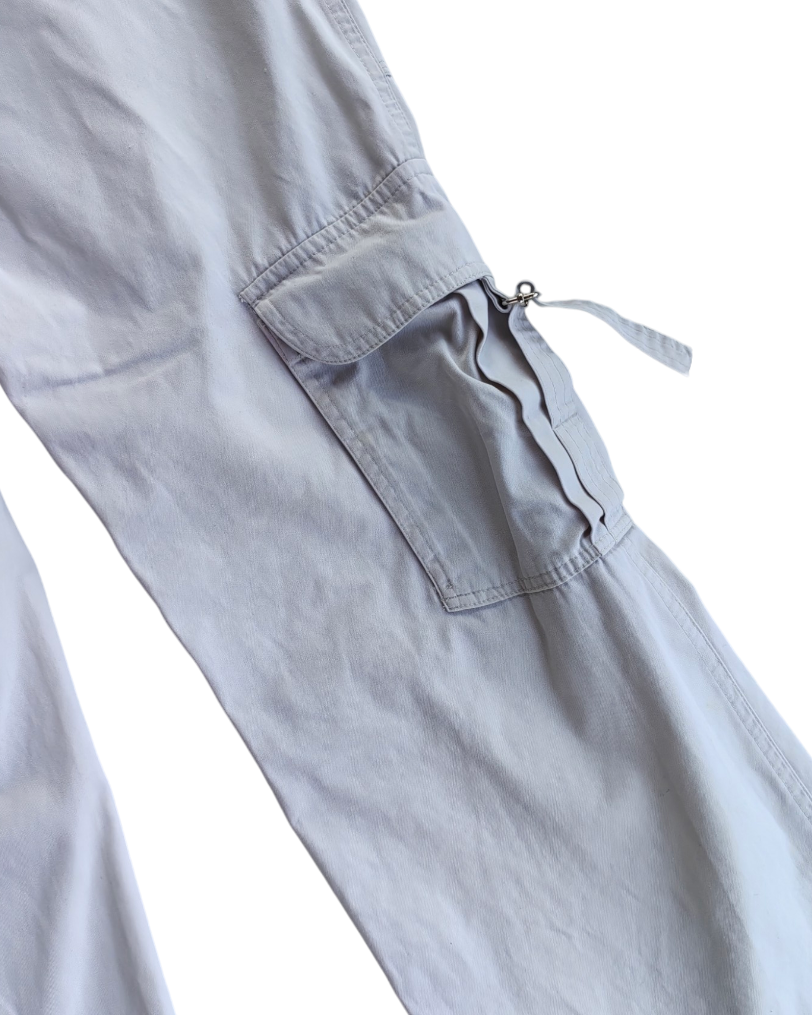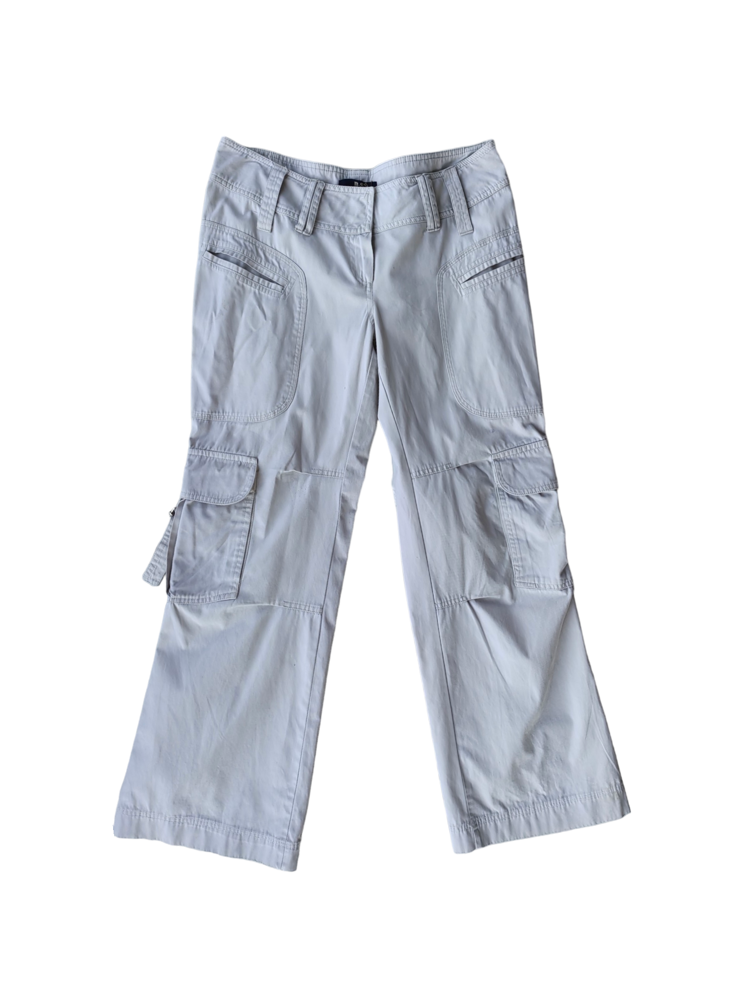 PANTALONES 100% ALGODÓN TIPO CARGO DE TIRO BAJO DE COLOR HUESO, 4 BOLSILLO FRONTALES, CIERRE FRONTAL CON BROCHE . SIN DETALLES DE USO