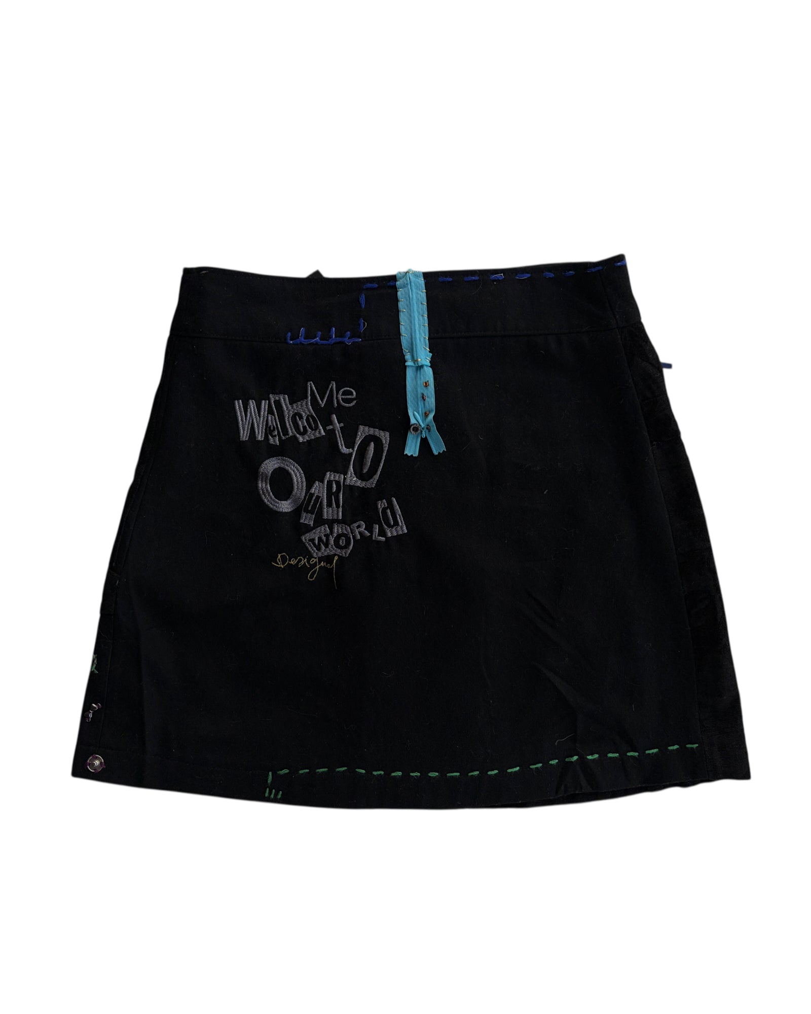 FALDA DESIGUAL ALGODON EN COLOR NEGRO CON ESTAMPADO DE LETRAS WATCH ME WORLD Y DETALLES DE BORDADOS COLORIDOS PERLAS Y REMACHES.