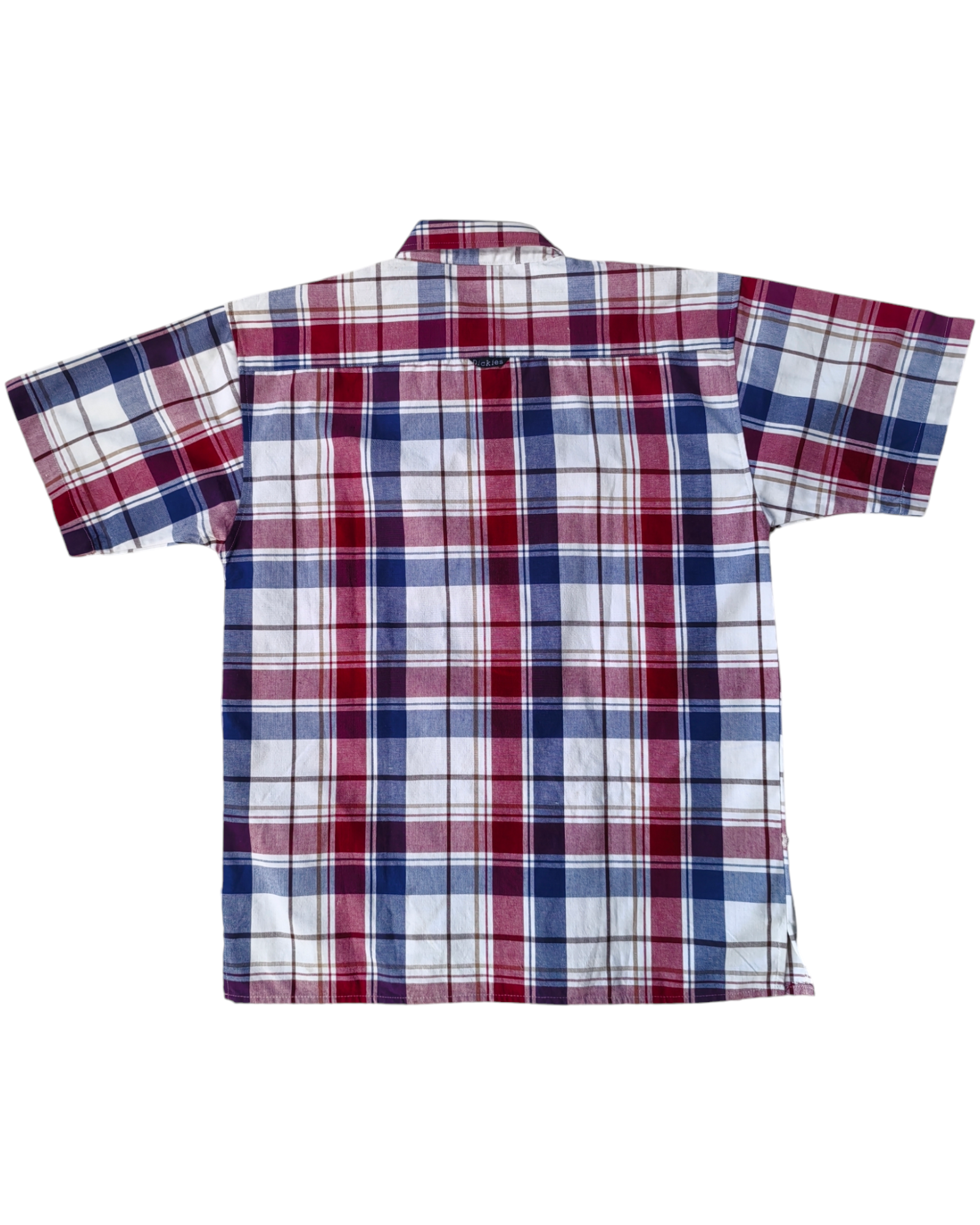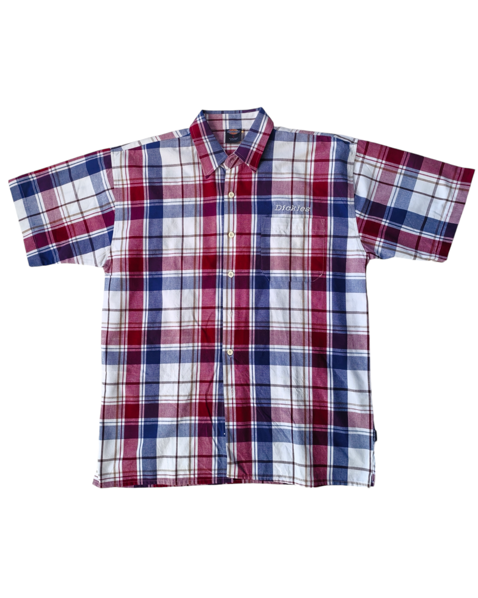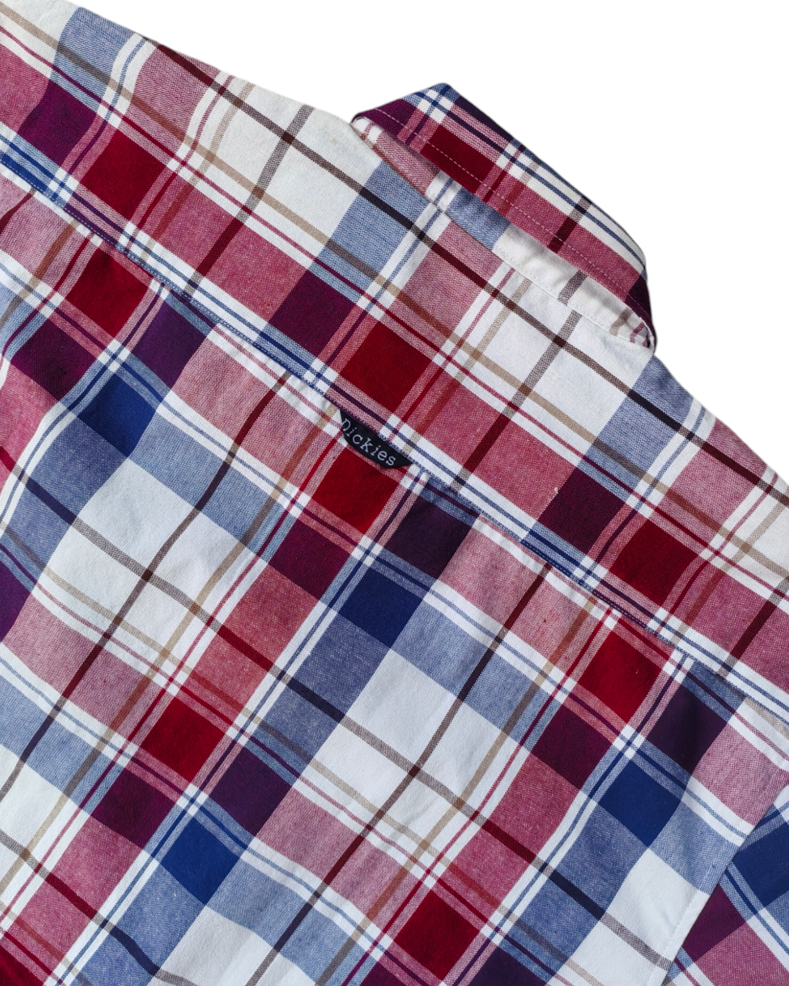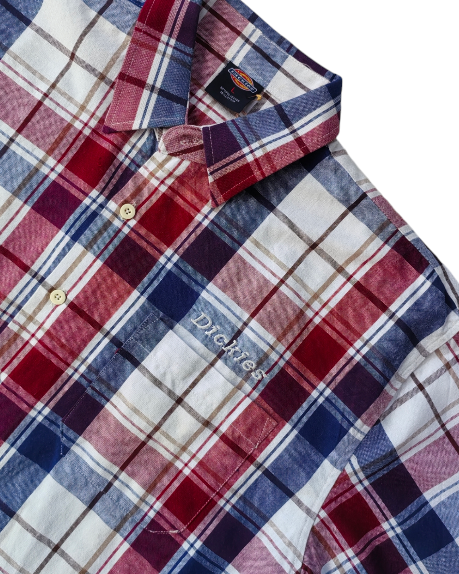 CAMISA MANGA LARGA 65% POLIÉSTER 35% ALGODÓN, BOLSILLO DEL LADO IZQUIERDO Y BORDADO DE LETRAS DICKIES ENCIMA. PRINT DE CUADROS BLANCO, AZUL, ROJO Y CAFE. SIN DETALLES DE USO.