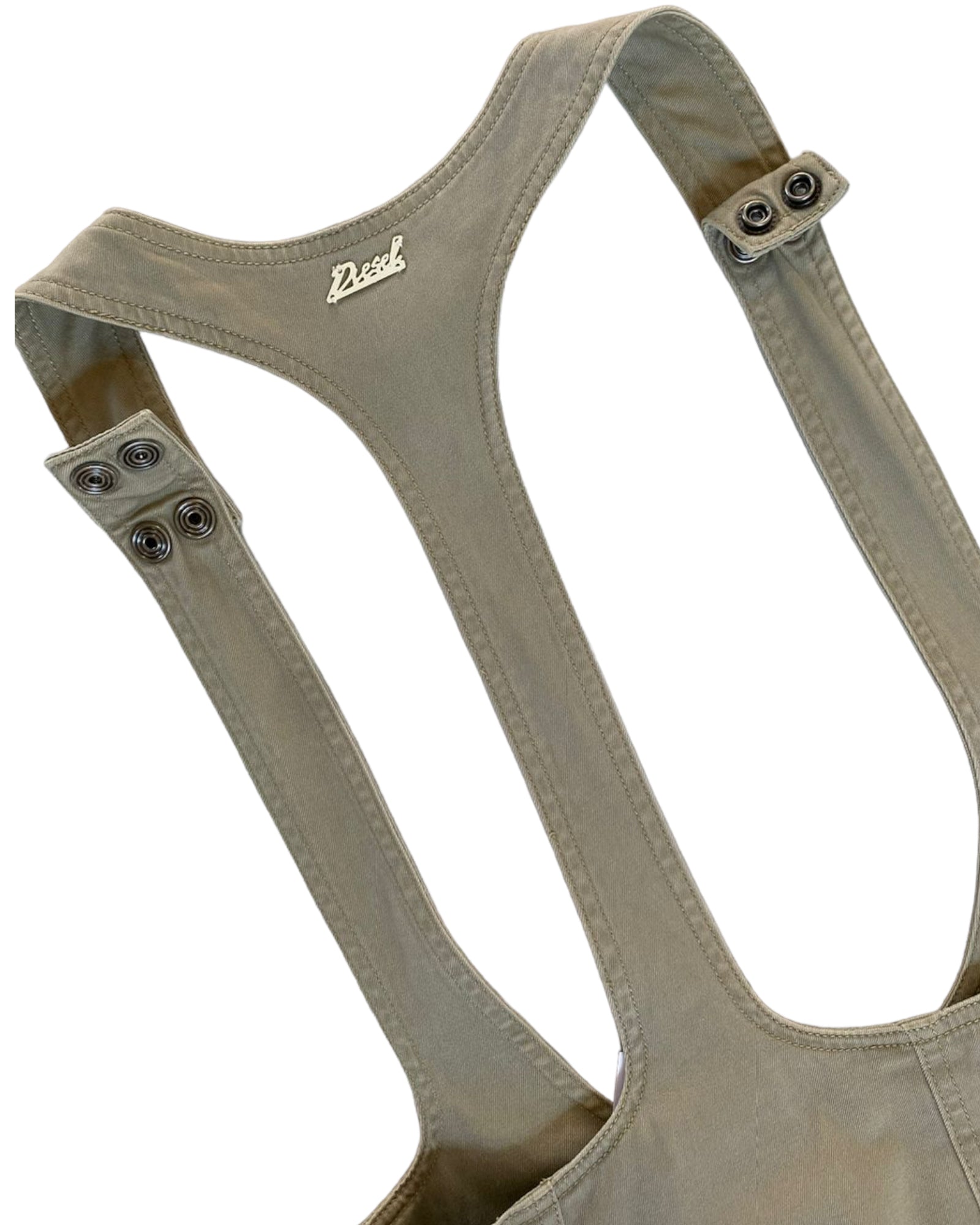OVEROL DE FALDA 99% ALGODÓN 1% ELASTANO, 5 BOTONES CENTRALES EN EL ÁREA DE LA CINTURA, 3 BOTONES INVISIBLES EN EL TIRO. TIRANTES DE BOTONES DE PRESIÓN. PLACA DE METAL CON LA PALABRA "DIESEL" EN CURSIVA. SIN DETALLES DE USO.
