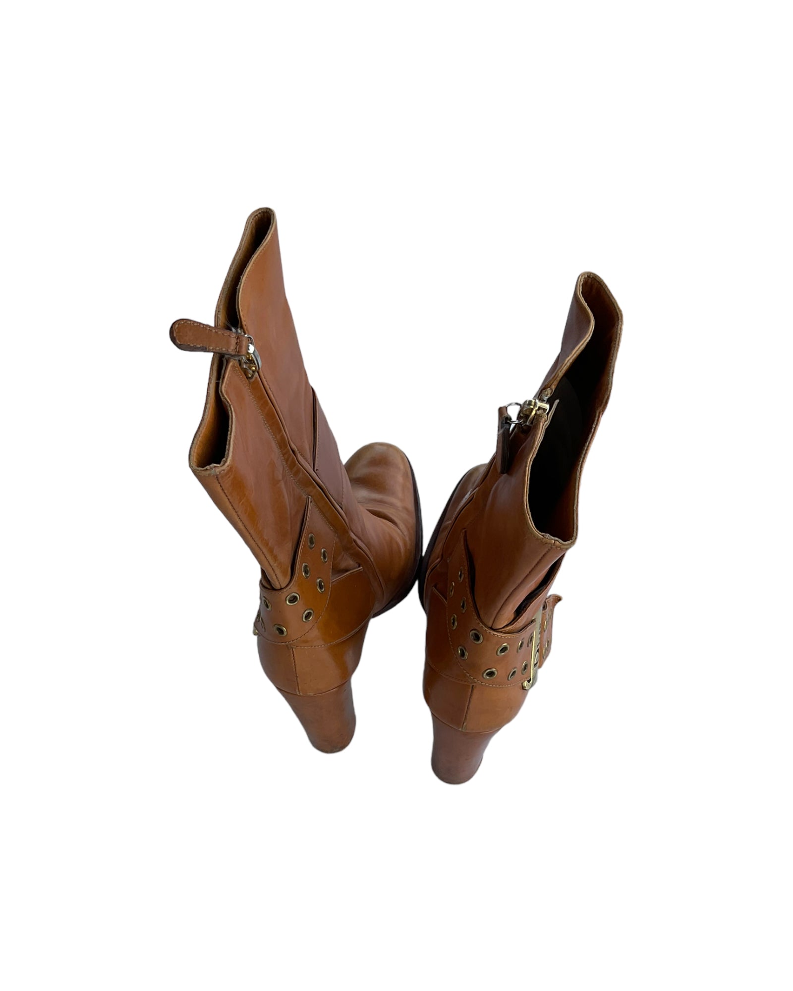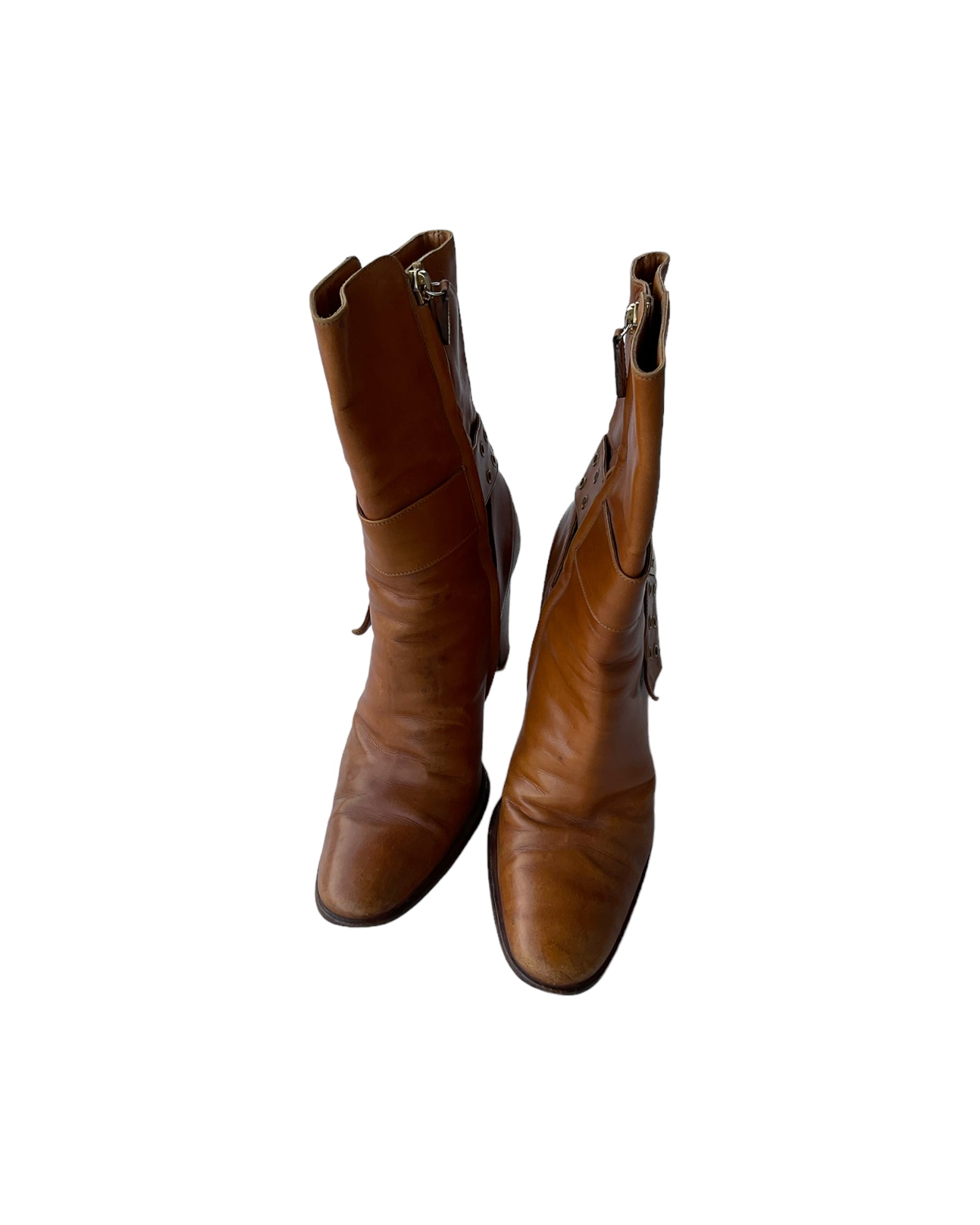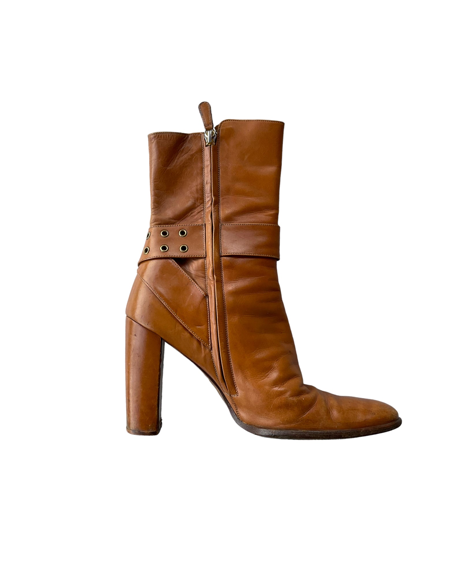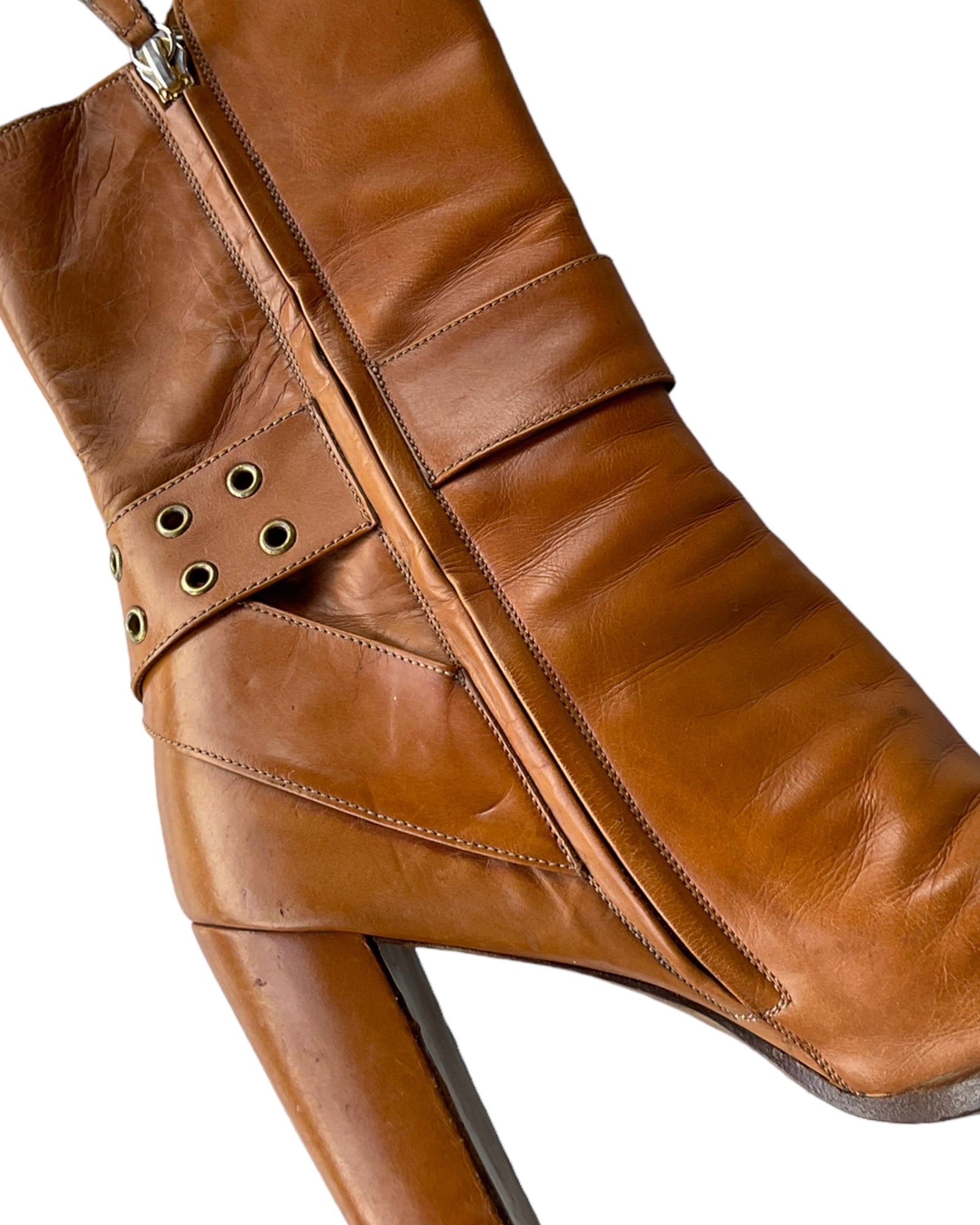 BOTAS DE TACÓN MARCA DIOR, COLOR CAFÉS, CON CINTURÓN CON REMACHES AL REDEDOR, CON TACÓN REDONDO EN FORMA DE PICO, 100% PIEL