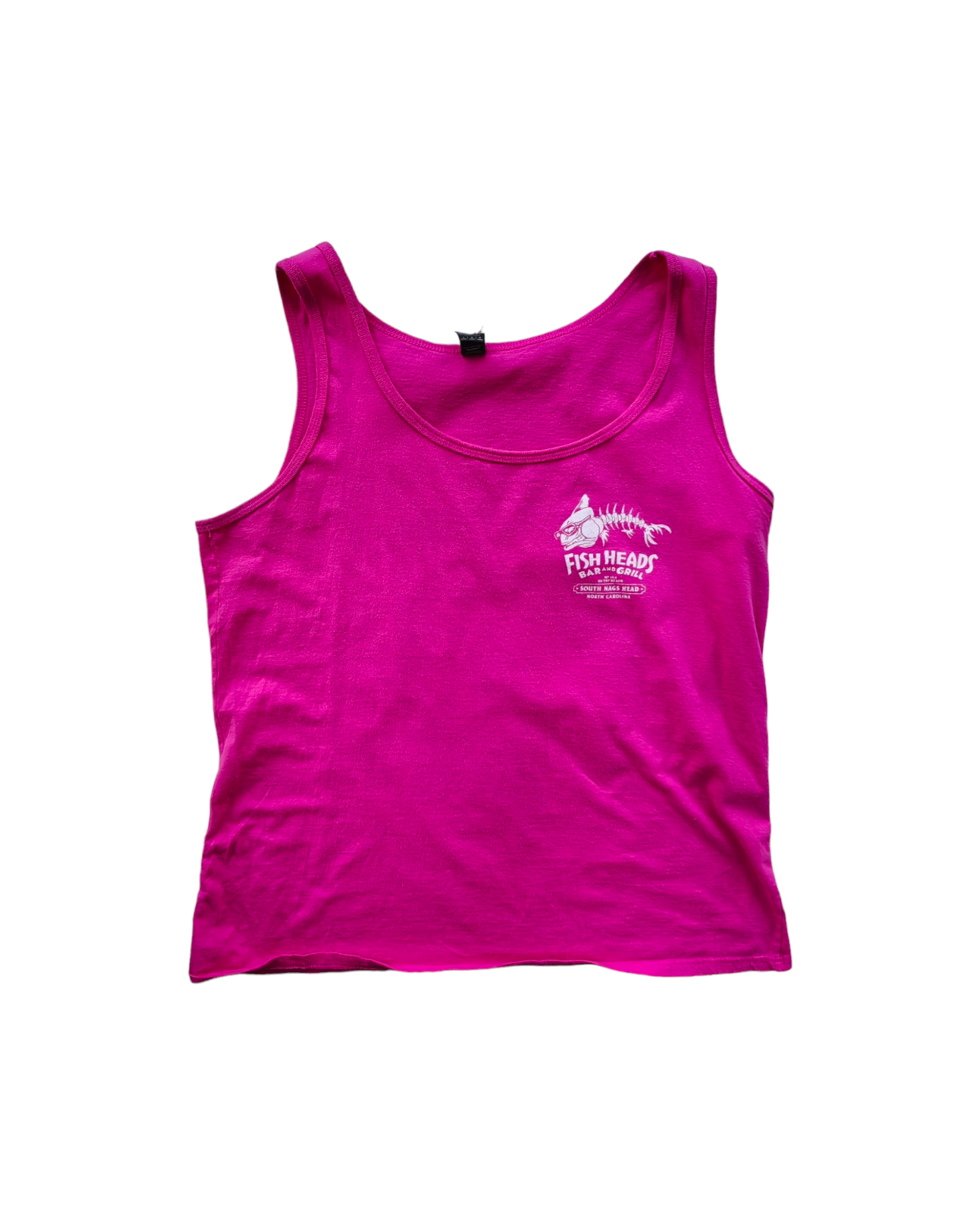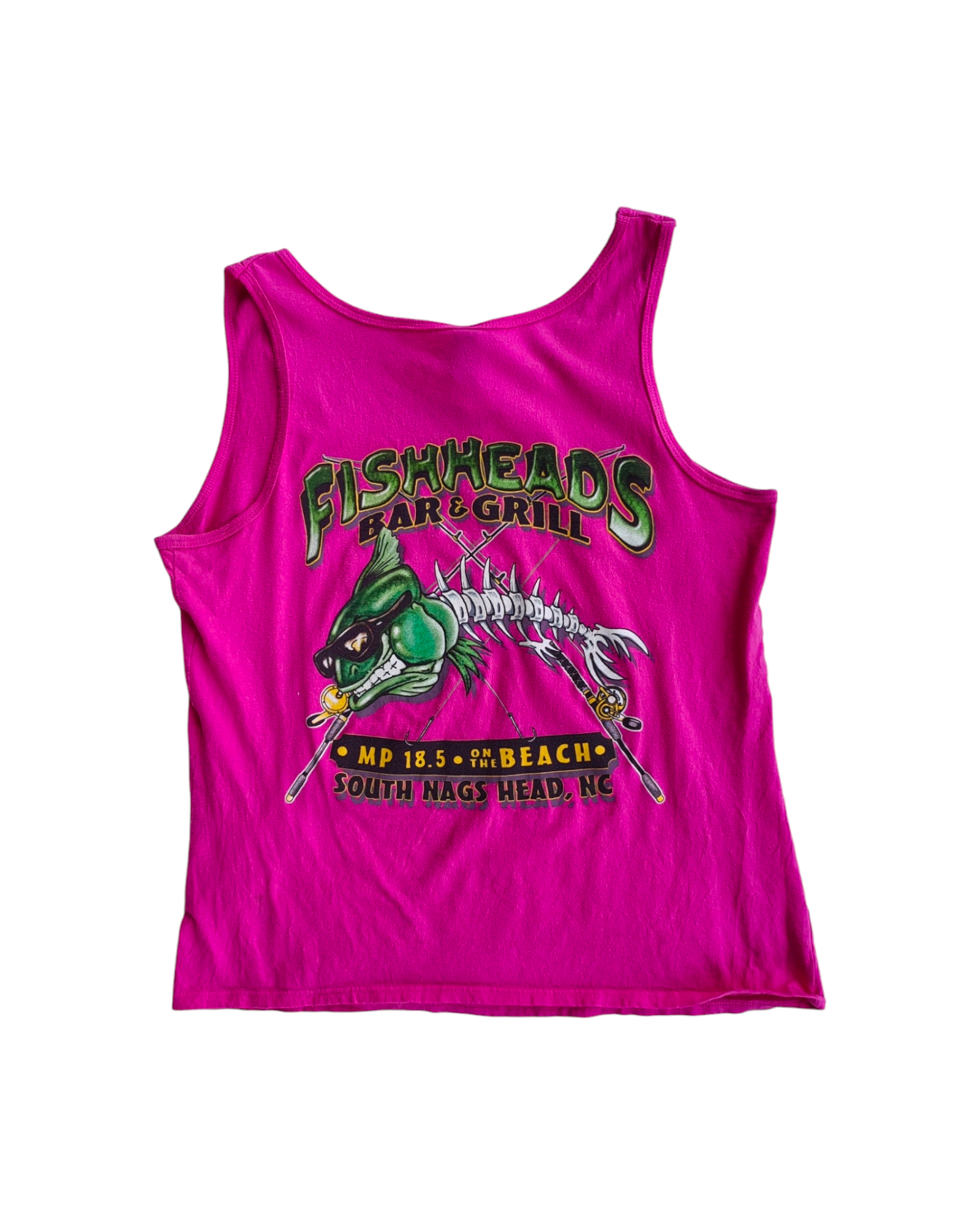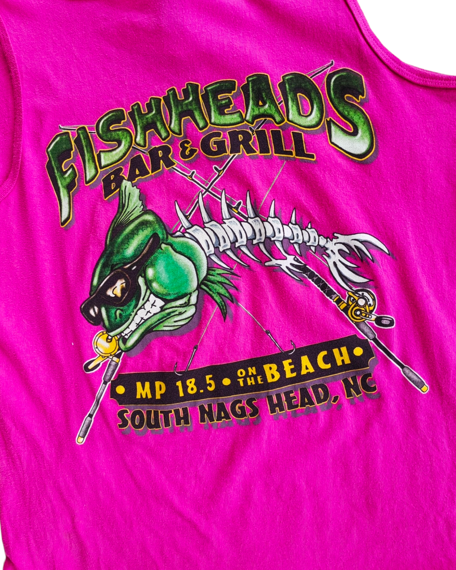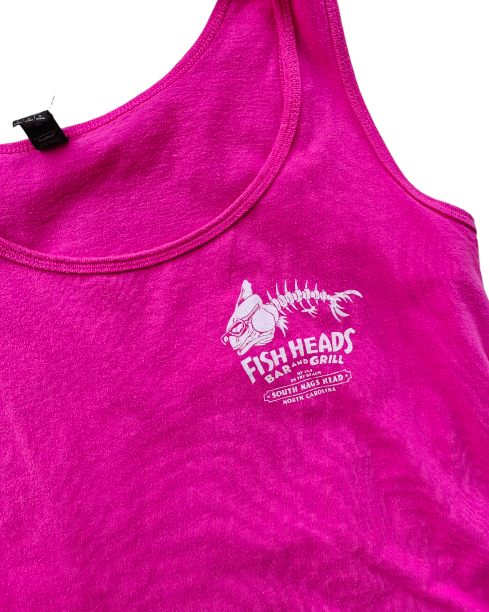 TANK TOP 100% ALGODÓN COLOR ROSA CON ESTAMPADO DE HUESOS DE PESCADO CON TEXTO EN BLANCO "FISH HEADS BAR AND GRILL, SOUTH NAGS HEAD, NORTH CAROLINA" Y DE COLORES VERDE, AMARILLO Y NEGRO EN LA ESPALDA. SIN DETALLES DE USO.