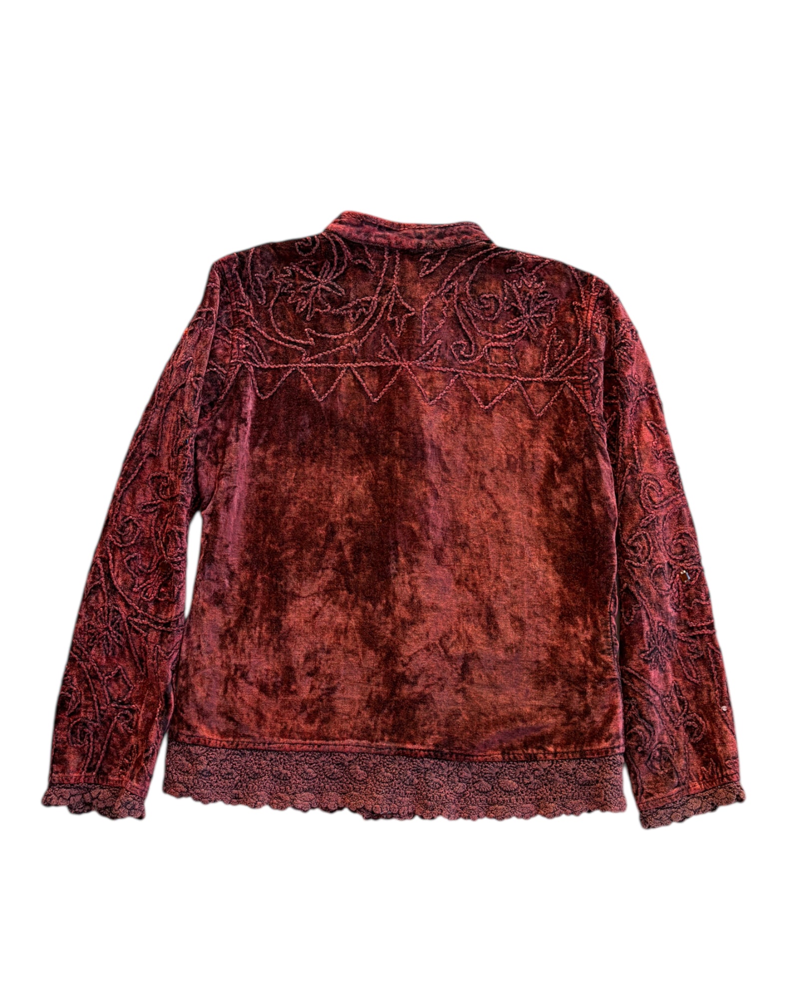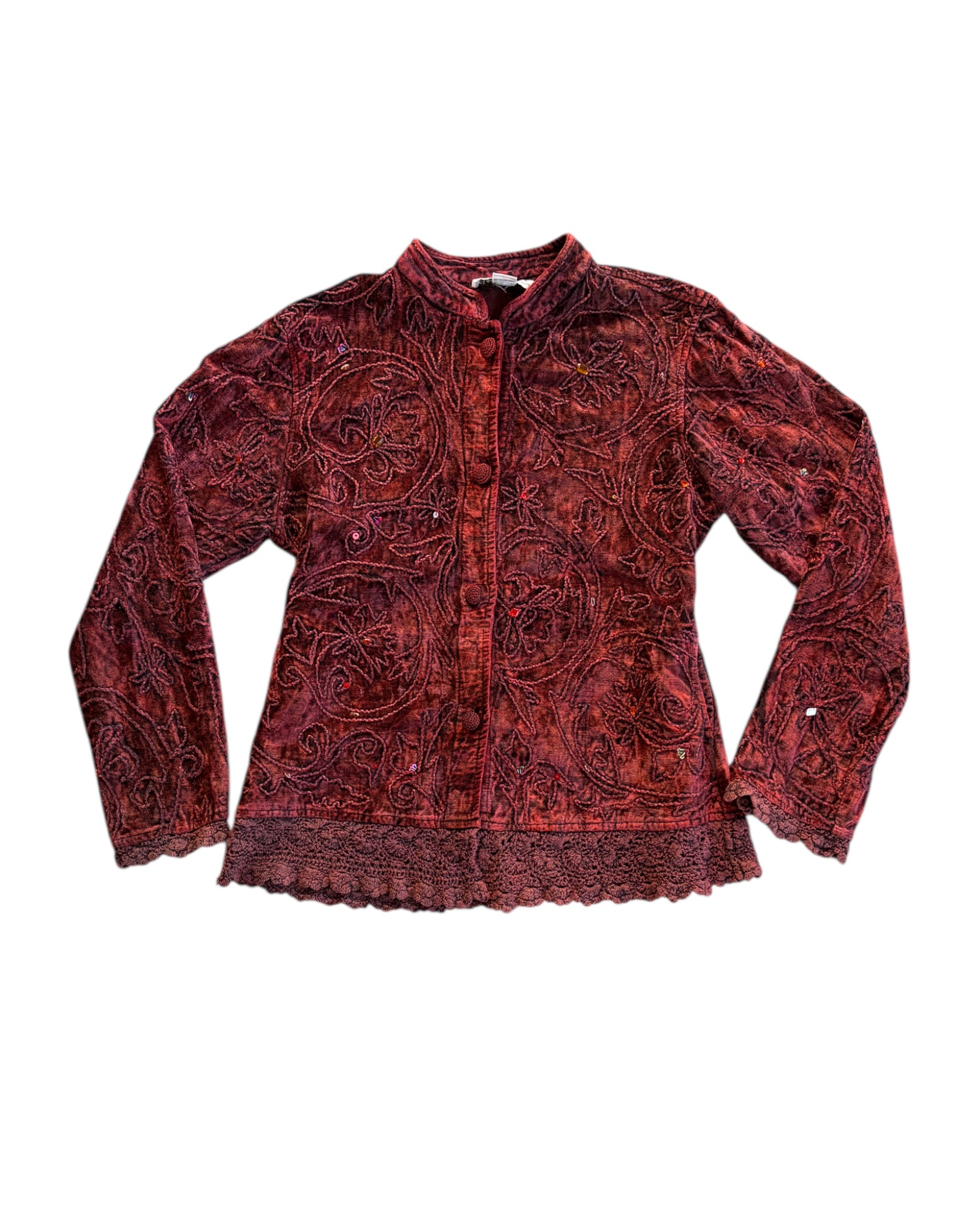 CHAMARRA DESLAVADA EN COLOR LADRILLO CON BORDADOS DE FLORES Y LENTEJUELAS Y CUENTAS POR TODA LA CHAMARRA. DOBLADILLO DE ENCAJE. 55% ALGODON Y 45% RAYON. NO TIENE DETALLES, EN PERFECTAS CONDICIONES.