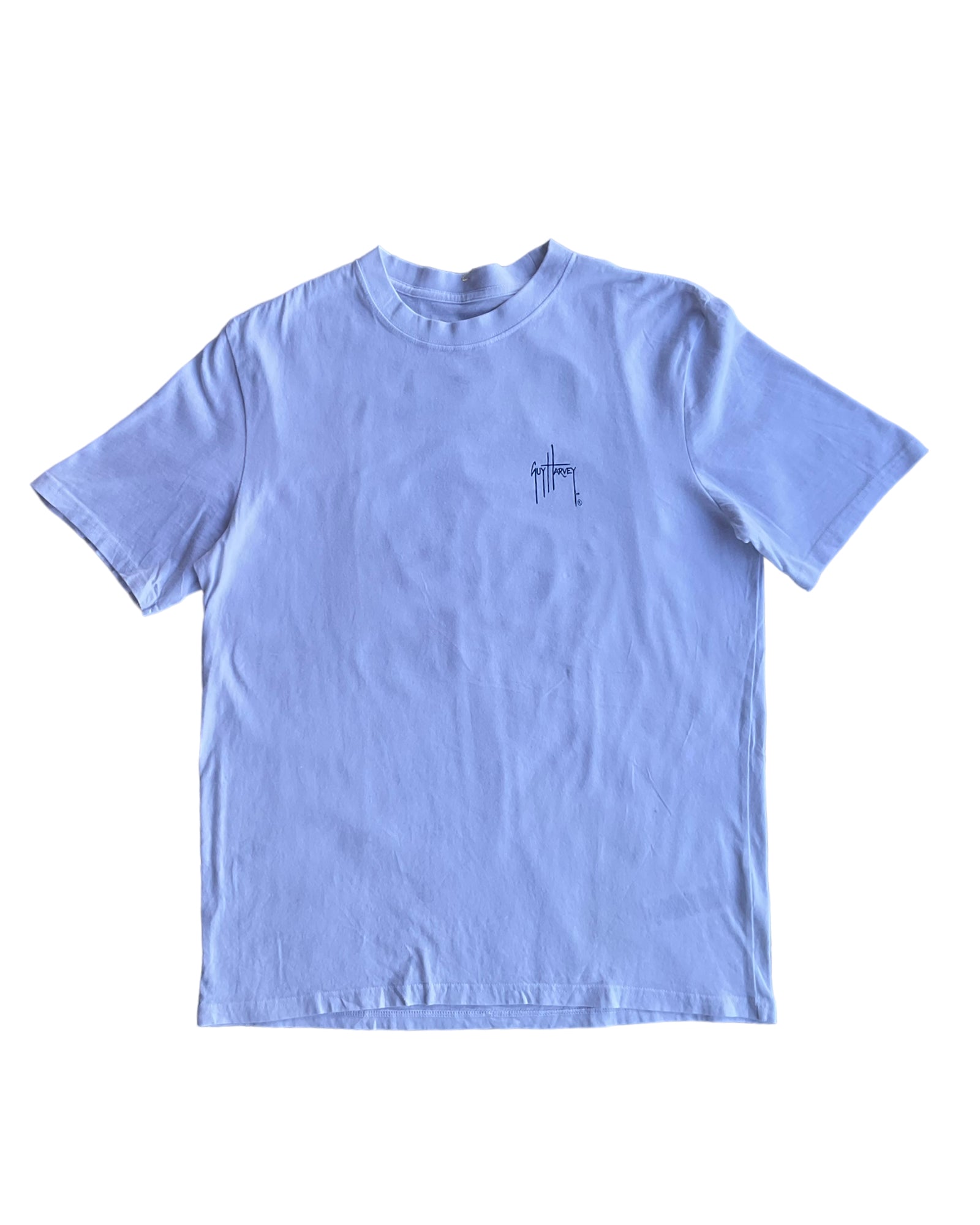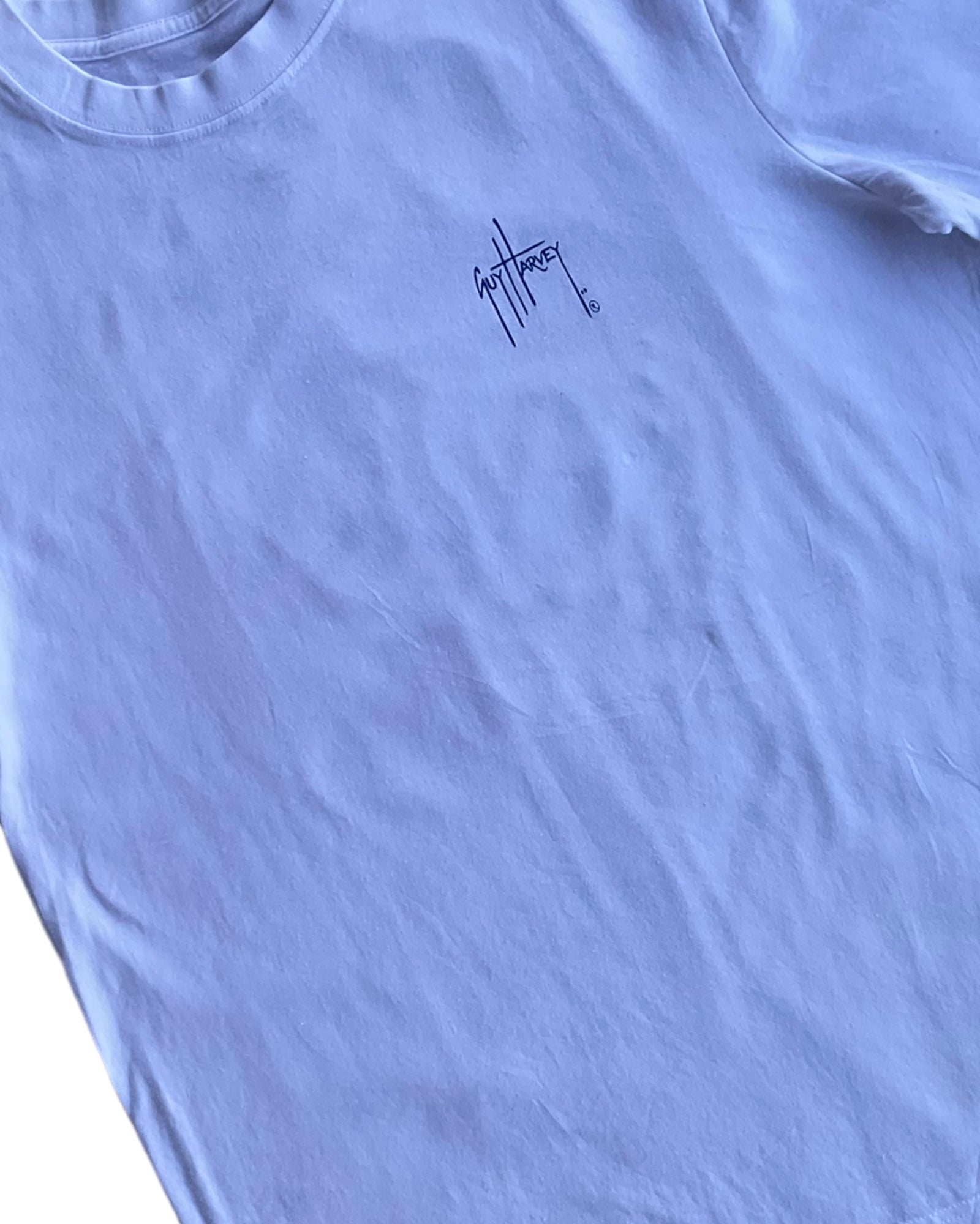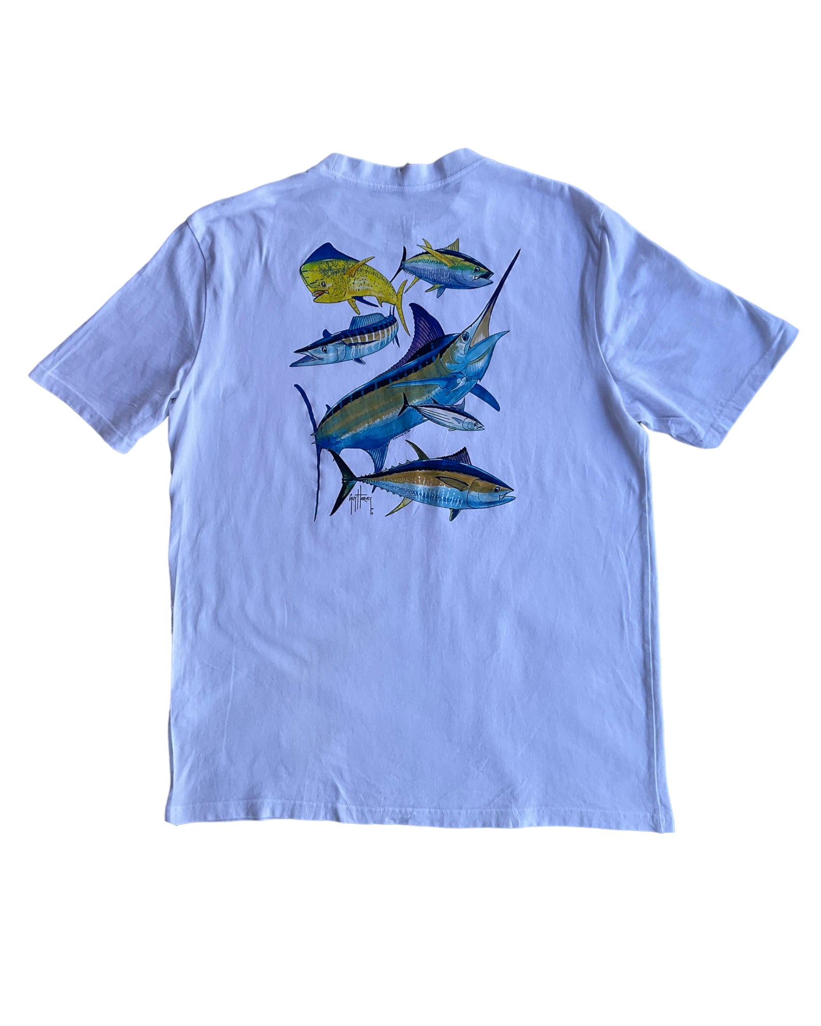 CAMISA 100% ALGODÓN COLOR BLANCO CON ESTAMPADO EN EL PECHO DEL LOGO DE GUY HARVEY Y ESTAMPADO TRASERO DE PECES DE COLORES AZUL, AMARILLO Y VERDE. SIN DETALLES DE USO.