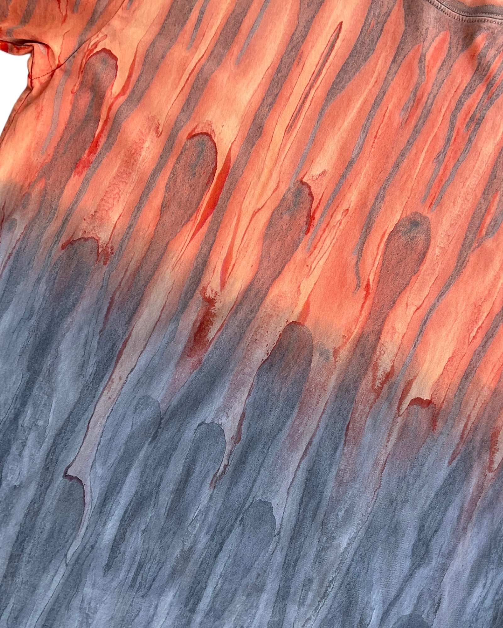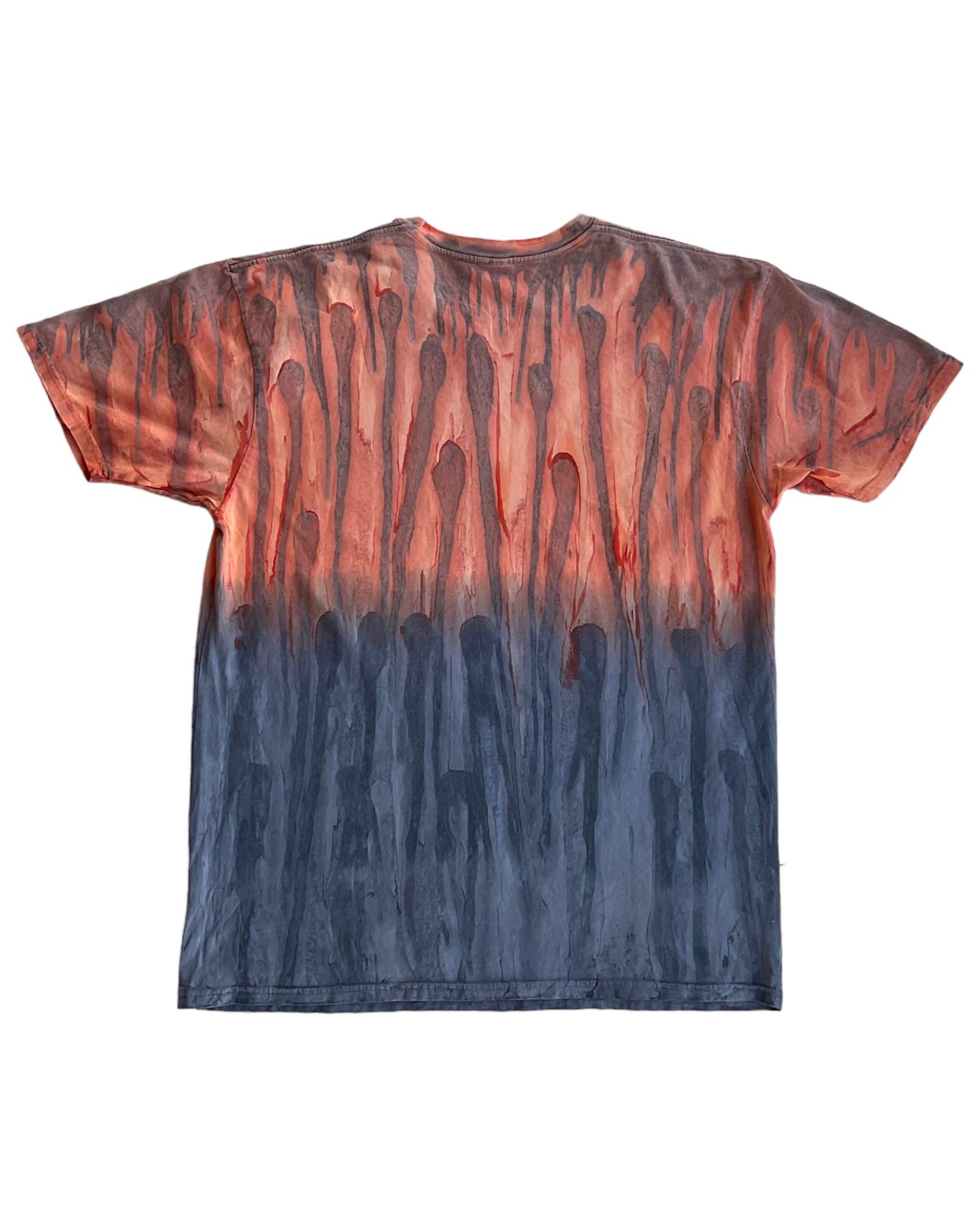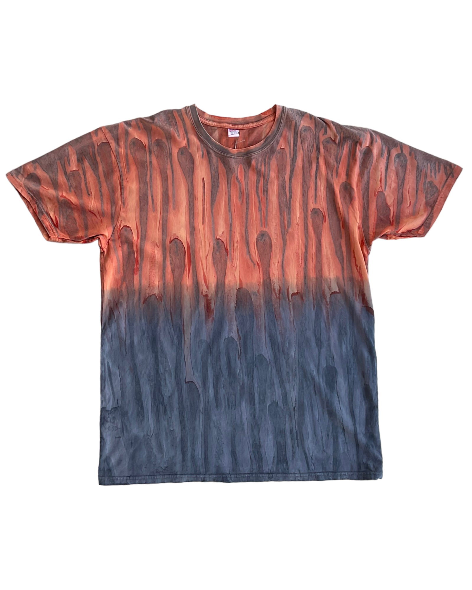 PLAYERA 100% ALGODÓN CON TIE DYE DEGRADADO EN COLORES NARANJA Y GRIS. SIN DETALLES DE USO.