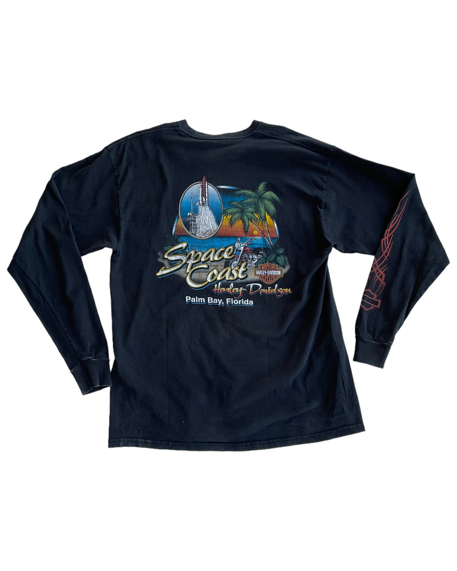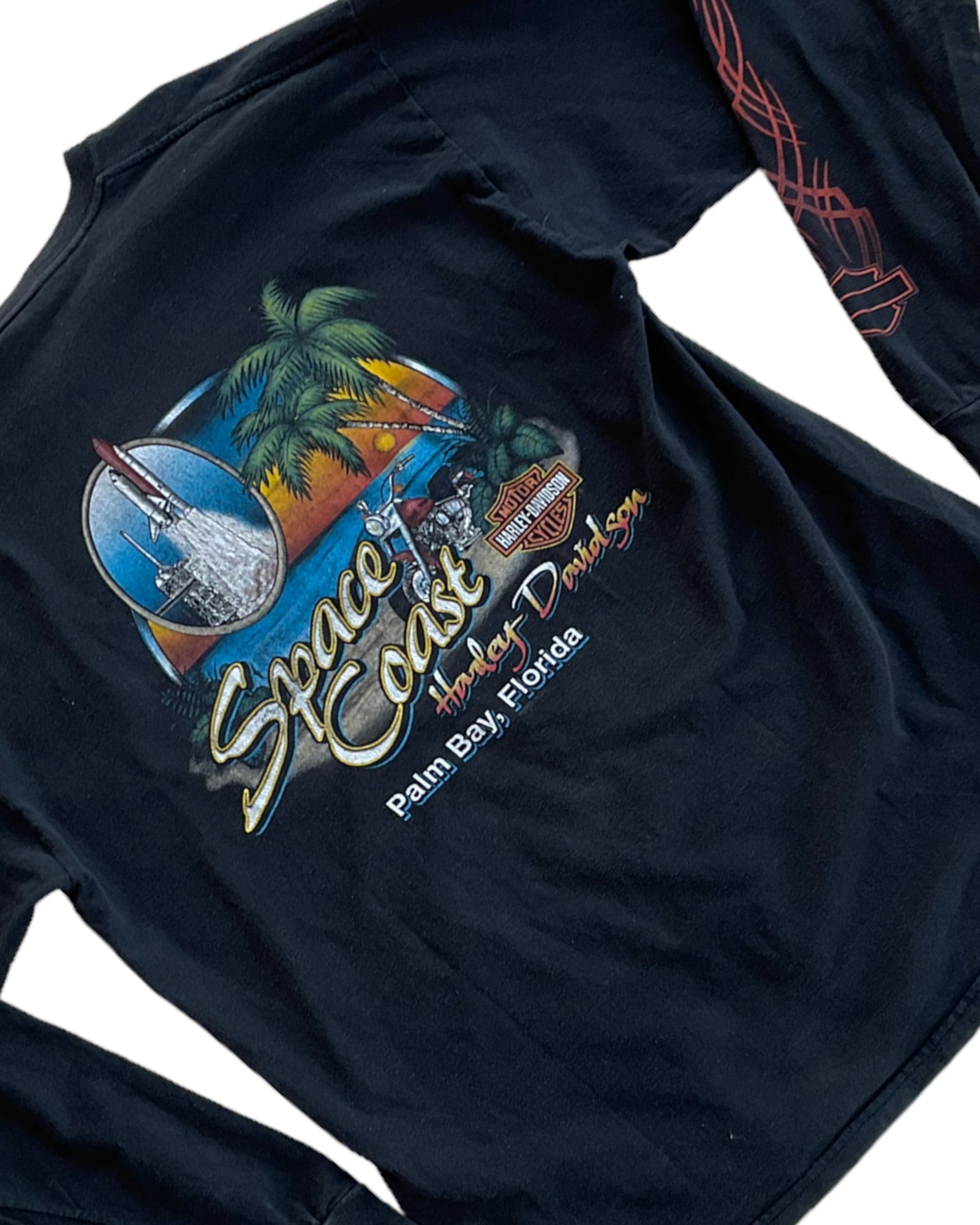 SUDADERA COLOR NEGRO 100% ALGODÓN CON ESTAMPADO DEL LOGO DE HARLEY DAVIDSON EN EL PECHO Y LAS MANGAS. ESTAMPADO EN LA ESPALDA DE UNA ESCENA PLAYERA EN LA PARTE DE LA ESPALDA CON LETRAS " SPACE COAST, HARKEY DAVIDSON. PALM BAY FLORIDA".