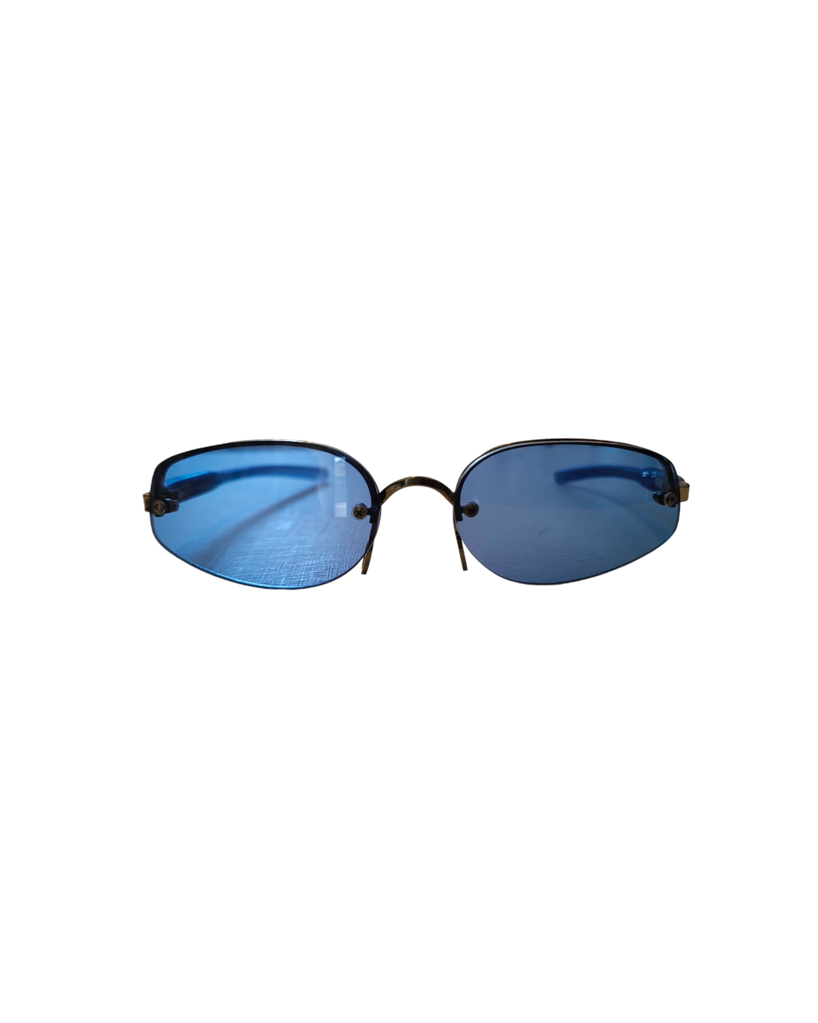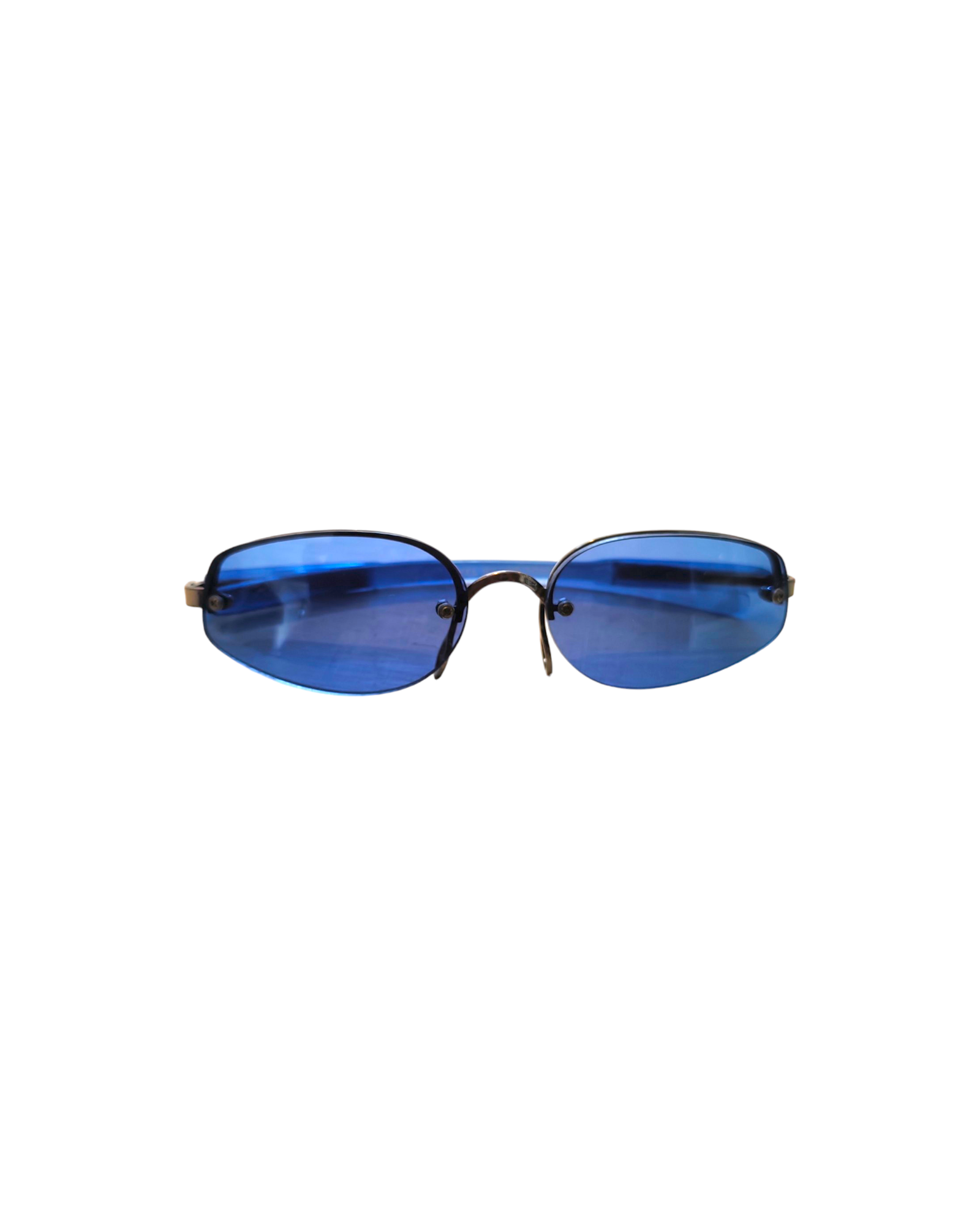 LENTES DE SOL CON PROTECCIÓN UV, ARMAZÓN INVISIBLE QUE VA DETRÁS DE LAS MICAS COLOR PLATEADAS, PATAS RECUBIERTAS DE GOMA AZUL REY. MICAS AZUL OSCURO. DISEÑO ITALIANO, ARMAZÓN DE NIKEL. SIN DETALLES DE USO